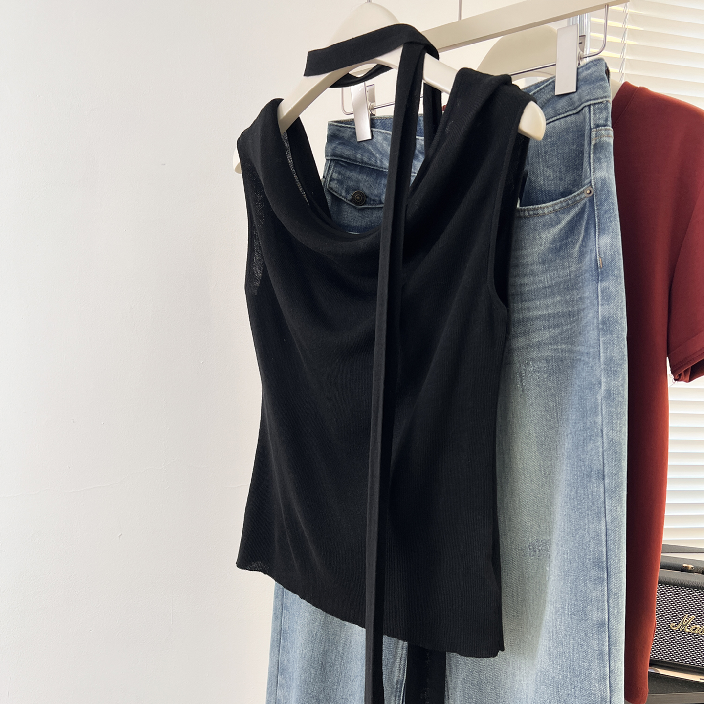 실사 정가 니트 캐미솔 2026 봄 고급 센스 오프숄더 몸매 가꾸기 행침 목 민소매 맨위