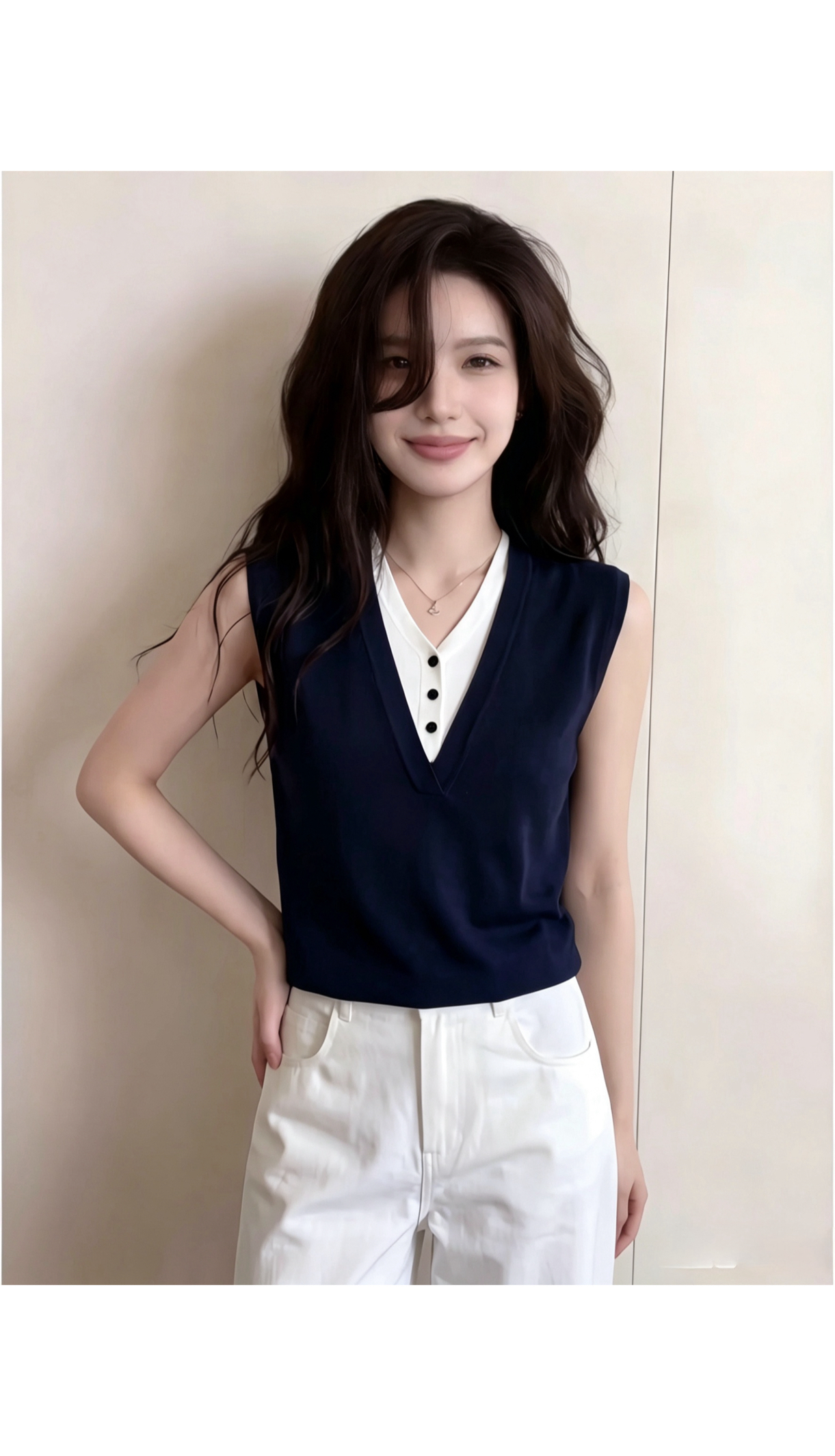 디자인 센스 V넥 민소매 조끼 여자 2026 여름 새로운 오래된 돈 바람 느슨함 센스 출퇴근 미니멀리즘 슬림해 보이는 착용 가져 가라.