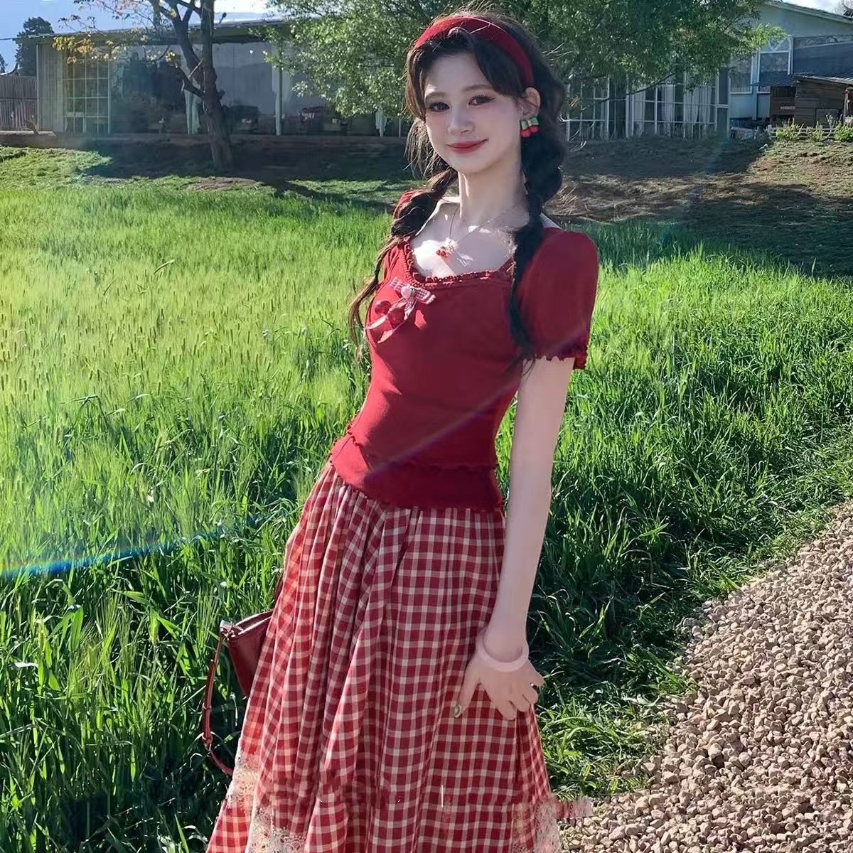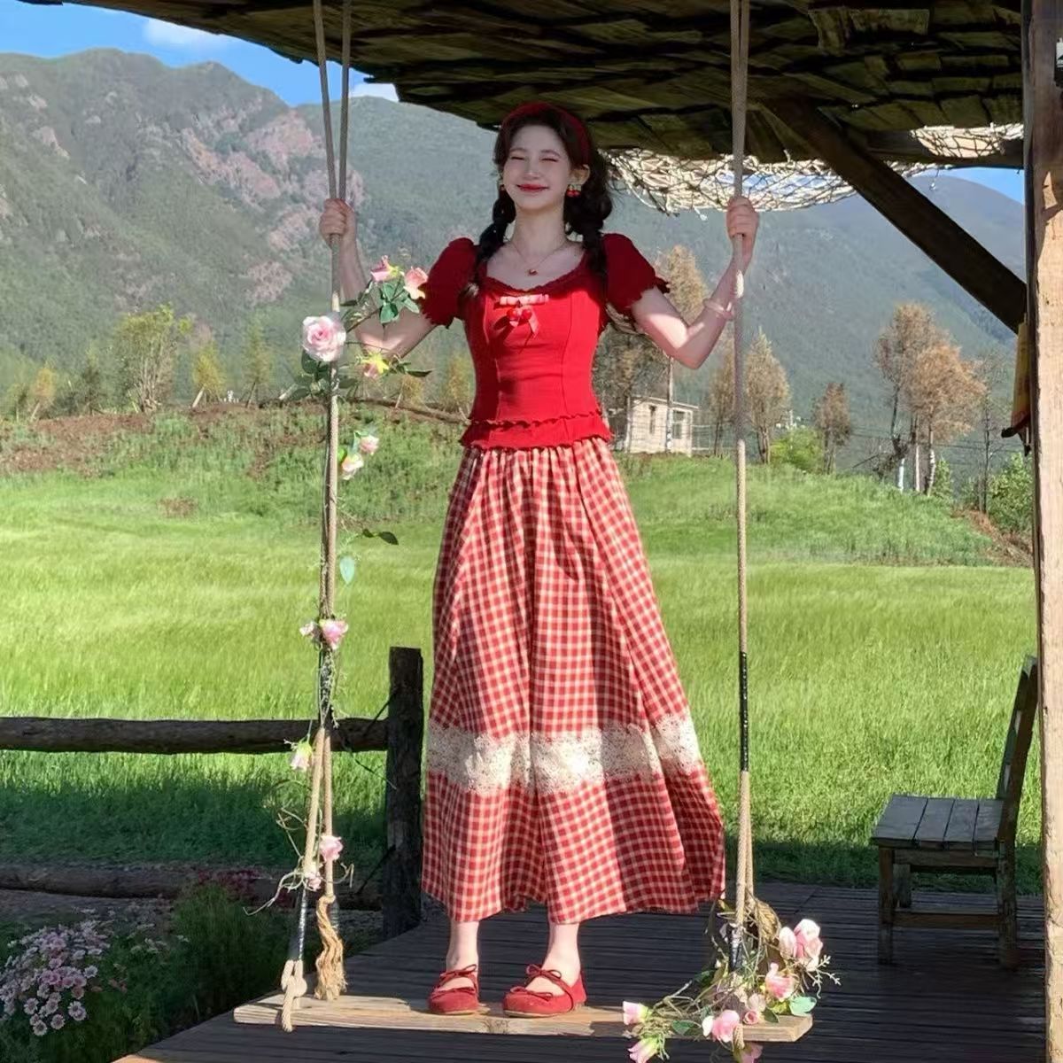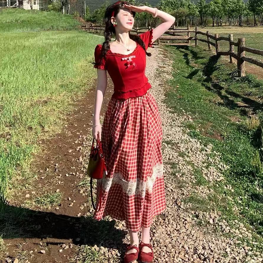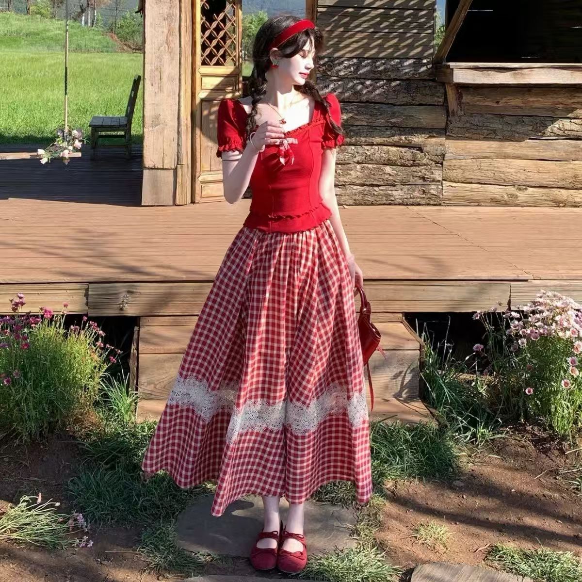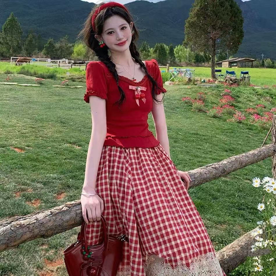 느긋한 바람 빨간색 니트 자카드 세트 여성 2026 새로운 봄 가을 연령 감소 착용 잡아라. 의류 반신 스커트 투피스 세트