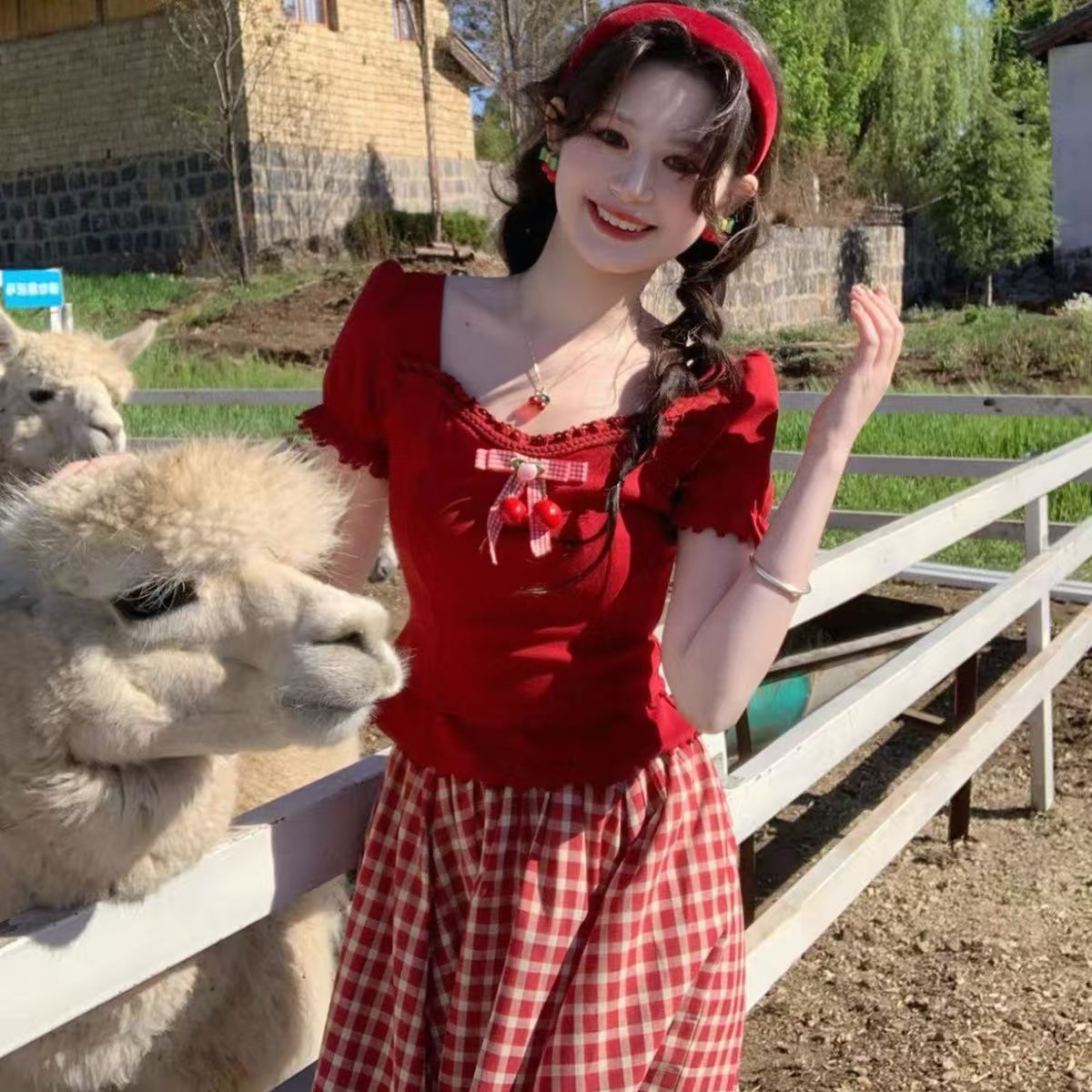 3 월 23 일 신제품 annatto 레트로 학원 스타일 체크무늬 V넥 허리 수축 레이스업 반팔 여성 셔츠 여름