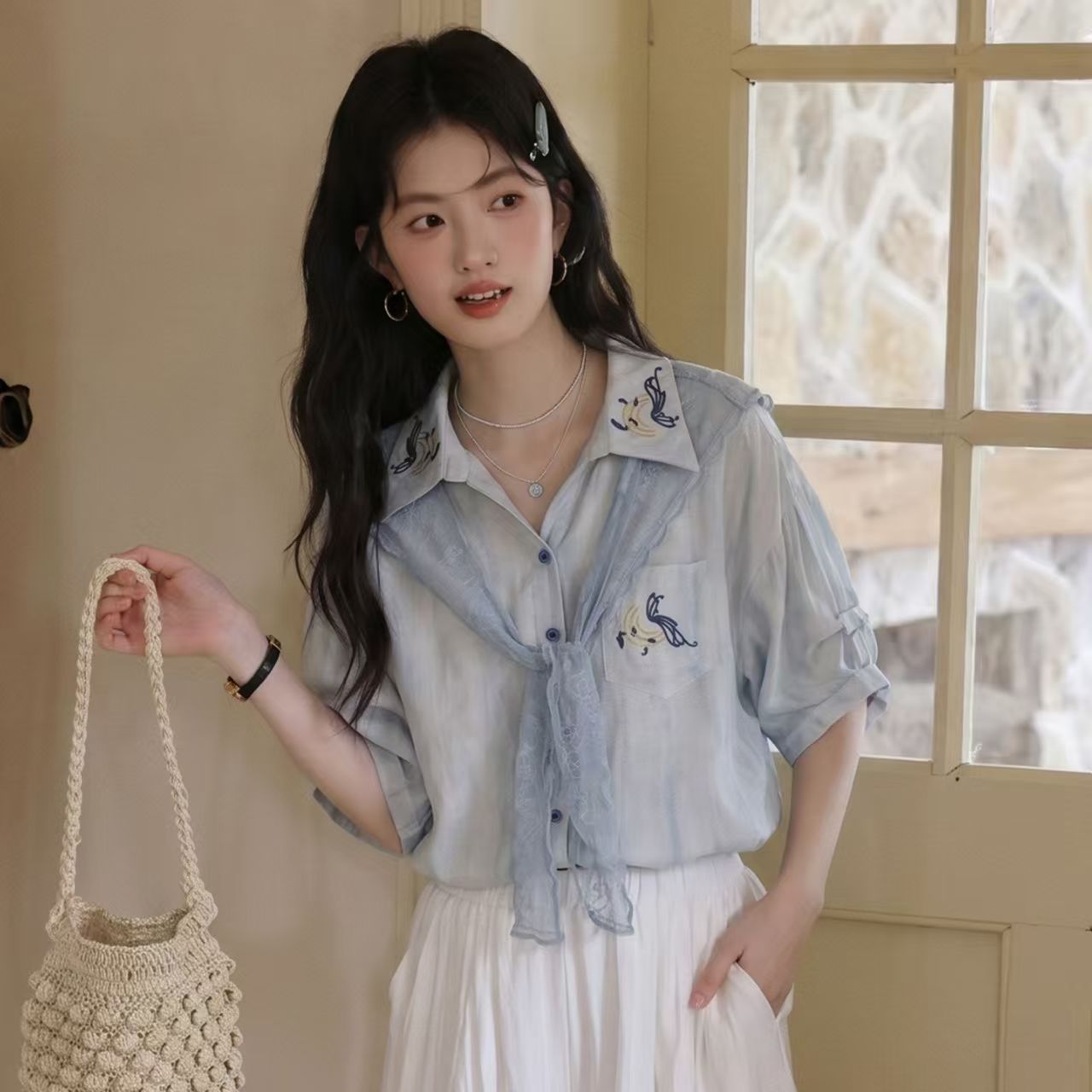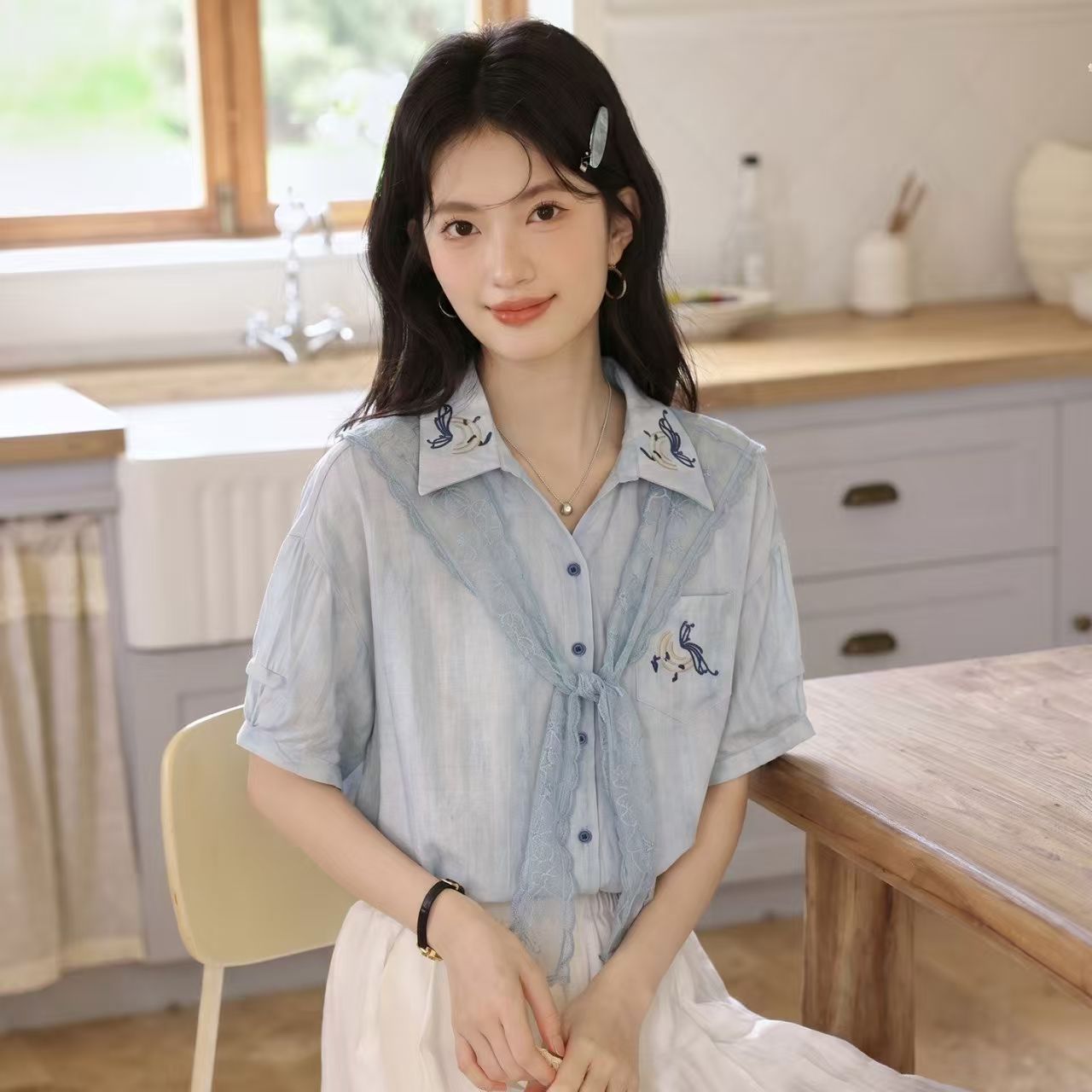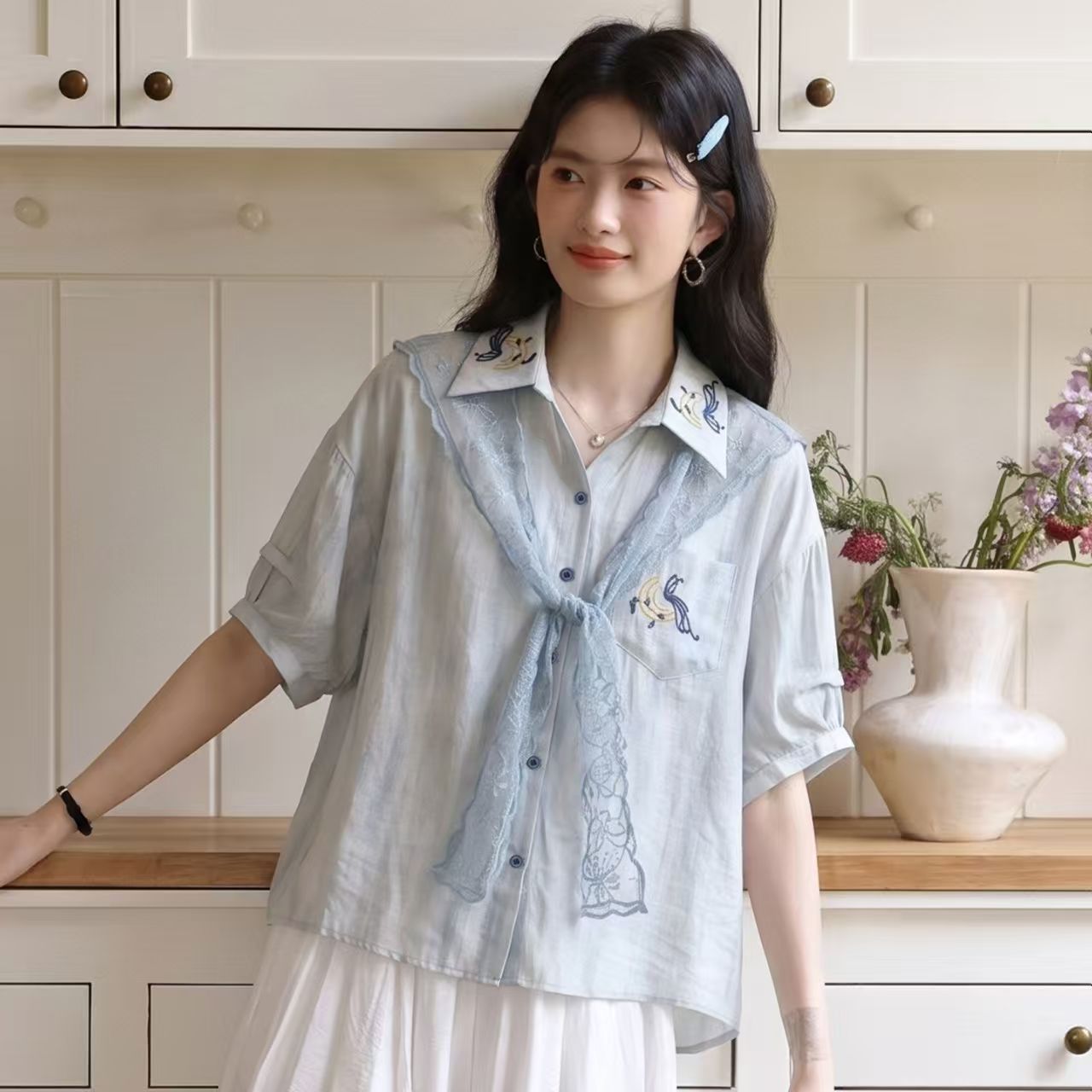 레트로 문예 바람 레이스 숄 반팔 여성 셔츠 여름 2026 새로운 디자인 센스 작은 대중 루즈핏 맨위