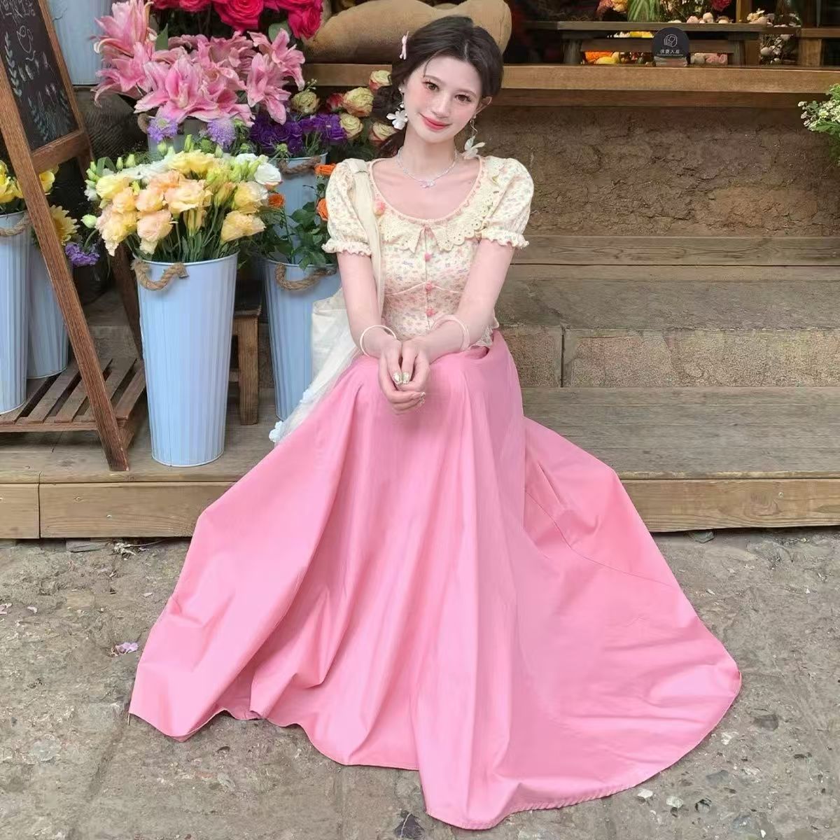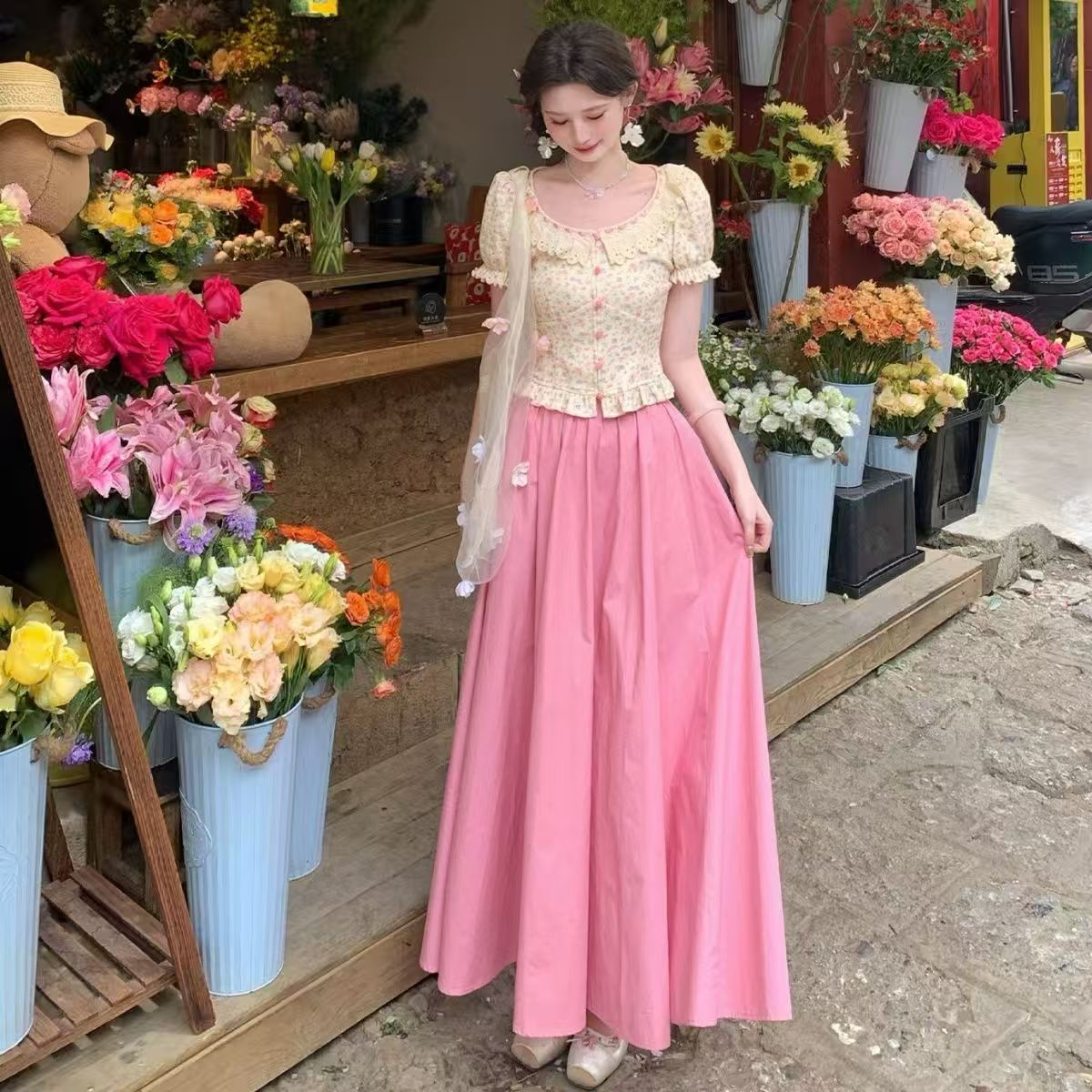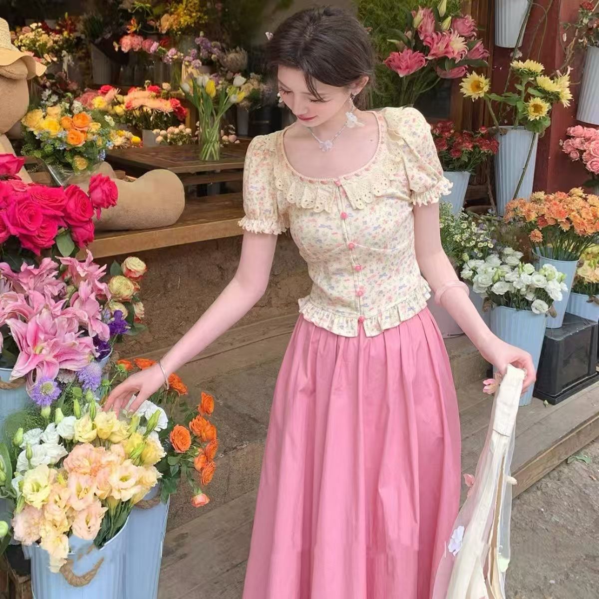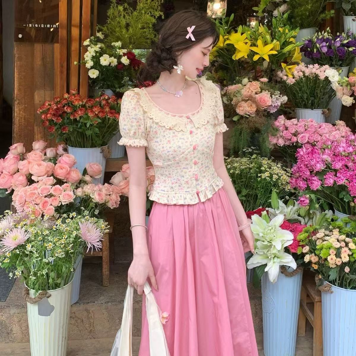 프랑스식 꽃무늬 슬림해 보이는 쇼트 스타일 여성 셔츠 여름 새로운 거품 소매 맨위