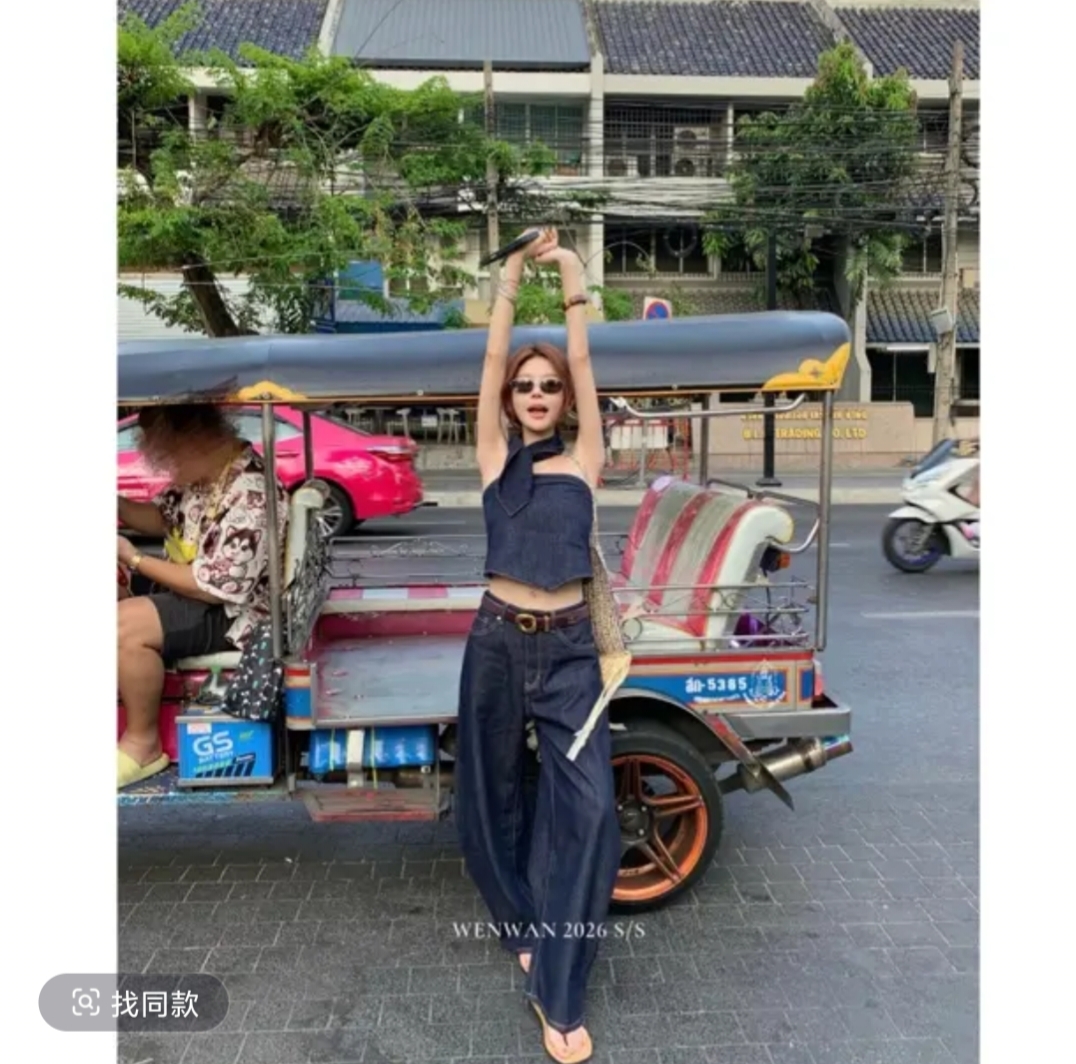 열기 행침 데님 고급 센스 데님 목 수건 붓다 삼각형 튜브탑 데님 캐주얼 바지 민족 한푸 세트
