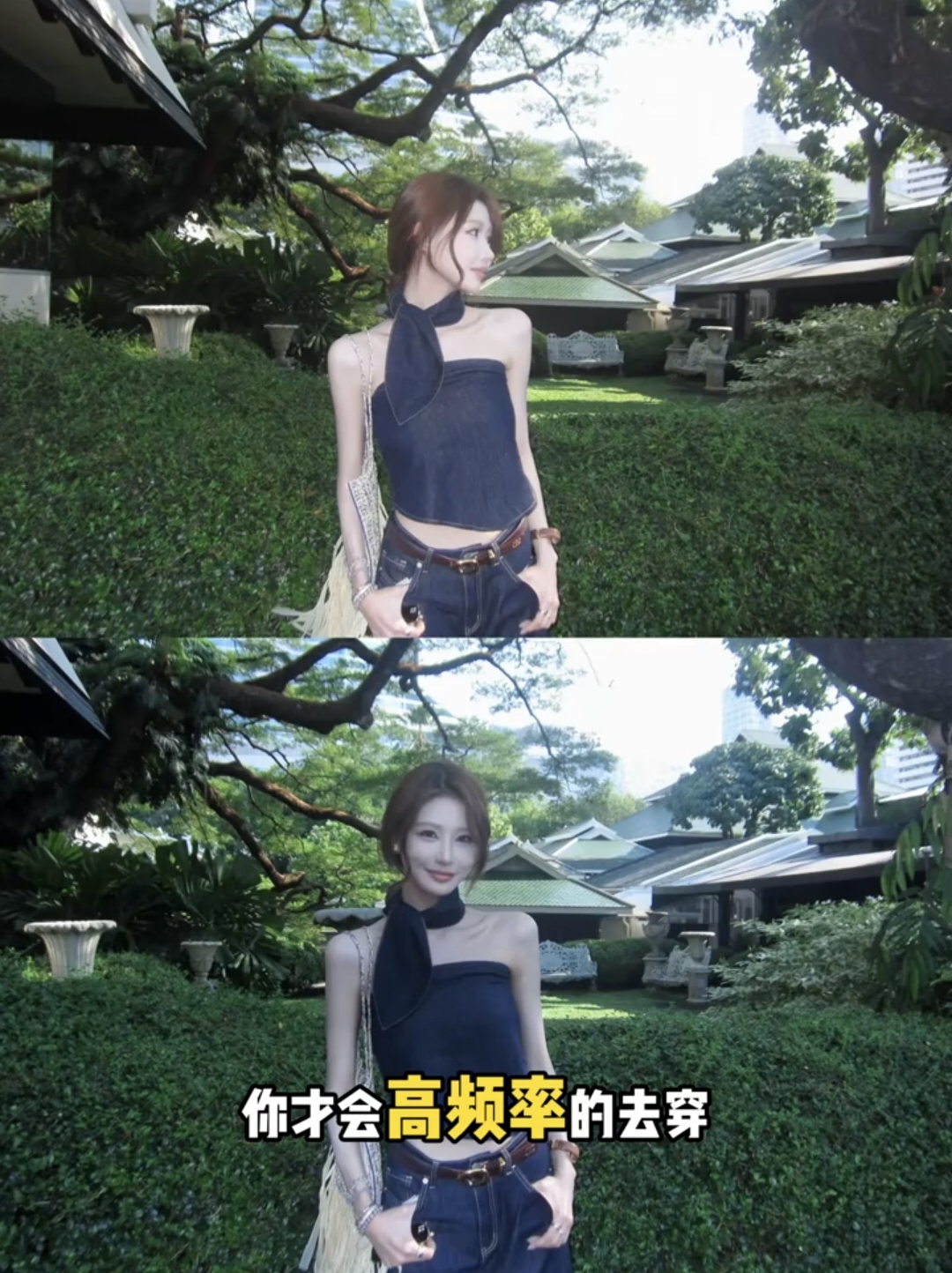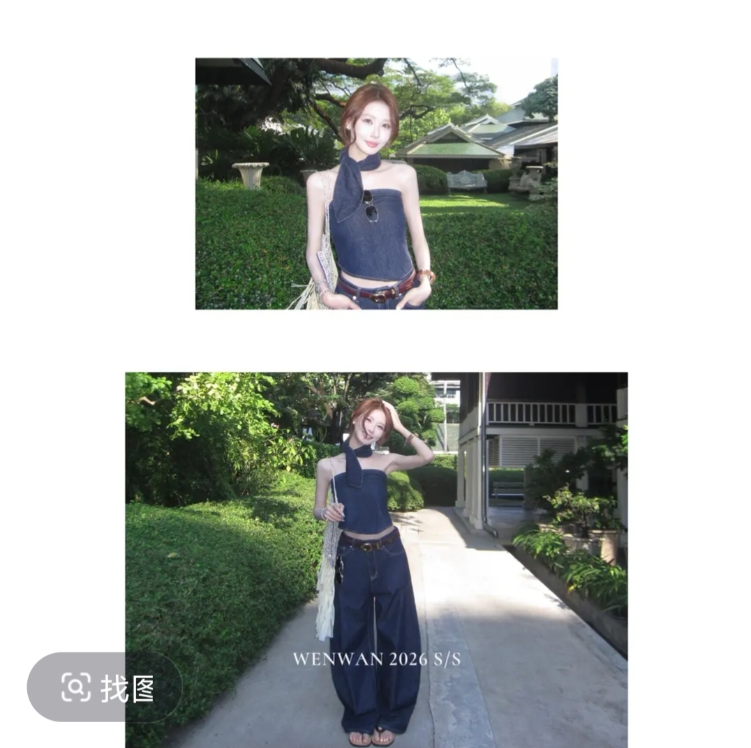 2026 년 여름 외국 가스 새로운 트렌드 연령 감소 시간 아직도 느낌 데님 슬림해 보이는 V넥 맨위 바지 두 조각 여성 세트
