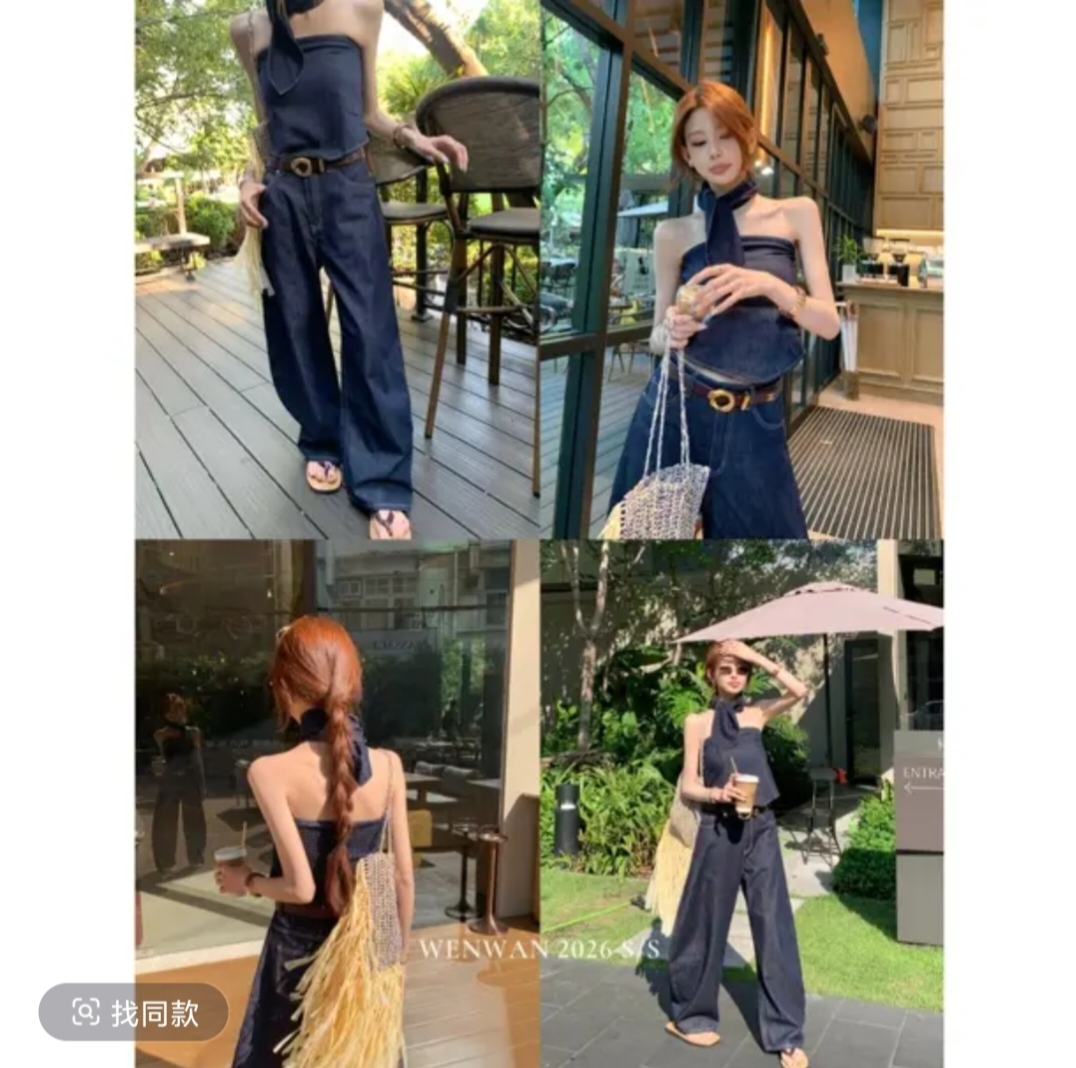 열기 행침 데님 고급 센스 데님 목 수건 붓다 삼각형 튜브탑 데님 캐주얼 바지 민족 한푸 세트