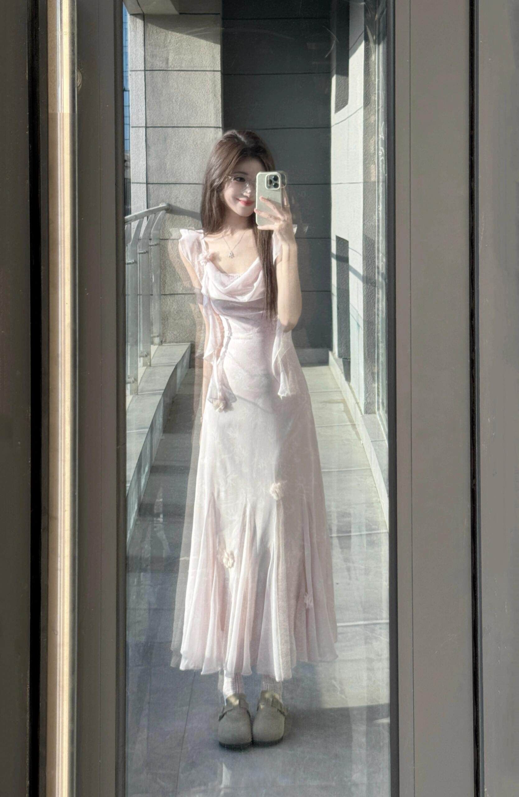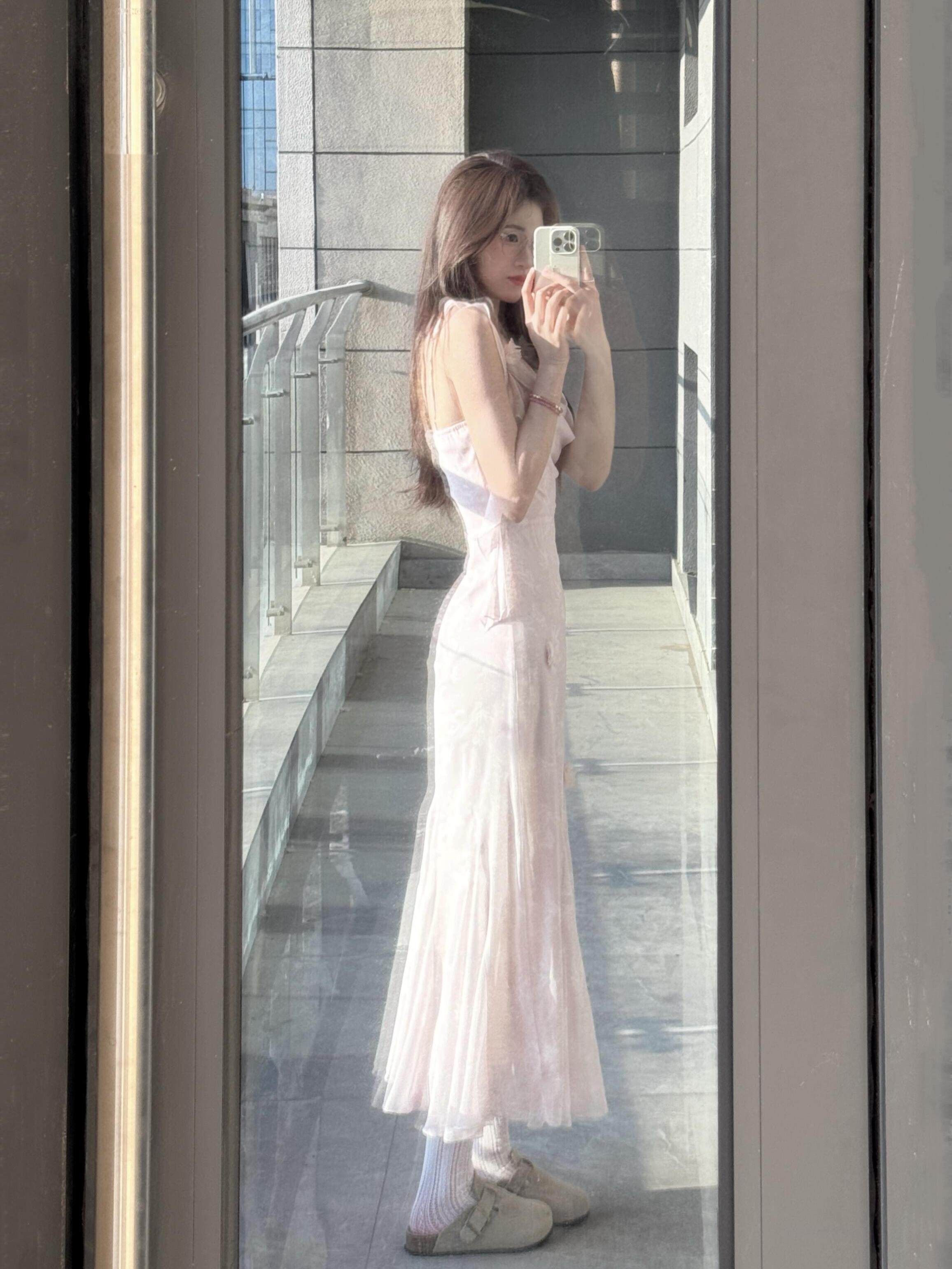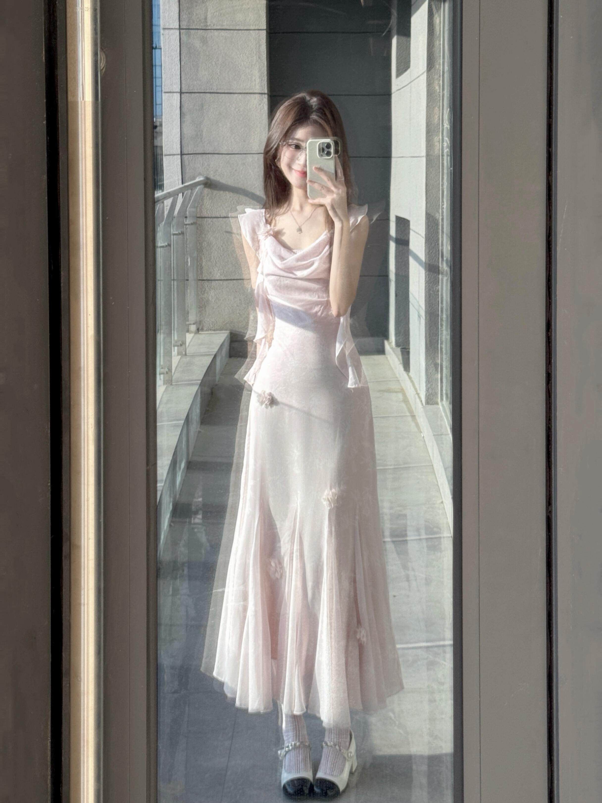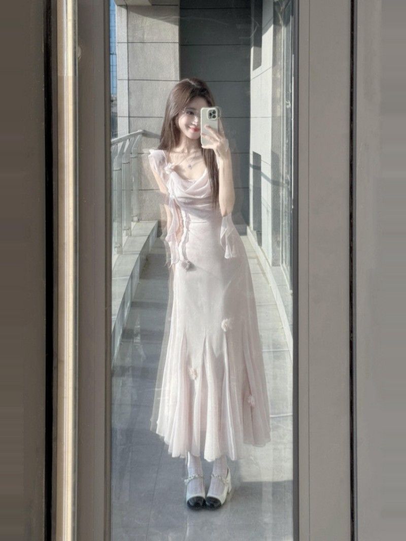 이중층 세트 인사이드 2026 새로운 새로운 중식 자수 롱 코트 백리스 허리 수축 슬림해 보이는 슬립 여성 드레스