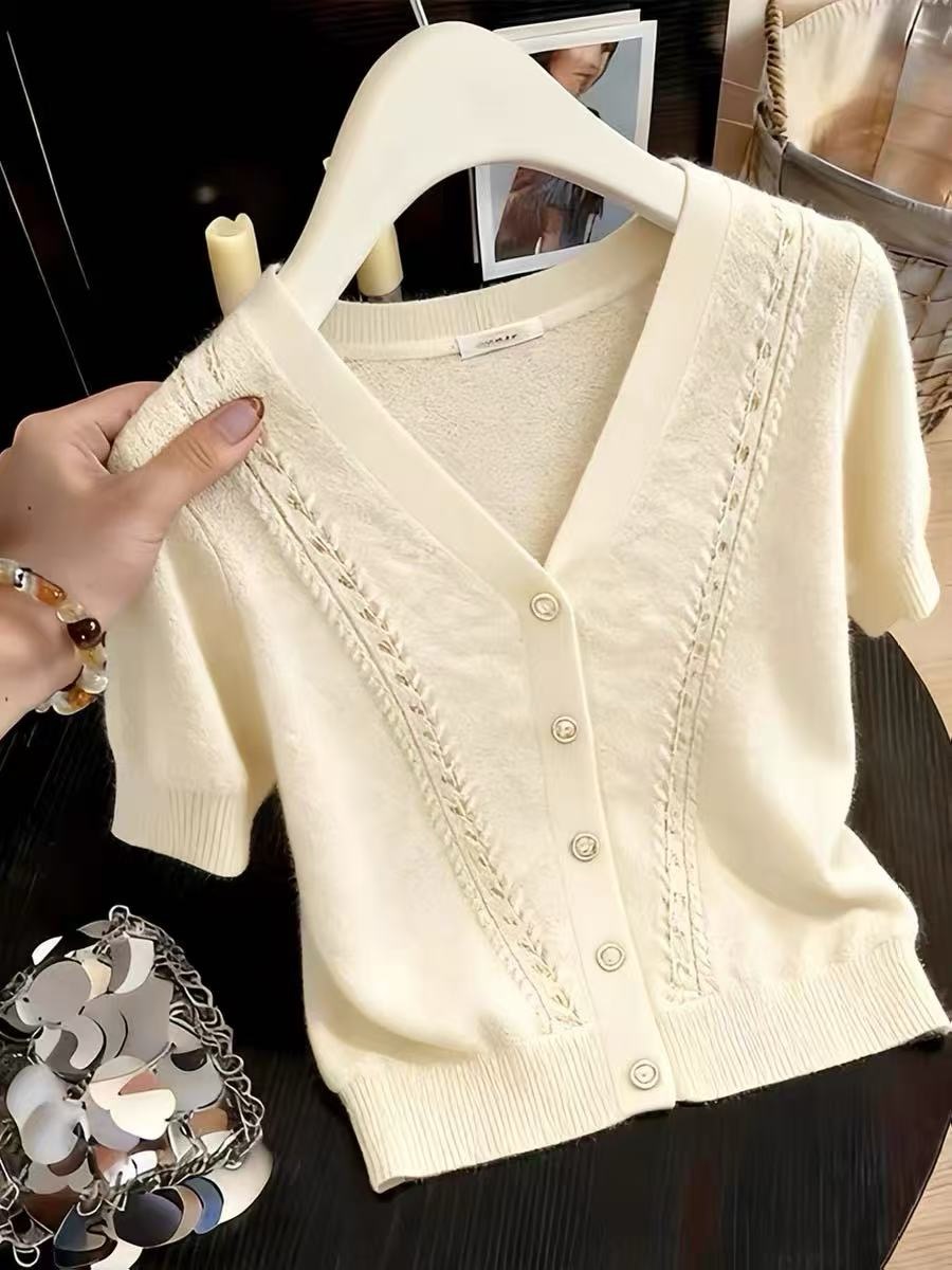 프랑스식 레트로 홀로우 아웃 반팔 니트 스웨터 여성 2026 여름 새로운 얇은 스타일 색상 자수 연령 감소 슬림해 보이는 맨위