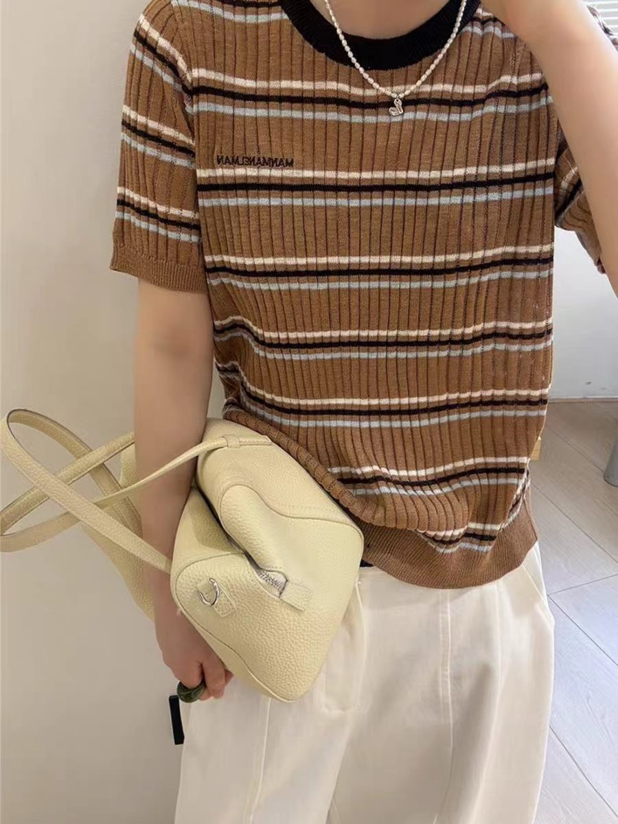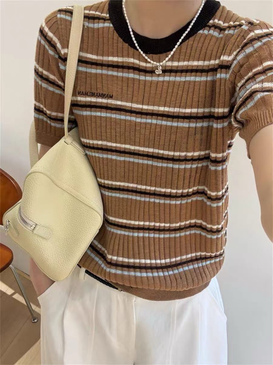 품격 디스플레이 화이트 출퇴근 배색 스트라이프 자수 알파벳 라운드 넥 반팔 니트 스웨터 여성 다용도 슬림해 보이는 풀오버 맨위