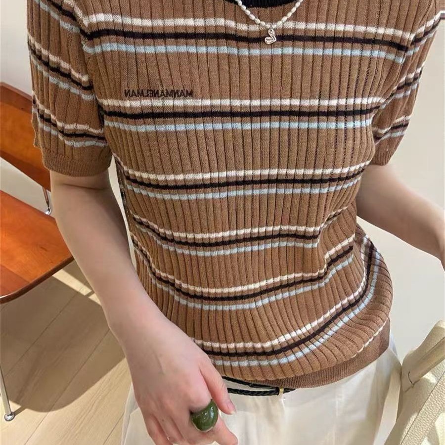 블루 화이트 배색 스트라이프 폴로 칼라 자수 반팔 니트 스웨터 여성 여름 루즈핏 통기성 슬림해 보이는 다용도 슬림해 보이는 맨위