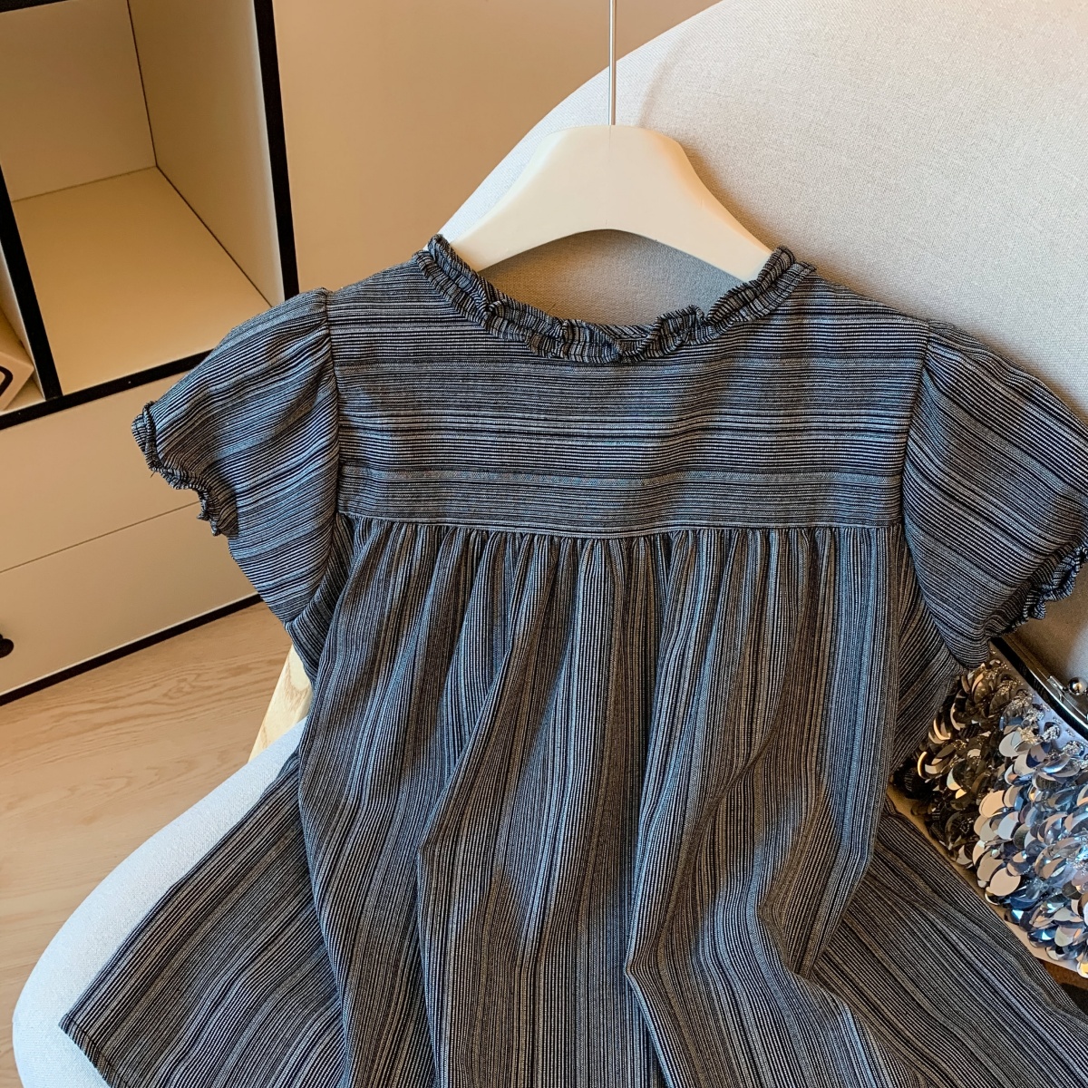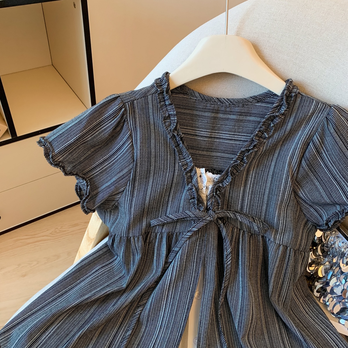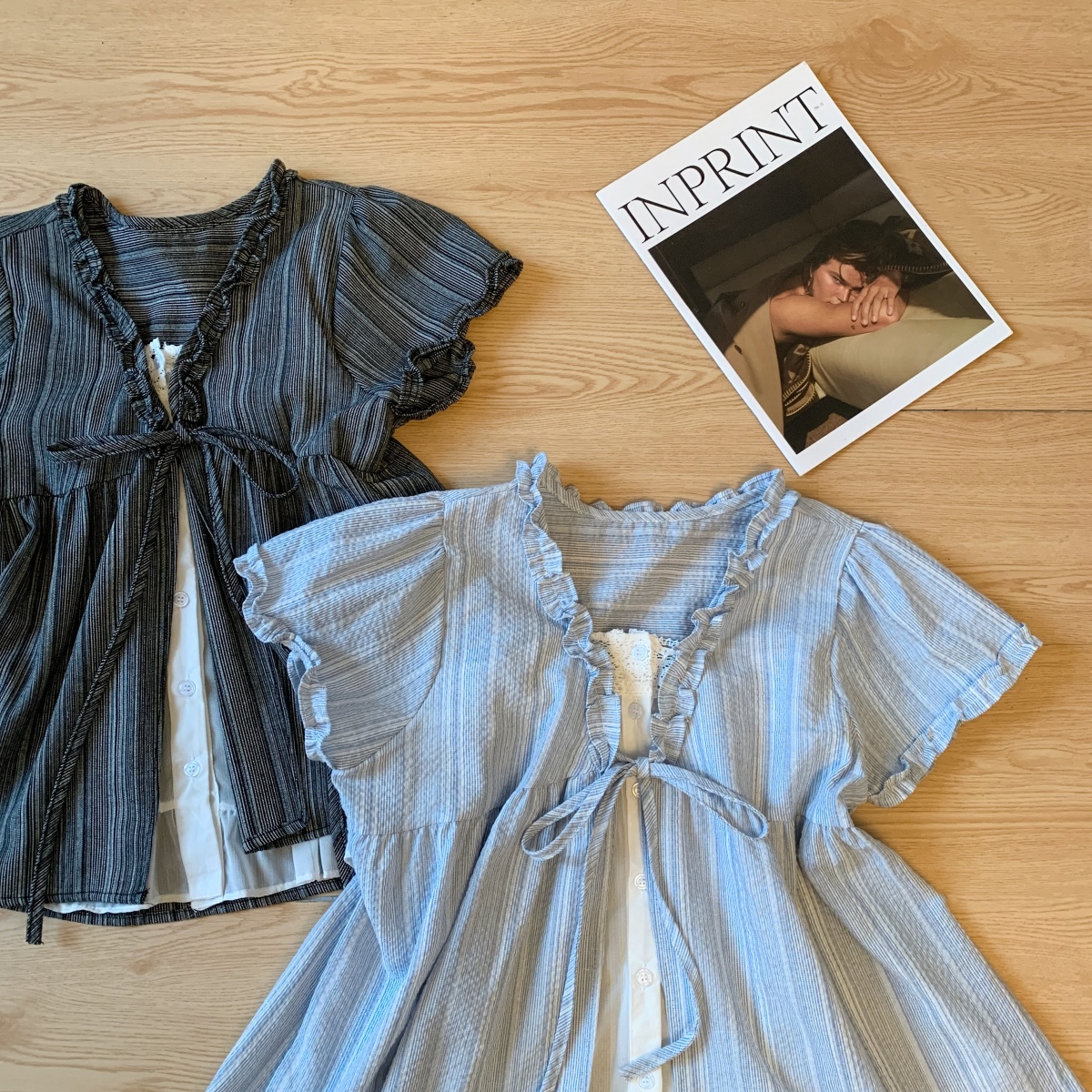 실사 페이크 레이어드 V넥 레이스업 파란색 스트라이프 반팔 여성 셔츠 여름 한 부서 달콤함 디자인 센스 맨위