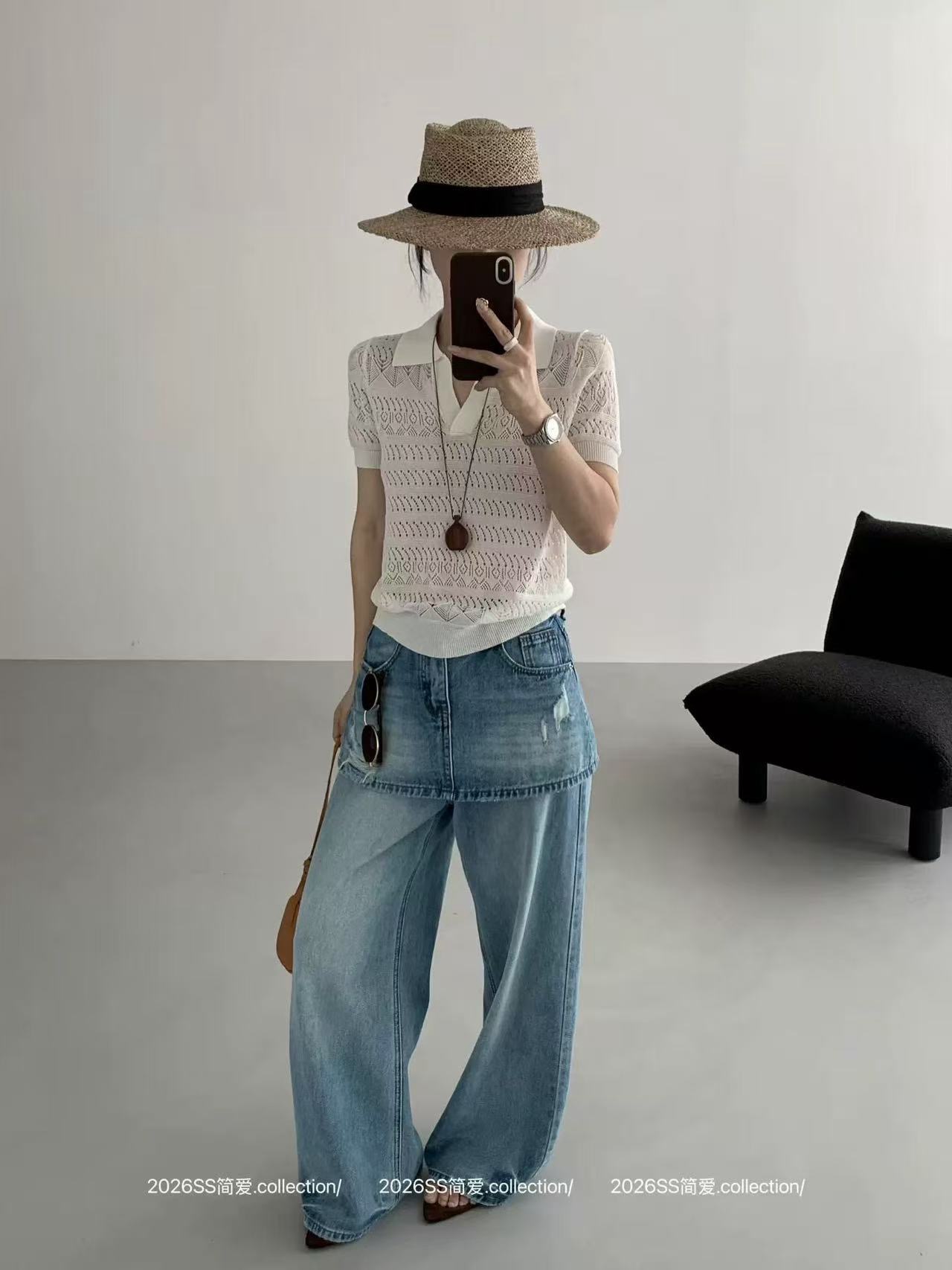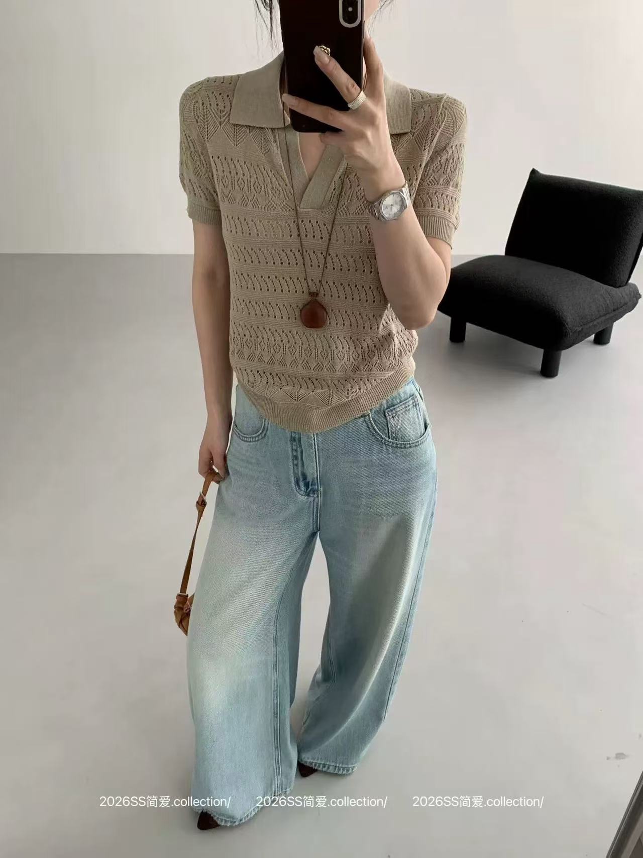 아니요 자랑 품격 오래된 돈 바람 화이트 홀로우 아웃 니트 스웨터 여성용 짧은 소매 폴로 칼라 루즈핏 슬림해 보이는 맨위 여름 얇은 스타일