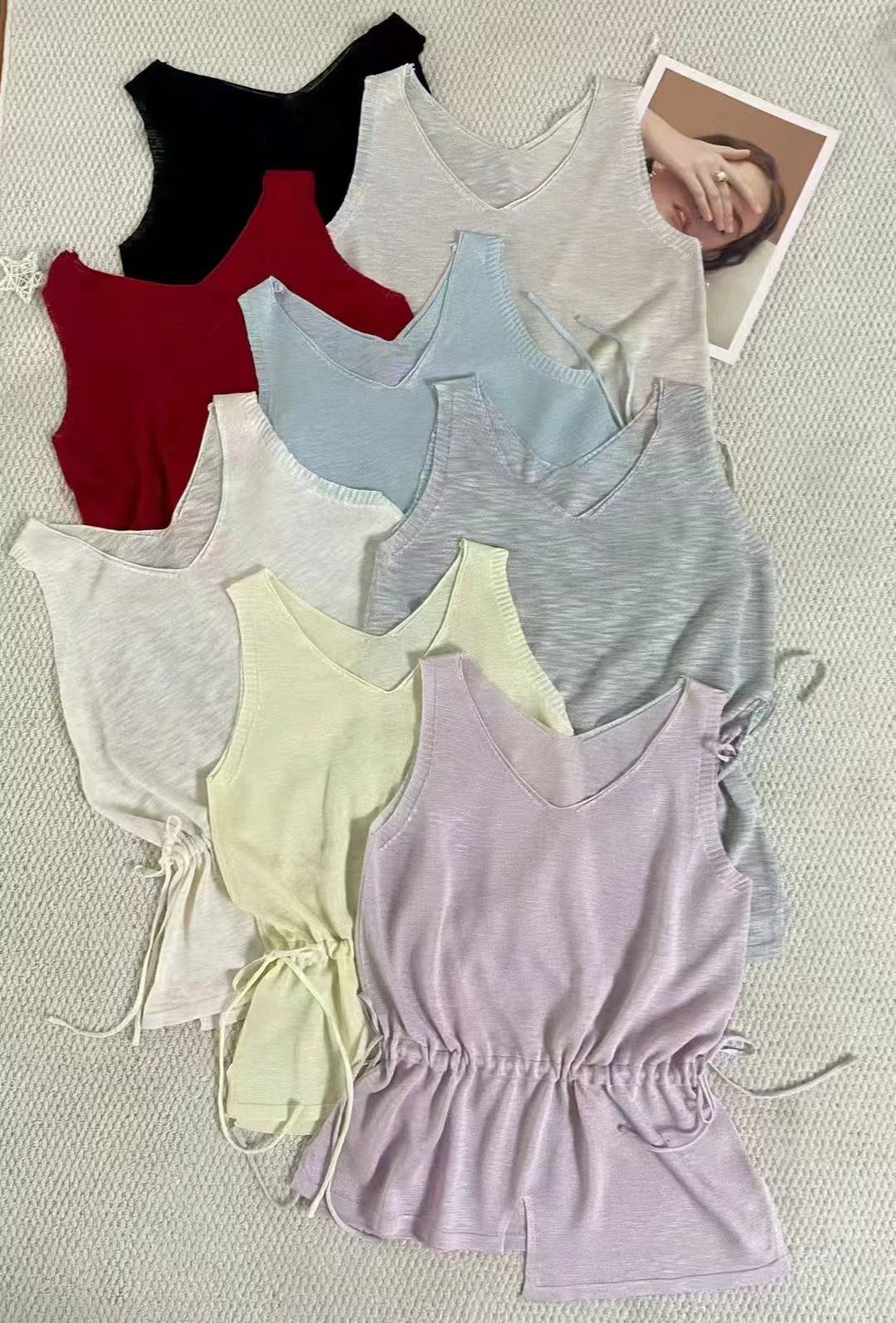 2026 여름 새로운 민소매 허리 수축 니트 스웨터 불규칙 트임 밑단 외국 가스 연령 감소 맨위