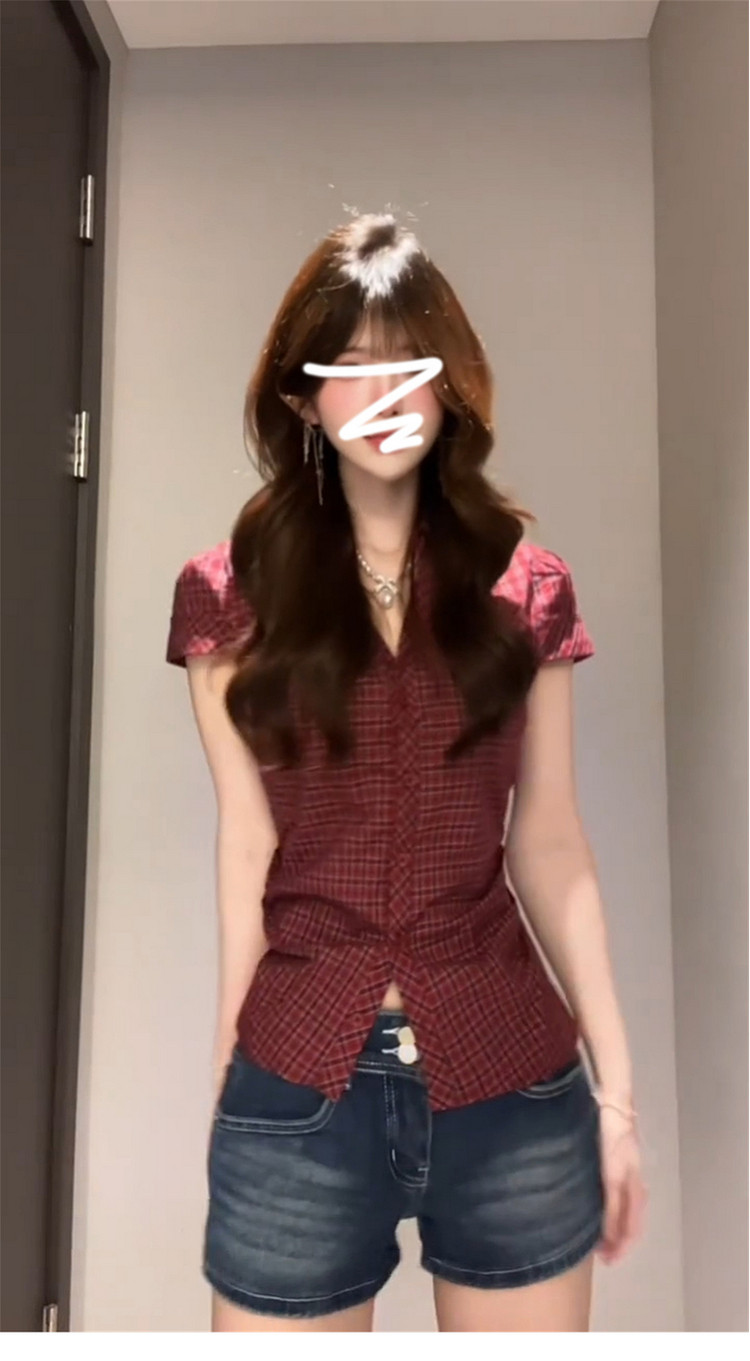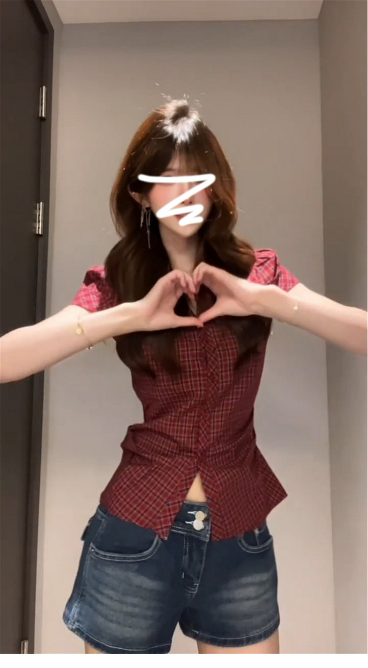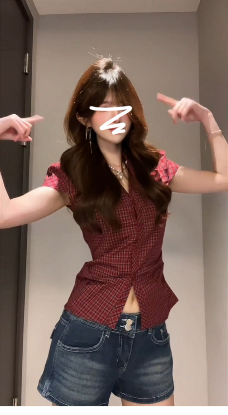 아메리칸 레트로 핫걸 빨간색 긍정적 인 어깨 체크무늬 반팔 셔츠 여자 2026 여름 새로운 섹시함 허리 수축 맨위
