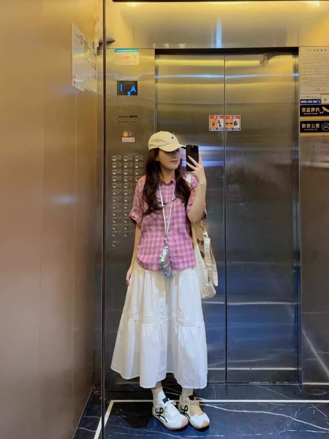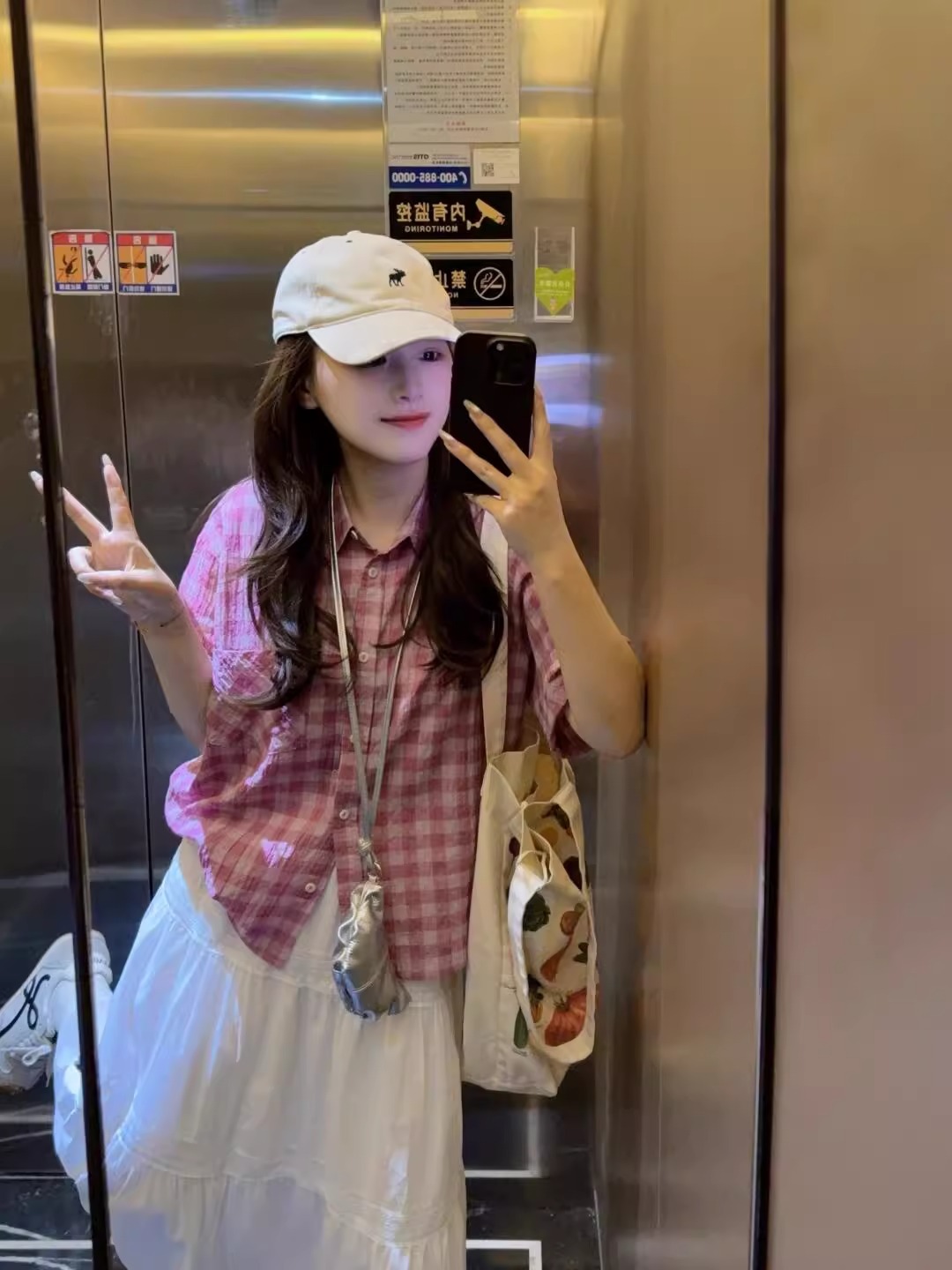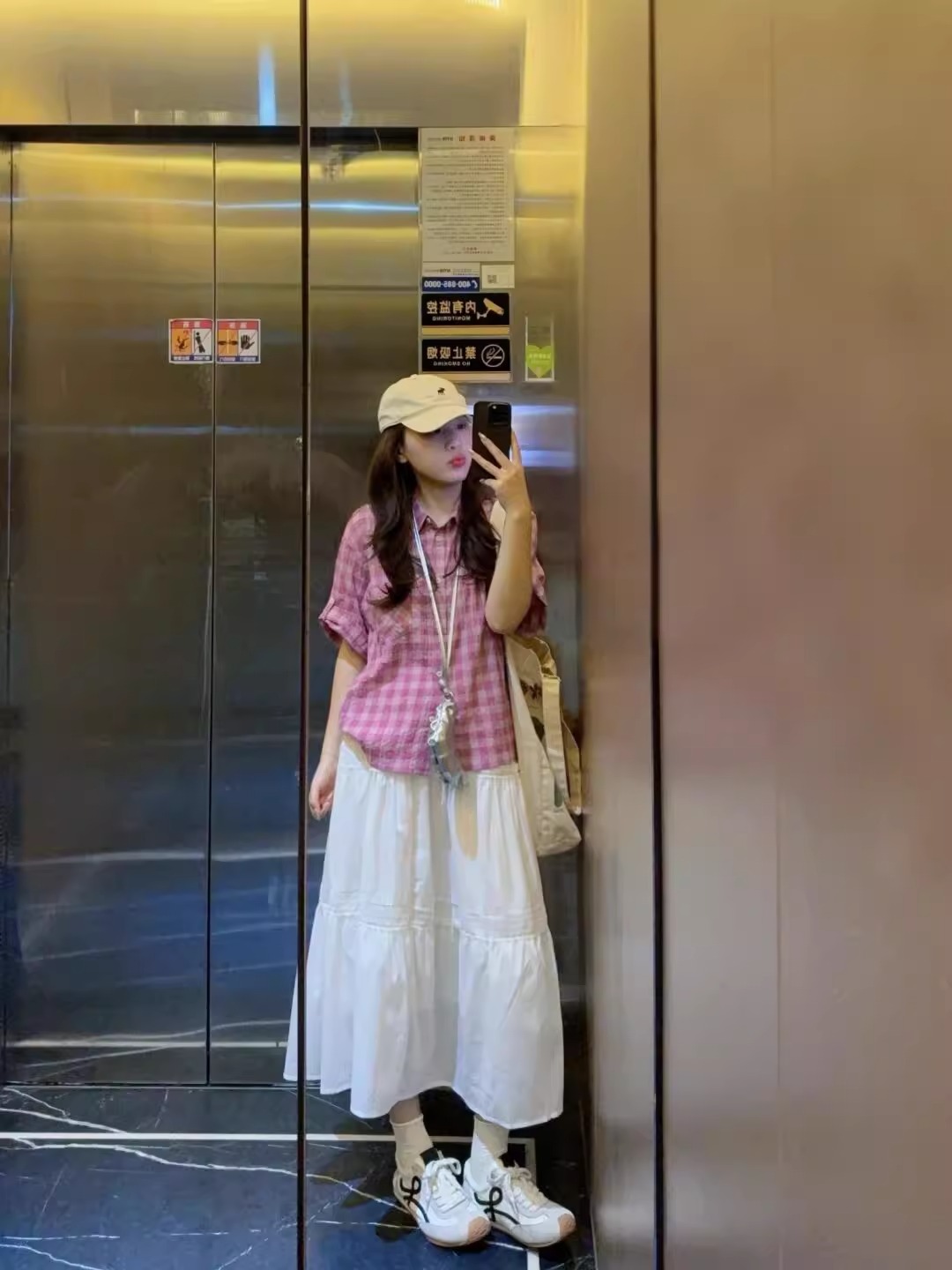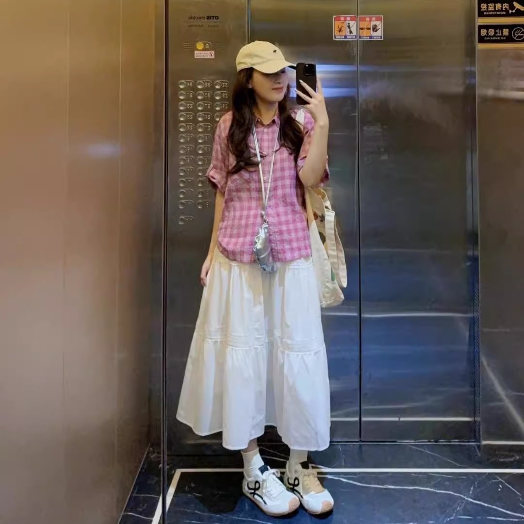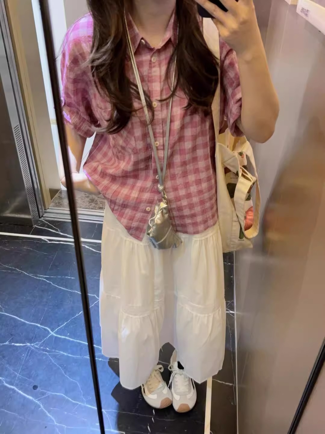 초여름 코디 전체 집합 빅 사이즈 마이크로 지방 mm 핑크색 격자 무늬 셔츠 반신 스커트 연령 감소 고급 투피스 슈트 여성