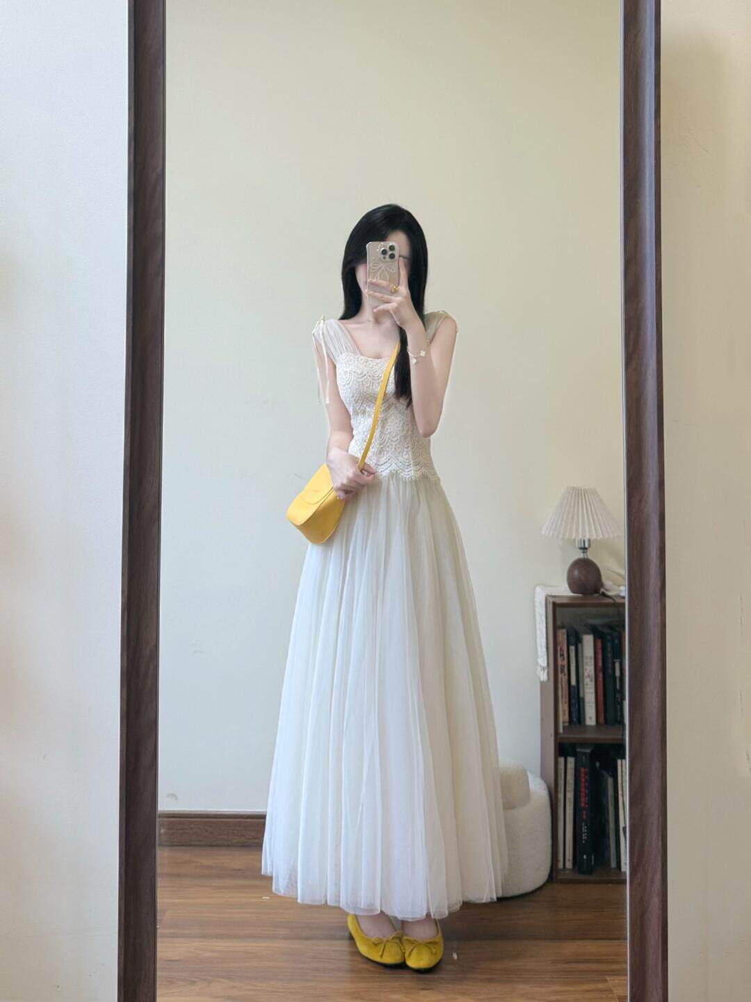 여름 코디 세트 여성 빅 사이즈 지방 mm 새는 어깨 레이스 맨위 망사 반신 치마 부드러운 아름다운 드레스