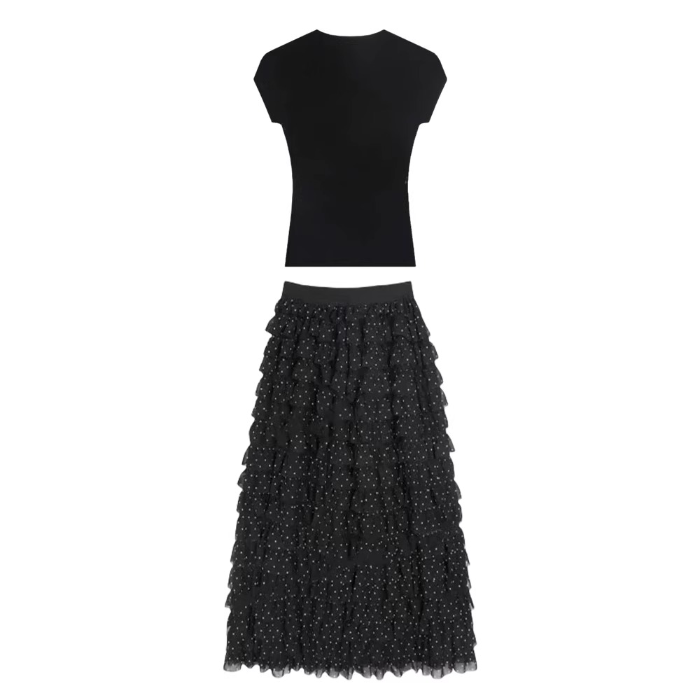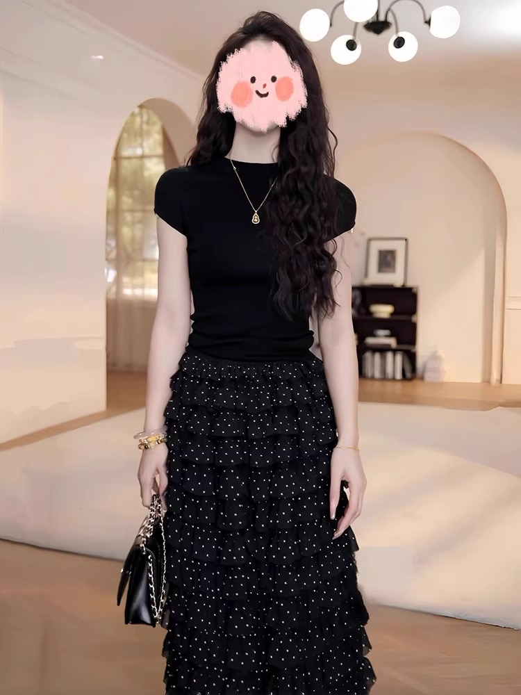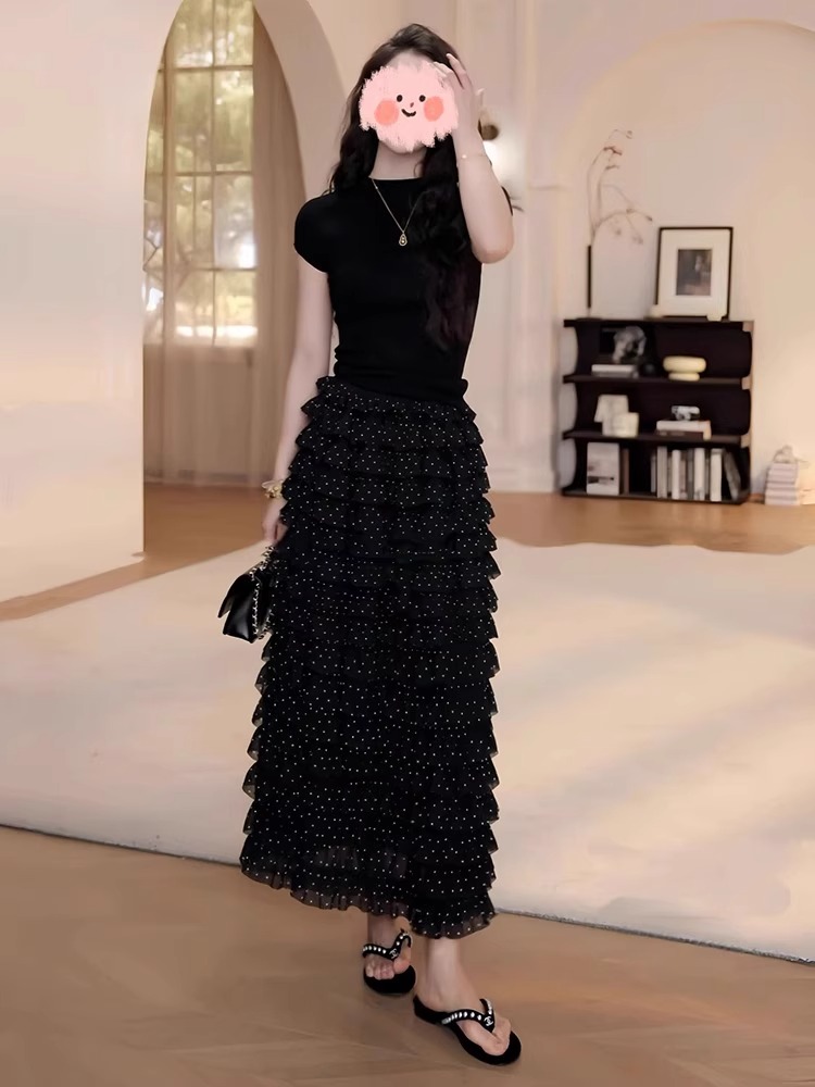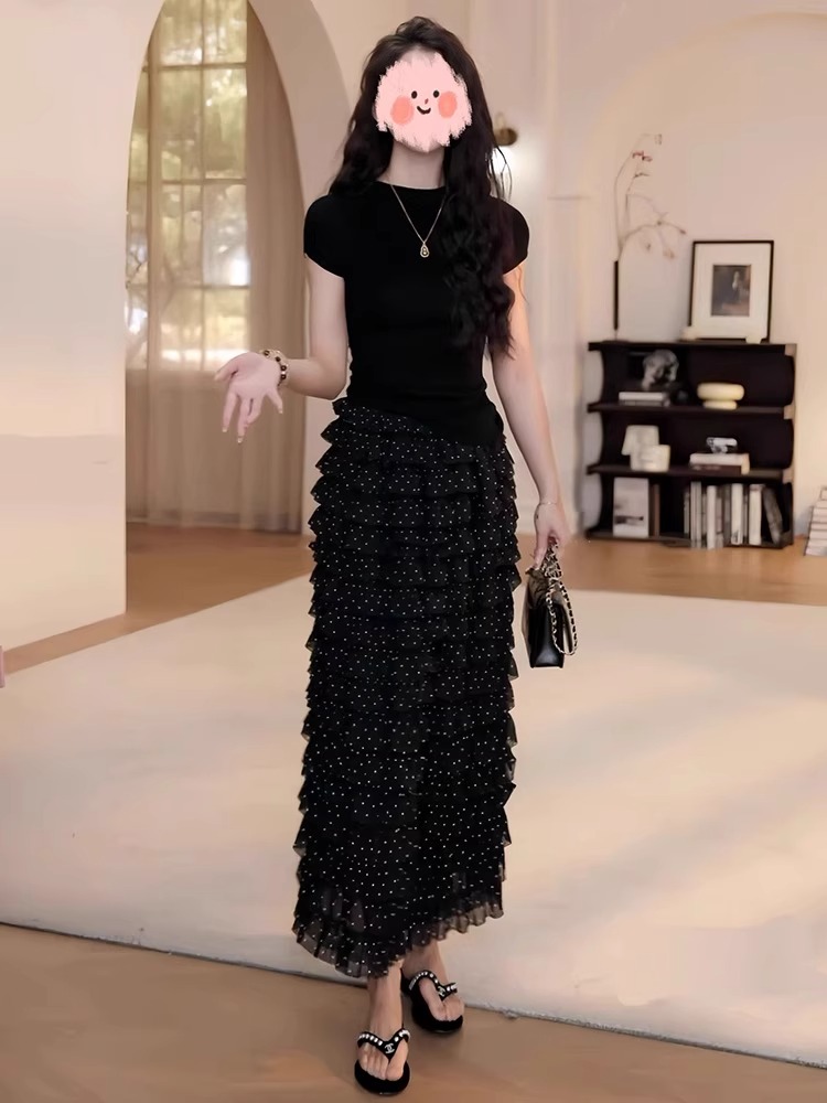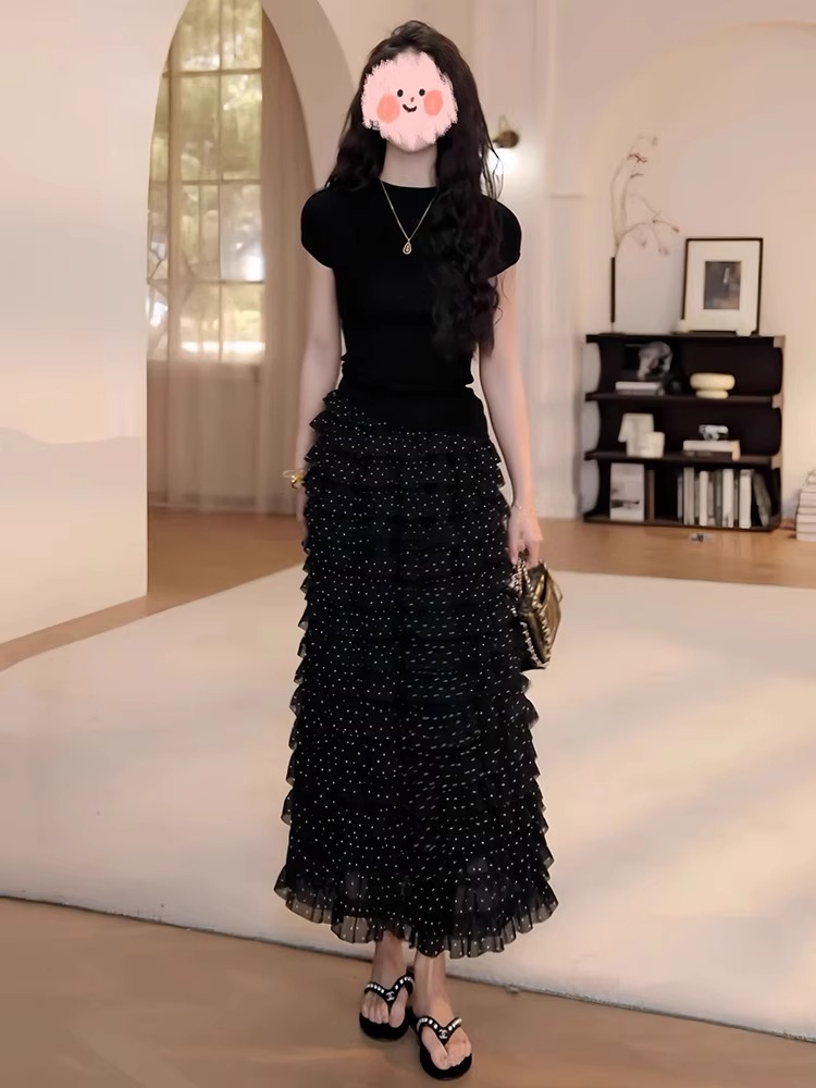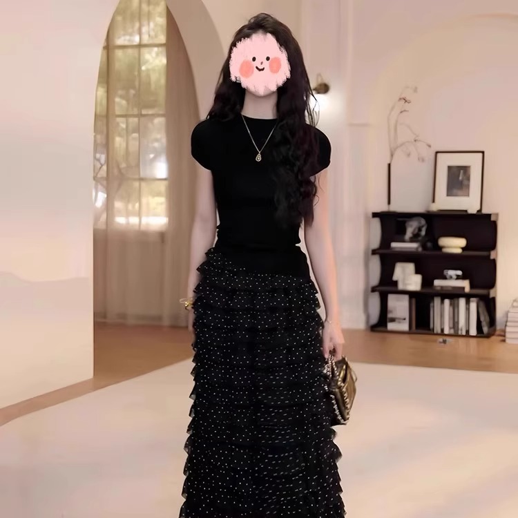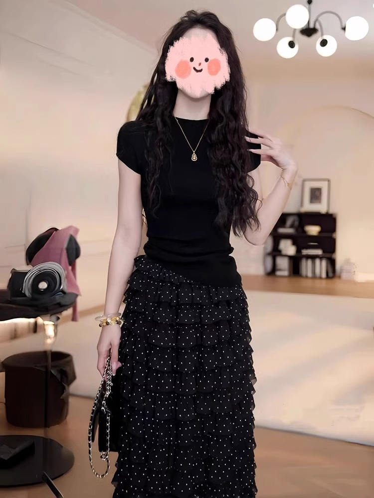 여름 드레스 착용 가져 가라. 전체 집합 빅 사이즈 지방 mm 검정색 맨위 도트 무늬 케이크 반신 치마 품격 연령 감소 세트 여성