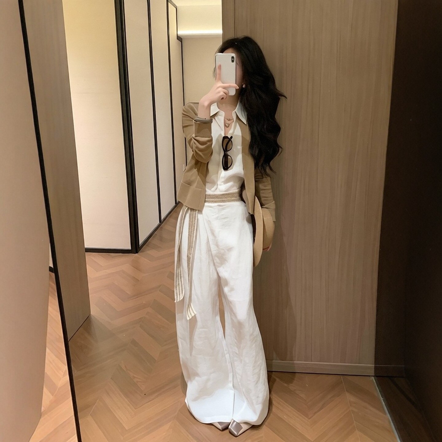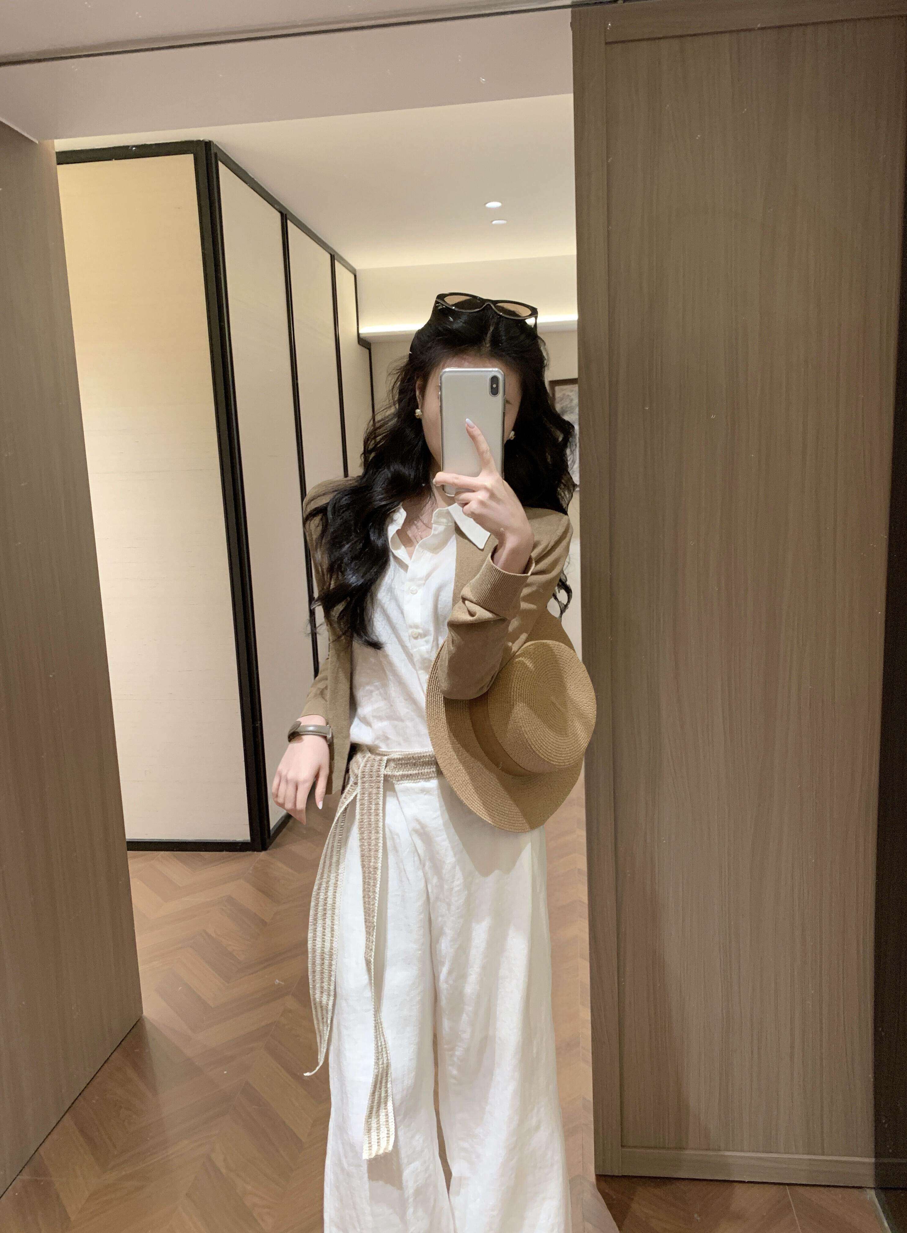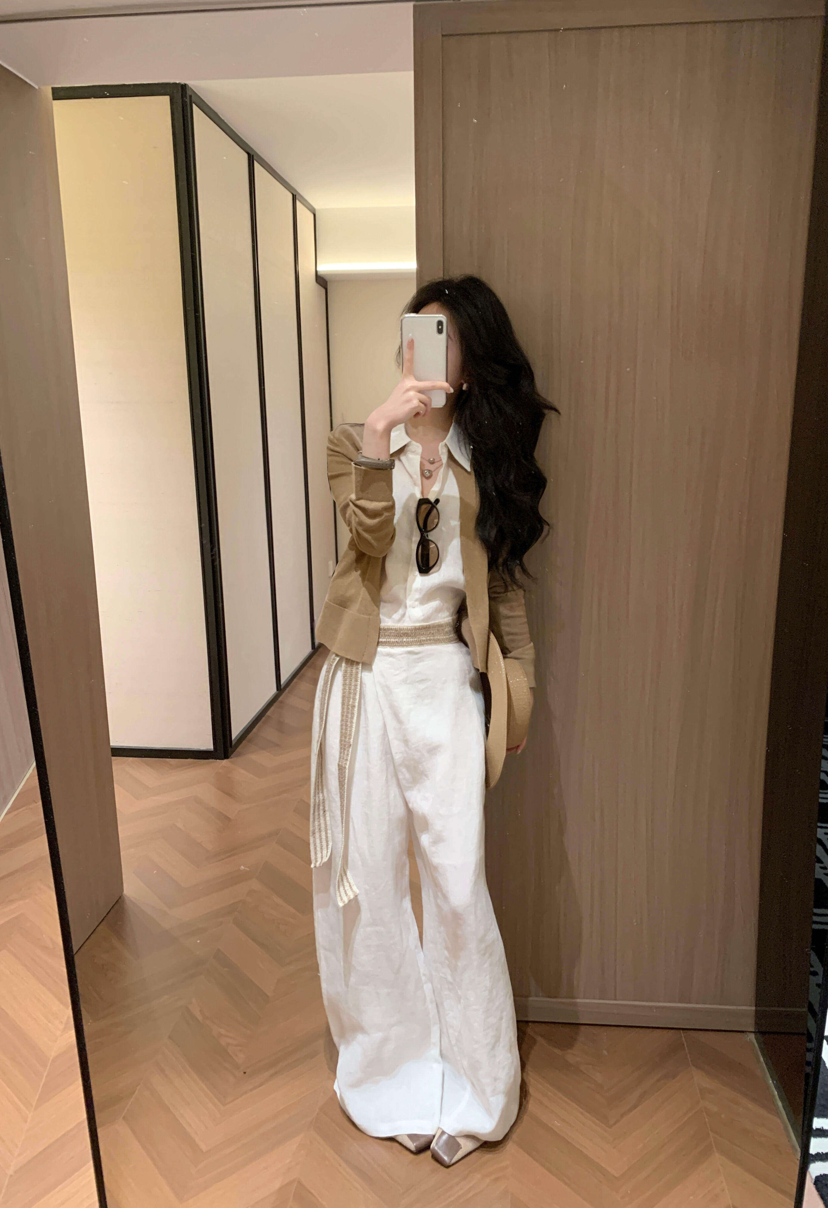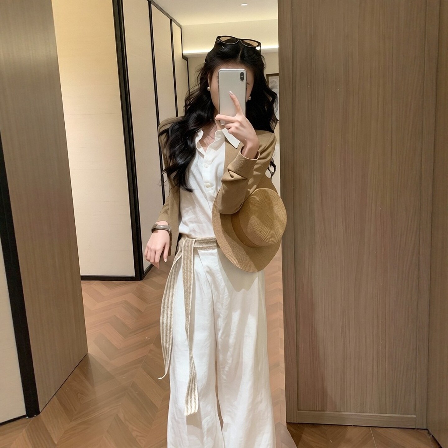 봄 코디 전체 집합 빅 사이즈 지방 mm 니트 오픈 가디건 셔츠 와이드 레그 팬츠 느슨함 센스 잘 생긴 세 조각 세트 여성