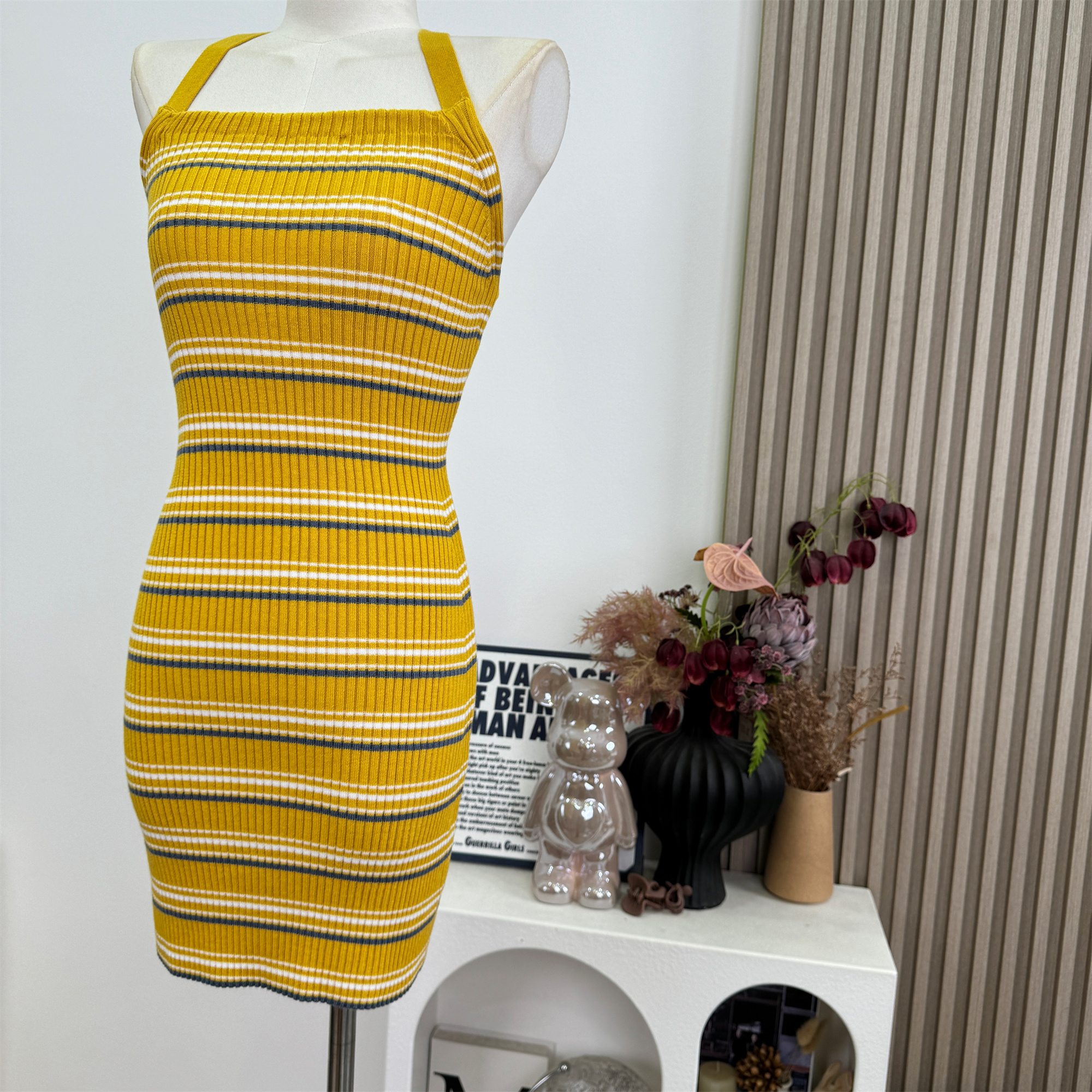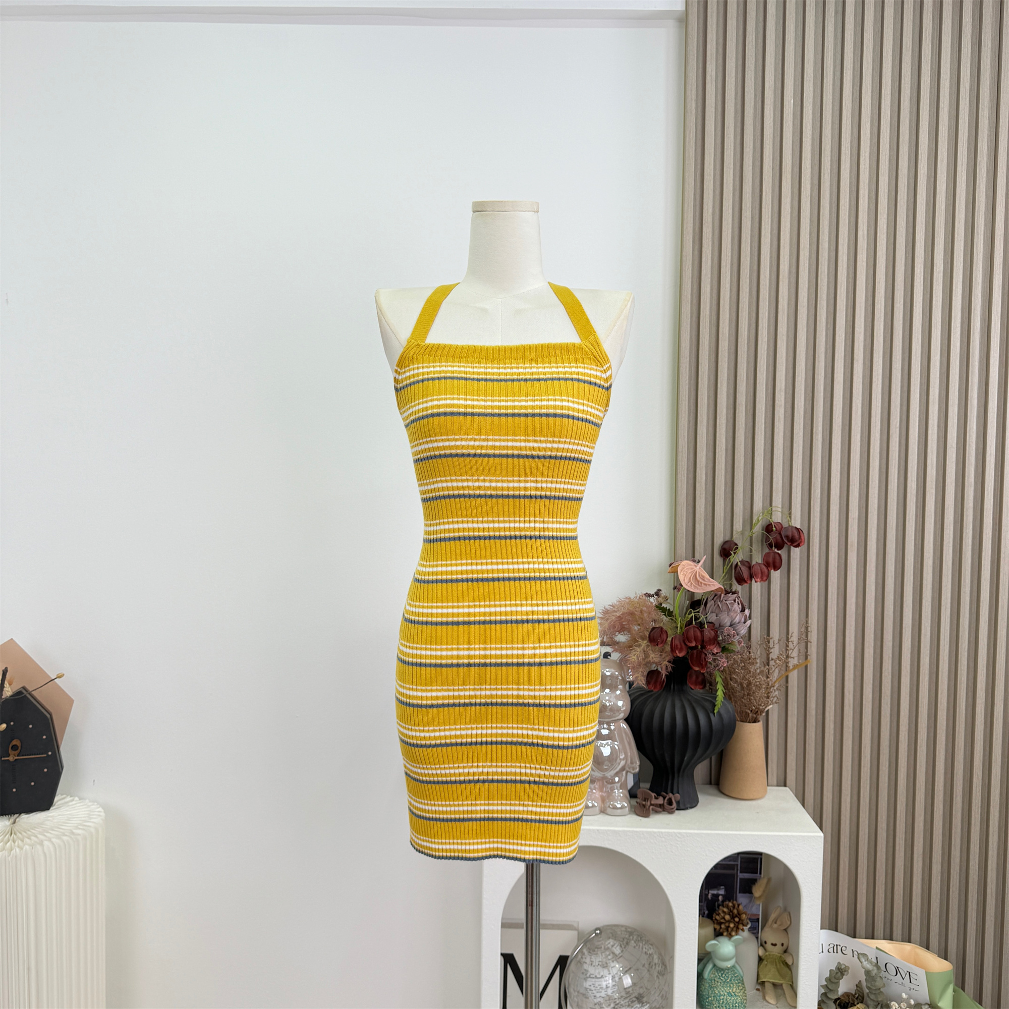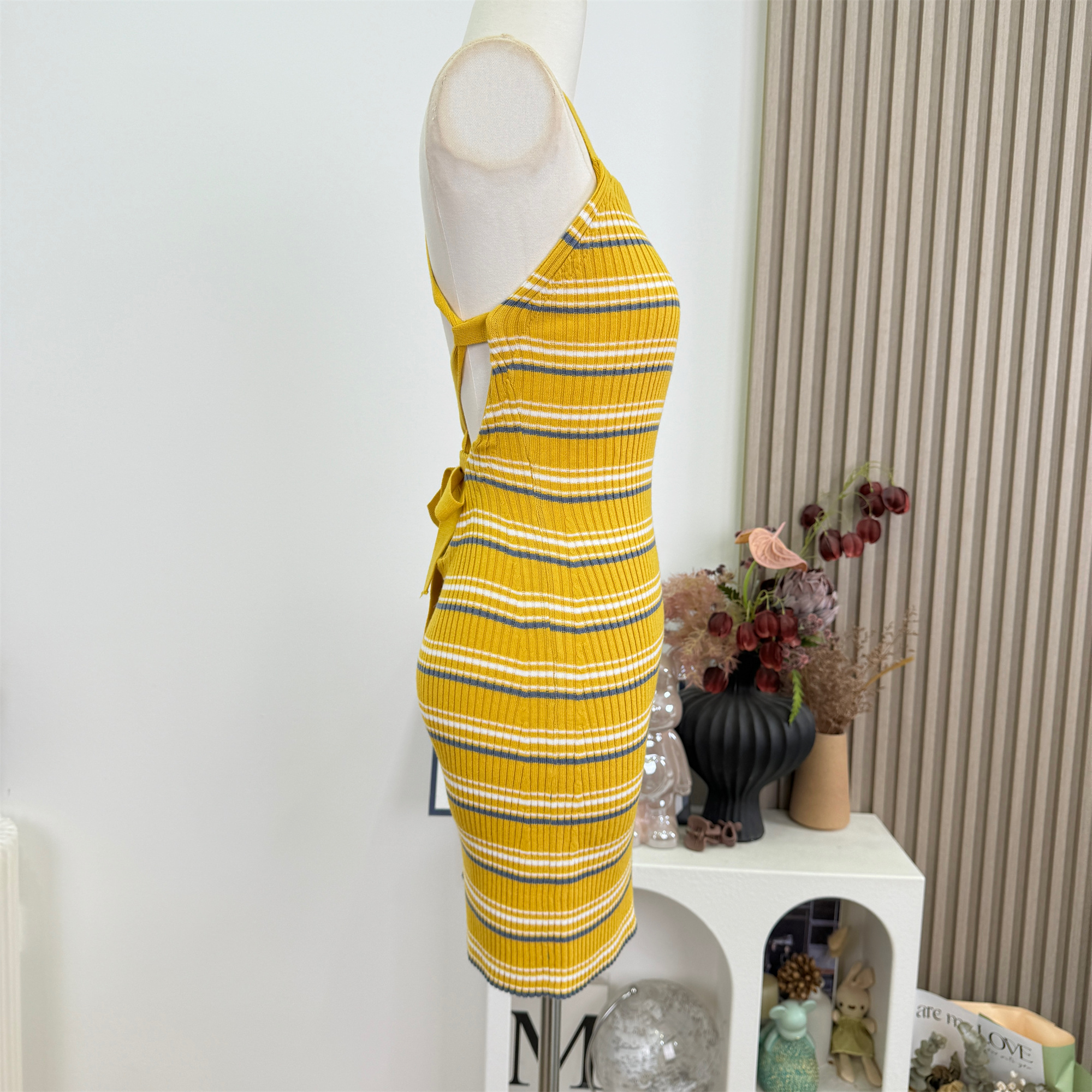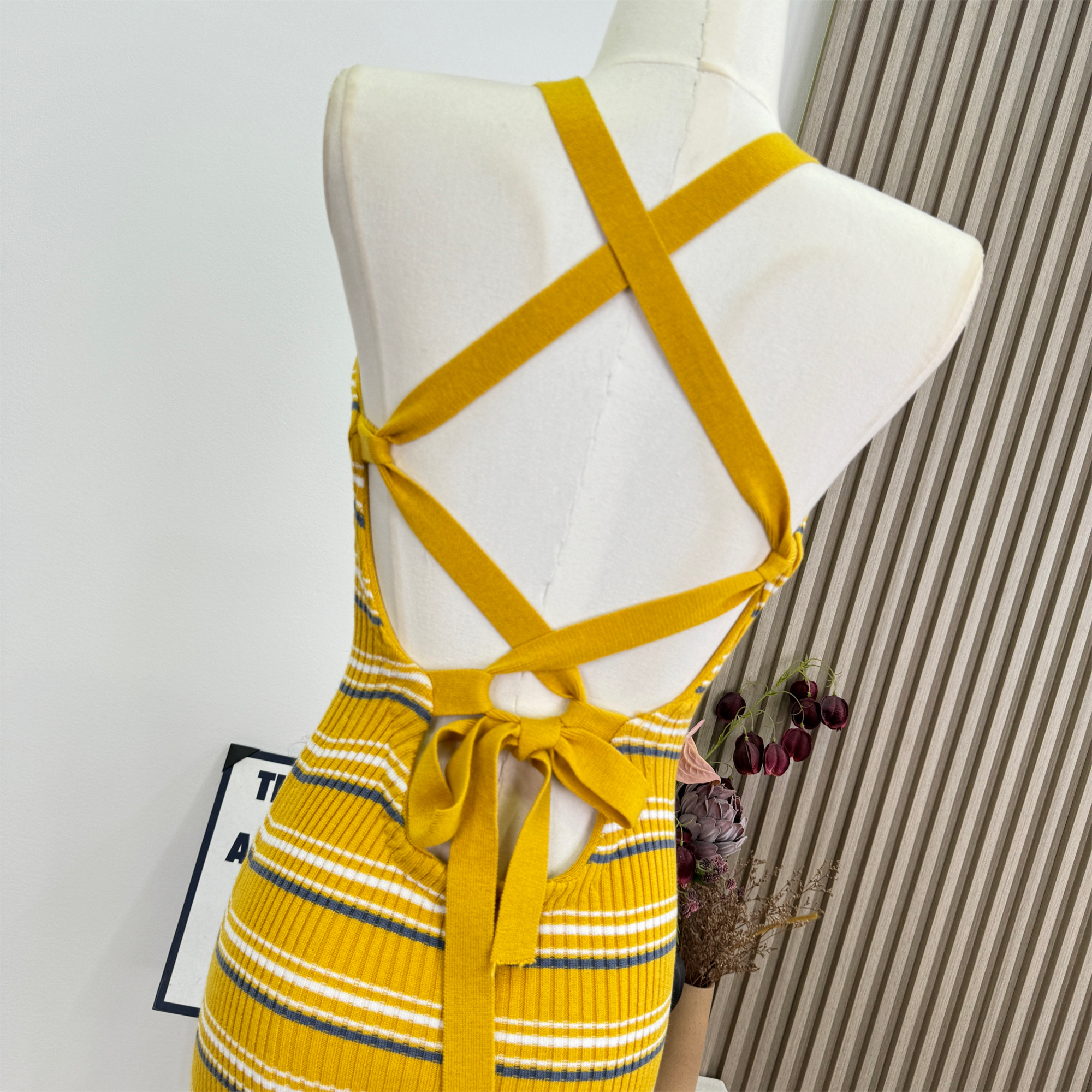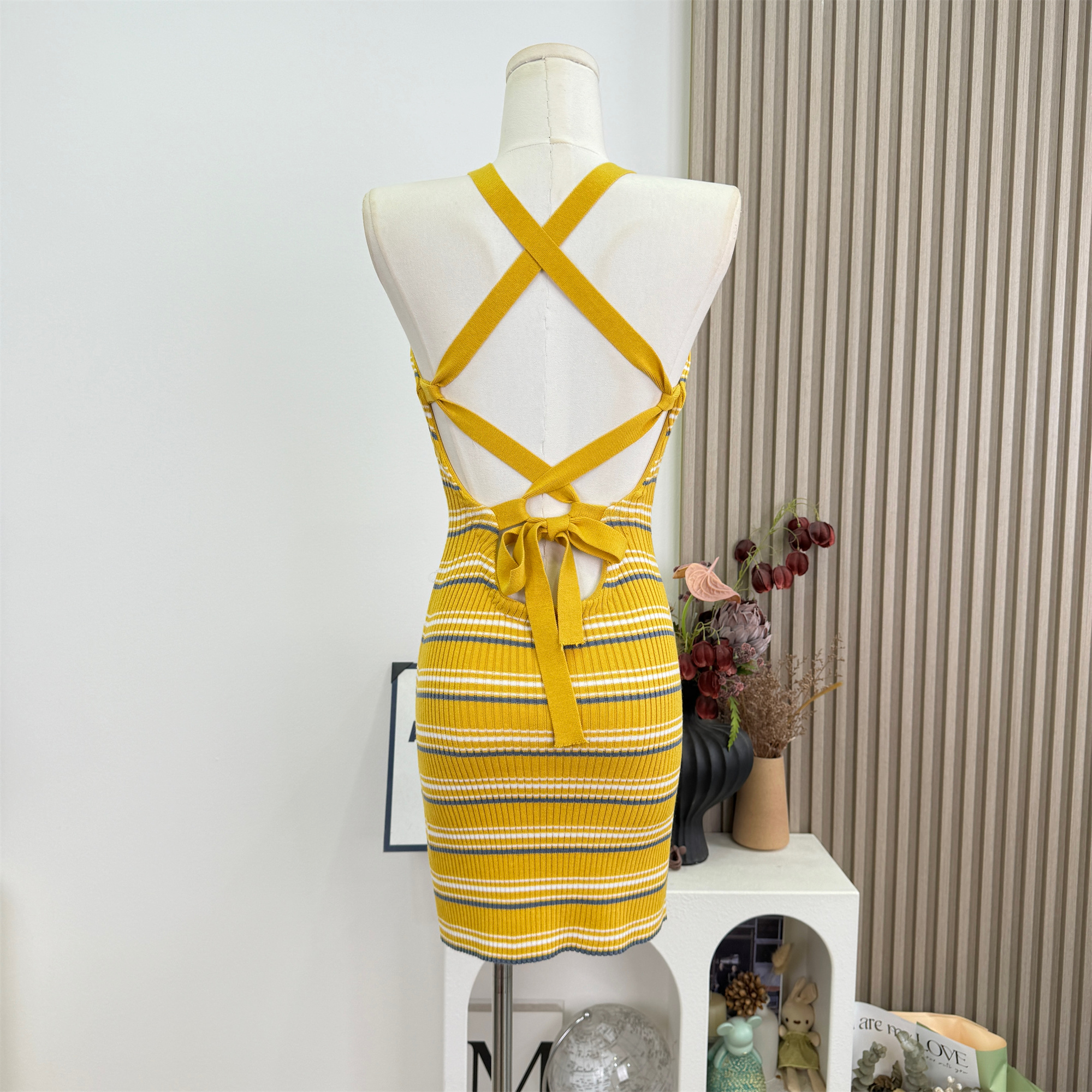 안녕하세요. 팬 팬 sunny girl 배색 끈 백리스 니트 원피스 샤오시엔 스트라이프 조끼