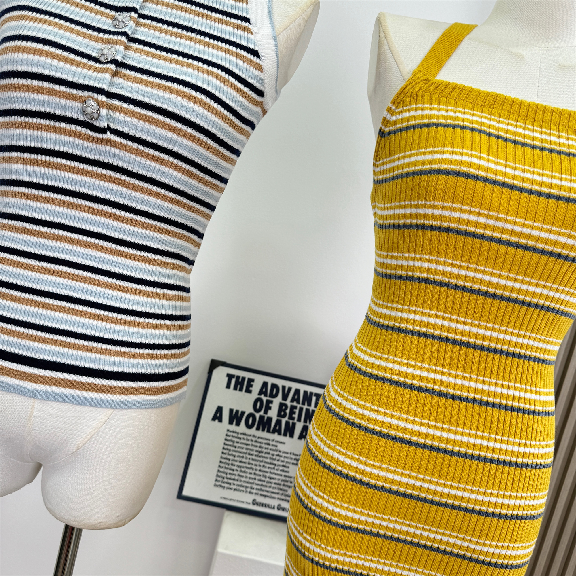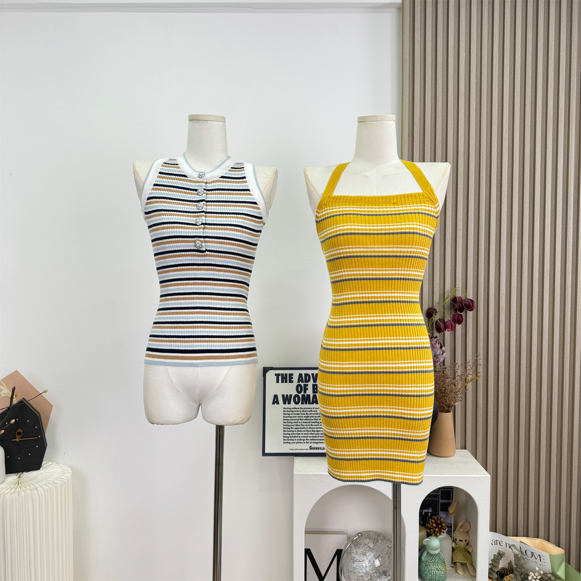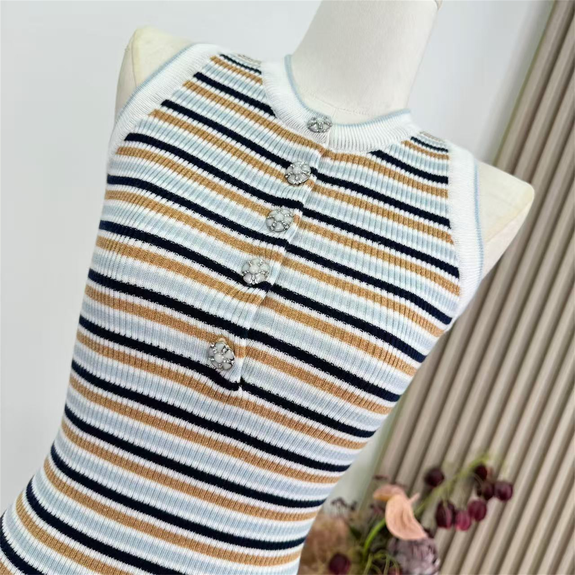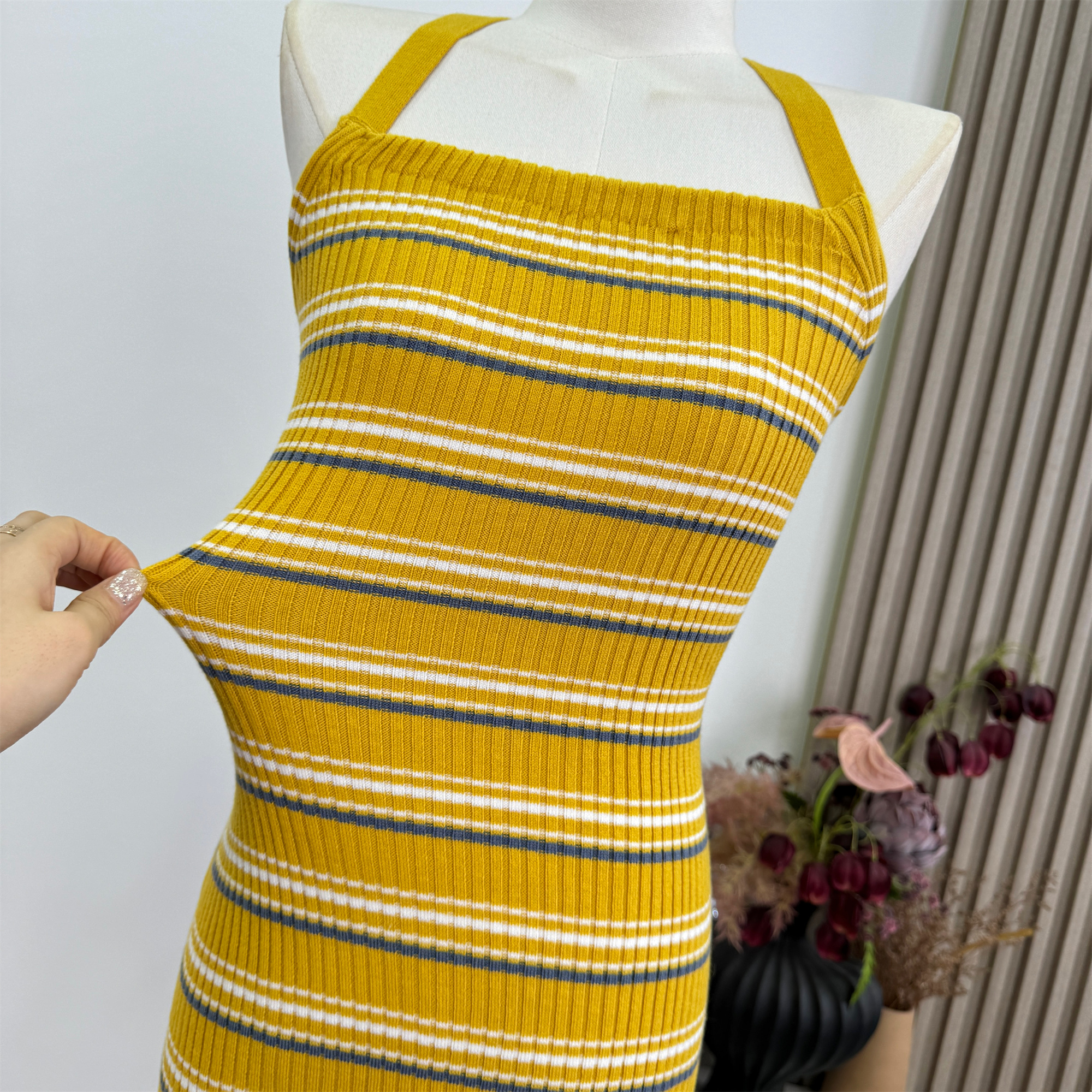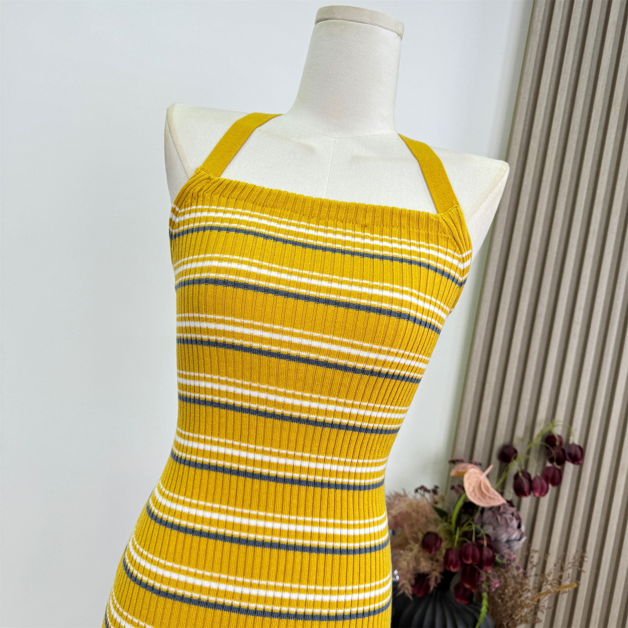 안녕하세요. 팬 팬 sunny girl 배색 끈 백리스 니트 원피스 샤오시엔 스트라이프 조끼
