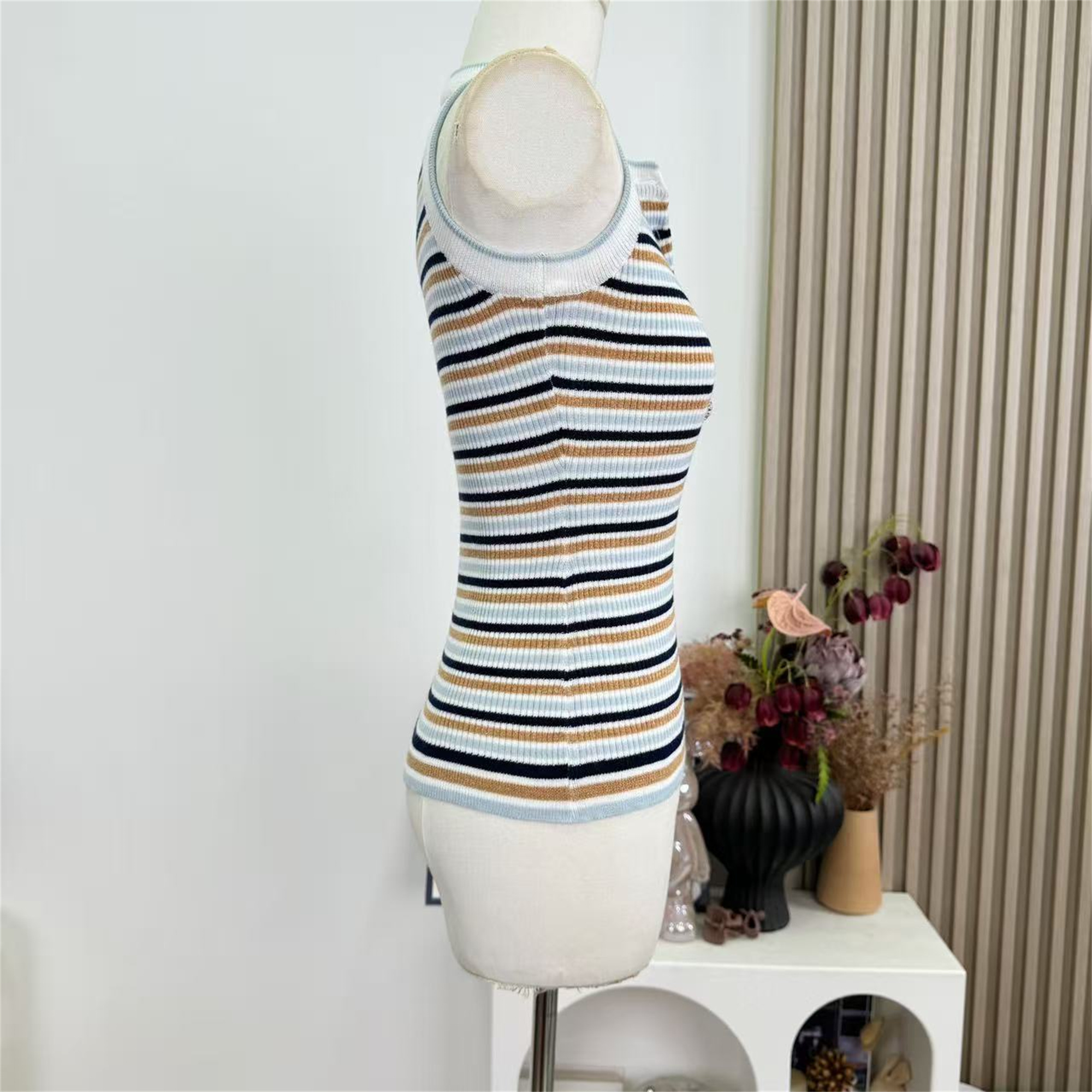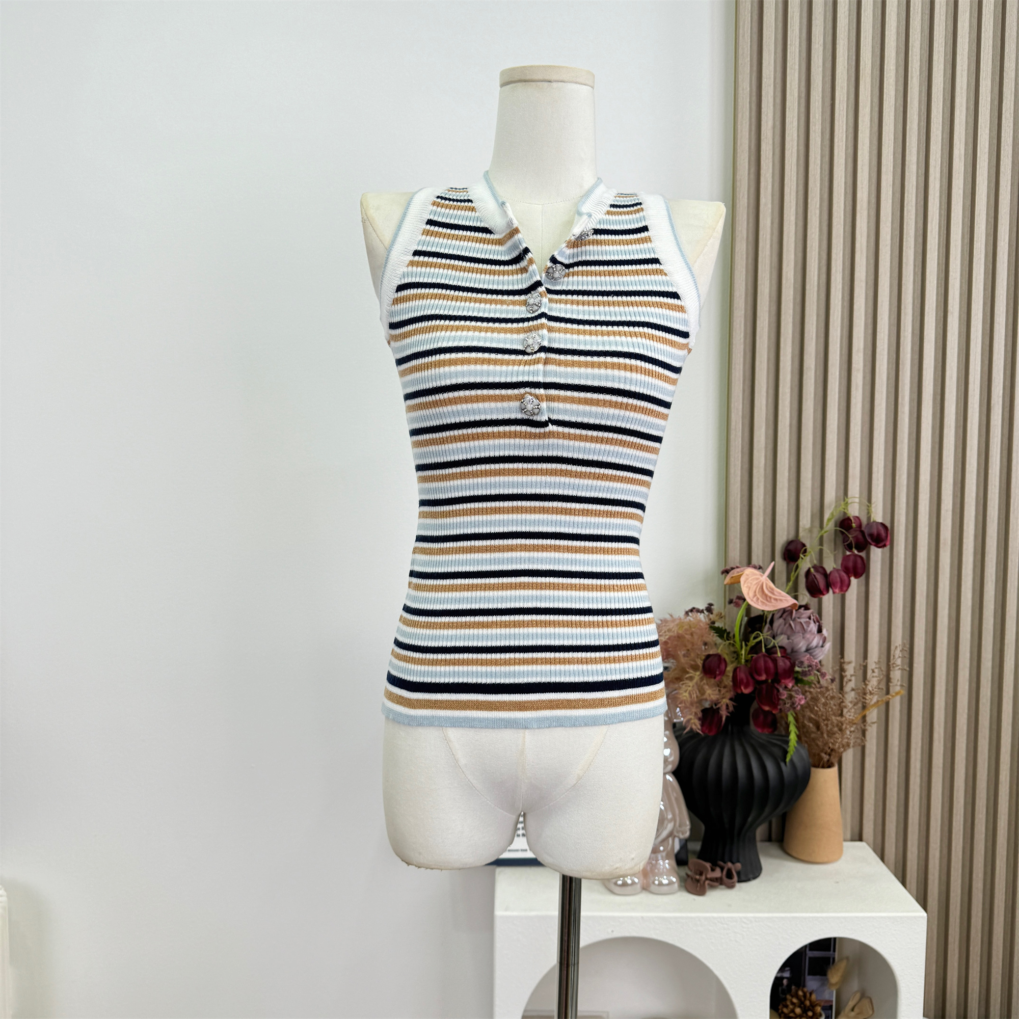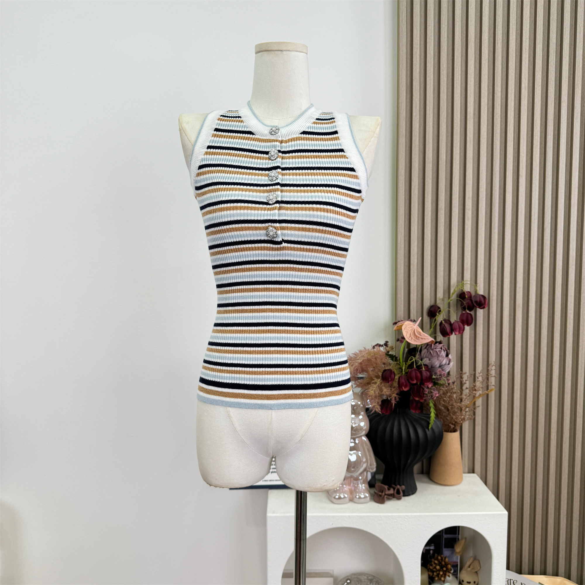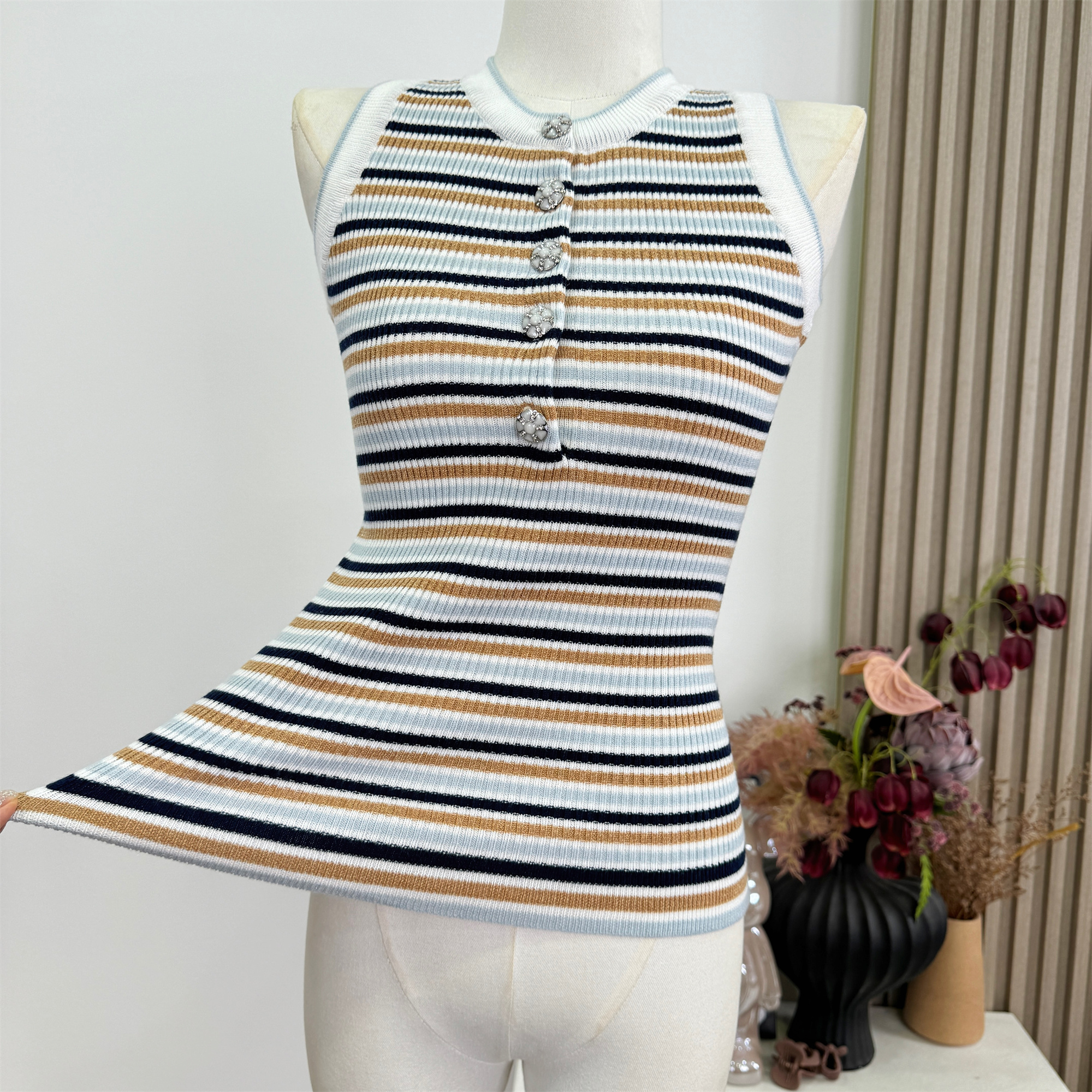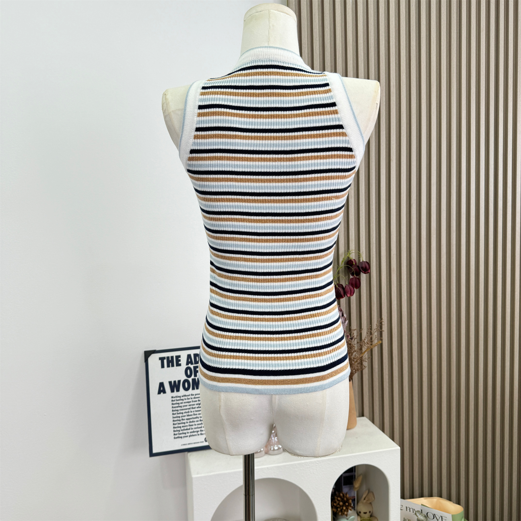 안녕하세요. 팬 팬 sunny girl 배색 끈 백리스 니트 원피스 샤오시엔 스트라이프 조끼