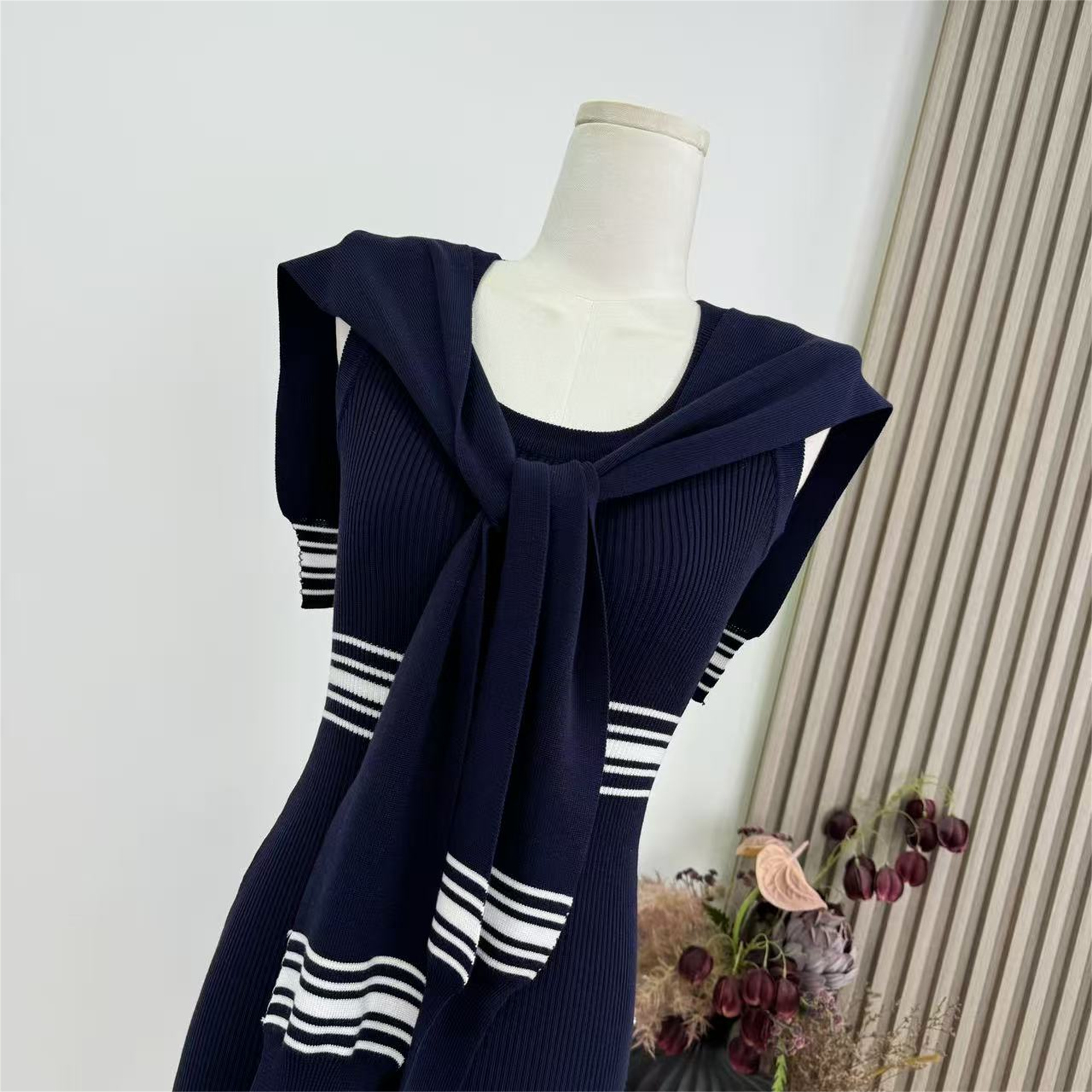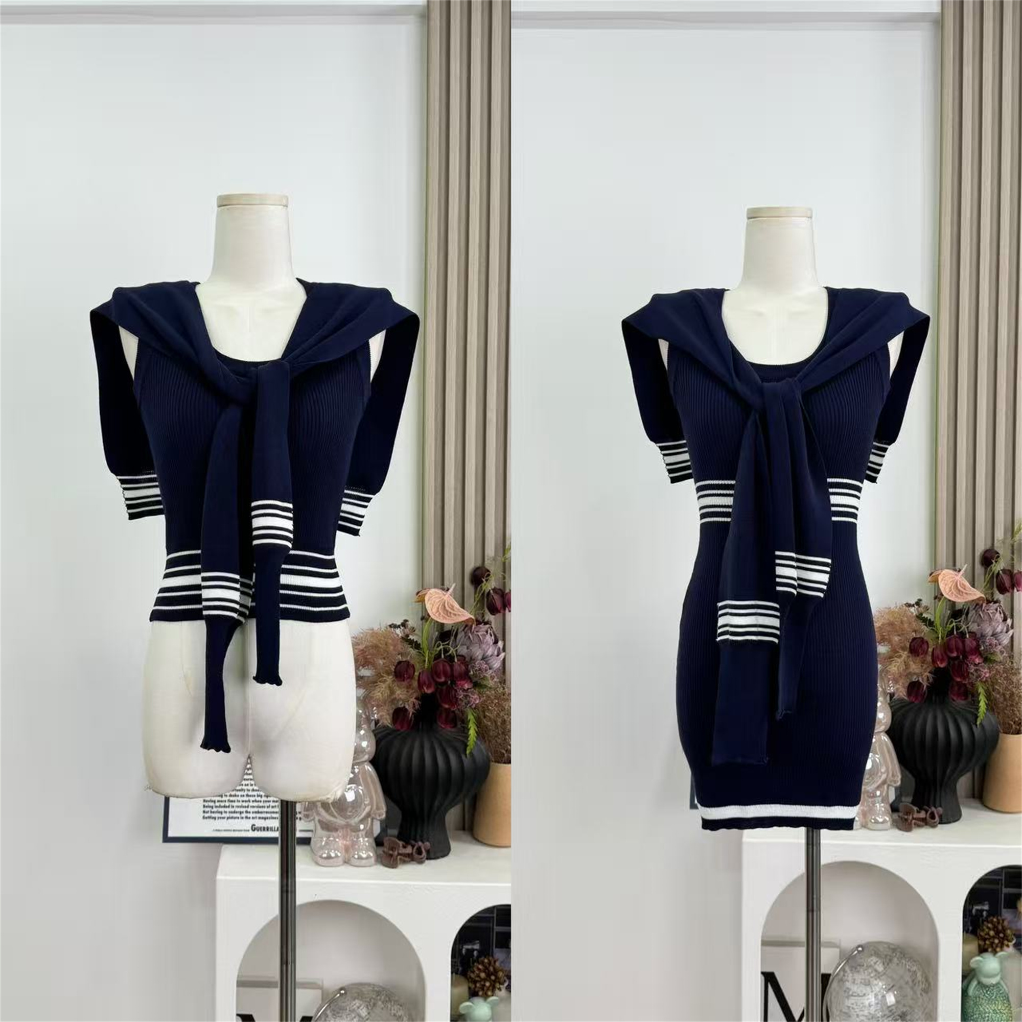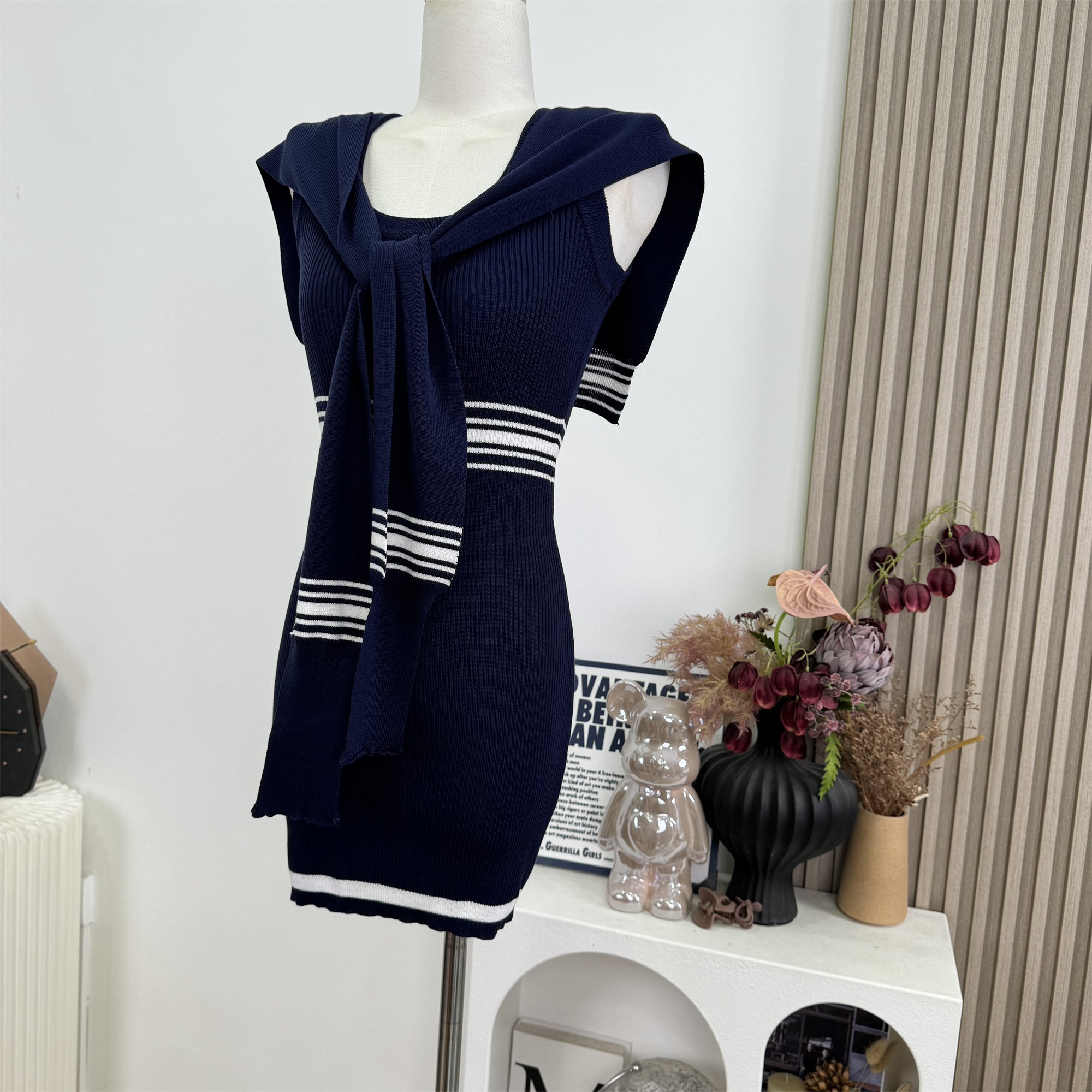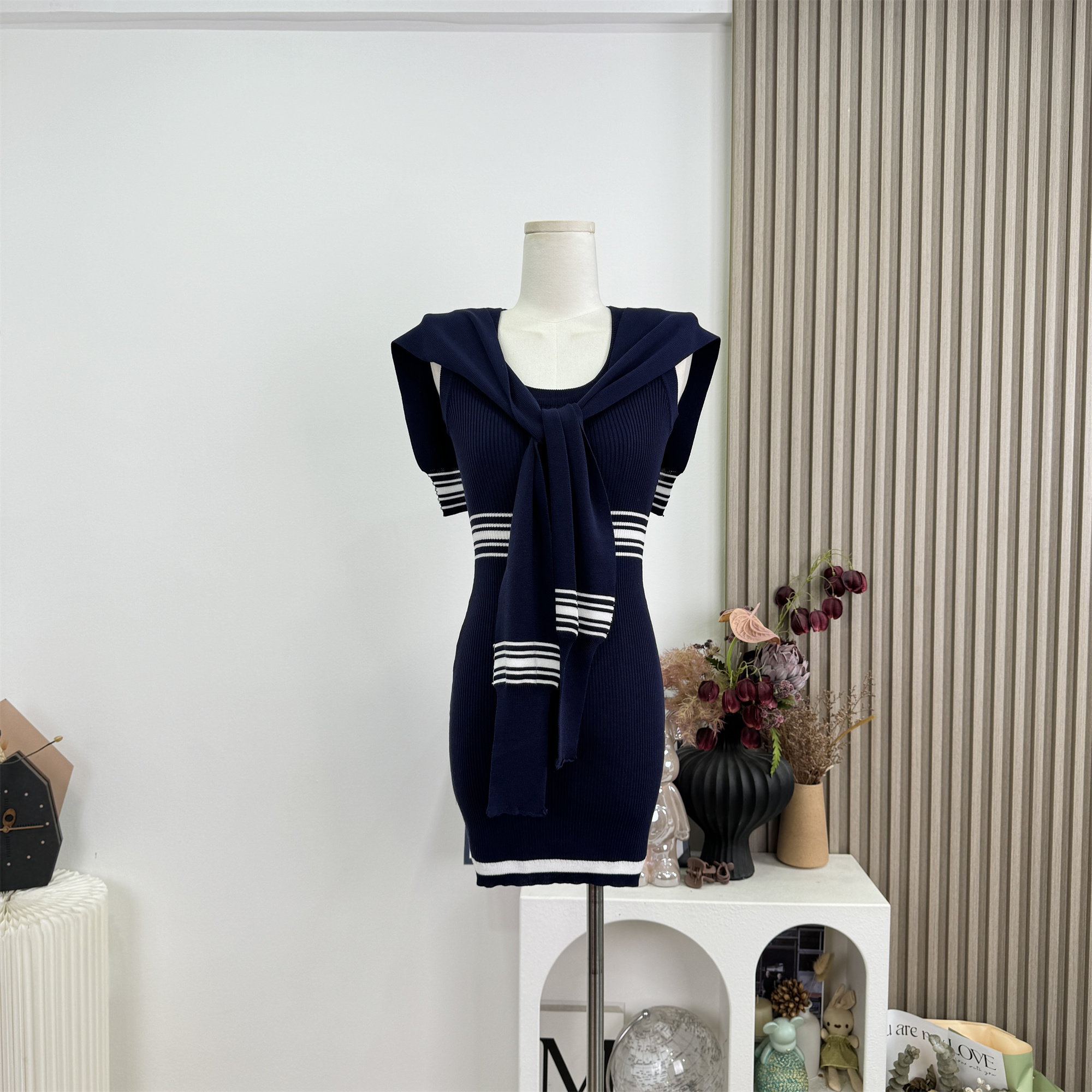 안녕하세요. 팬 팬 sunny girl 배색 끈 백리스 니트 원피스 샤오시엔 스트라이프 조끼