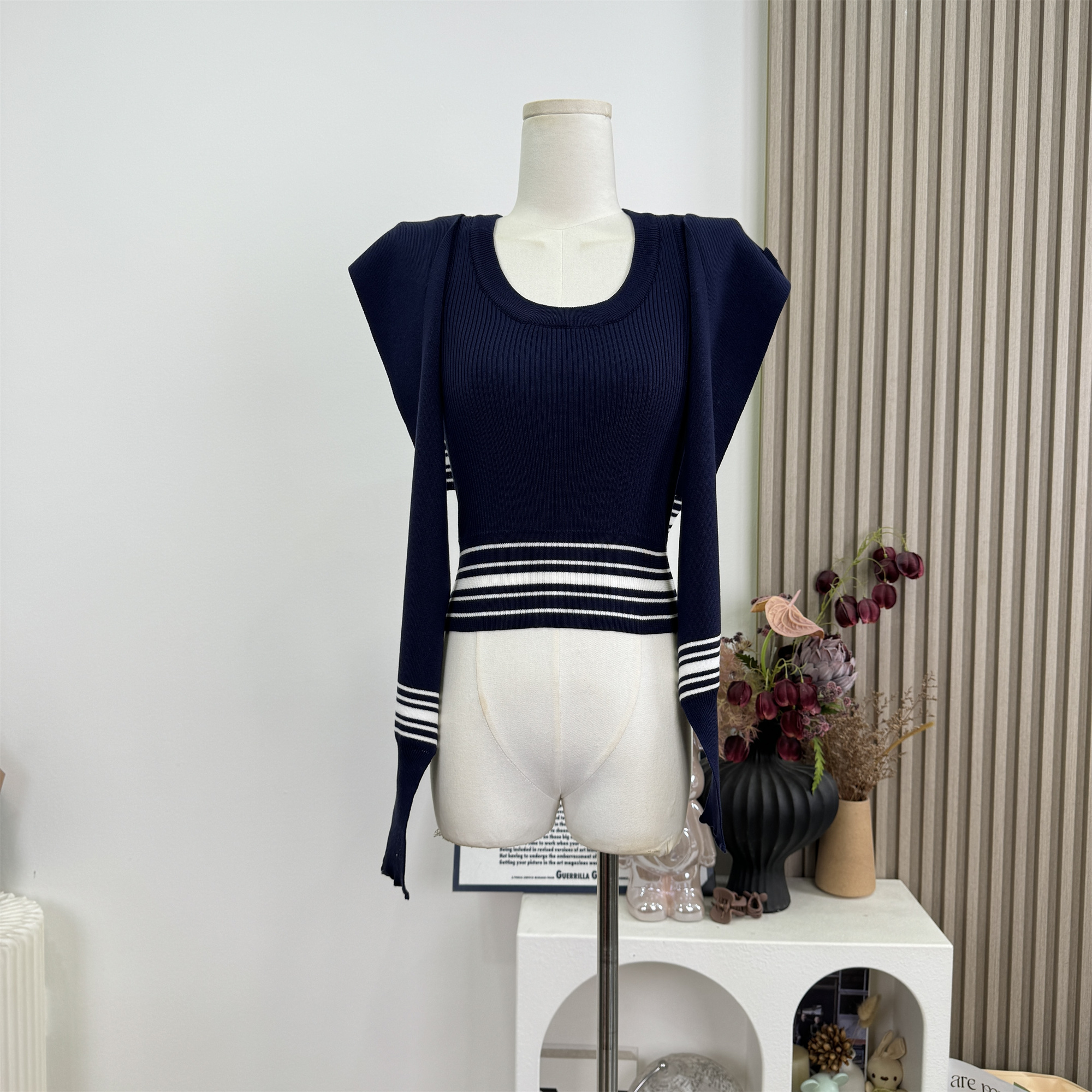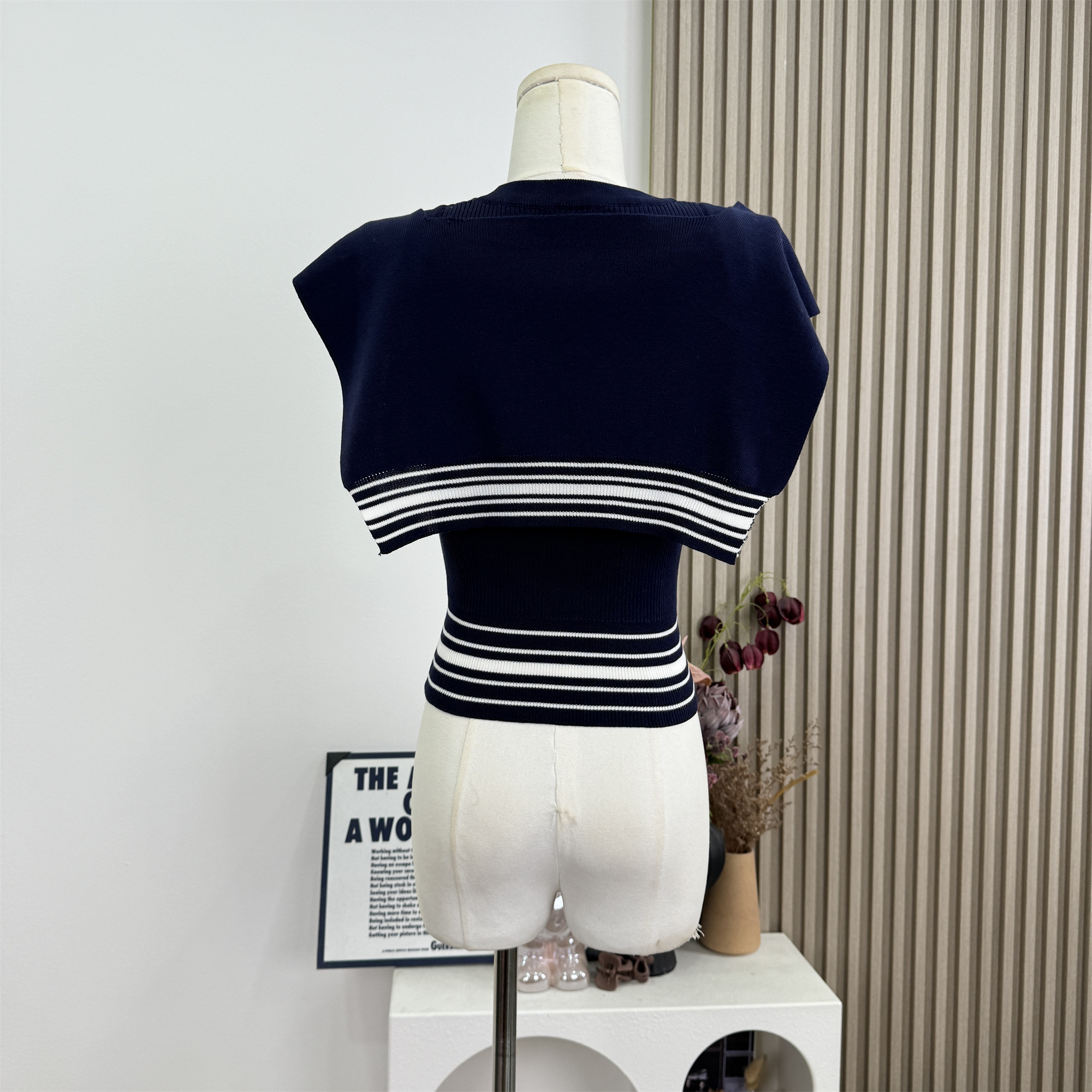 kikimy 암퇘지 훈련 순간 높음 폭탄 맞춤 니트 가로 줄무늬 홀로우 아웃 망사 패치워크 조끼 반 스커트 세트