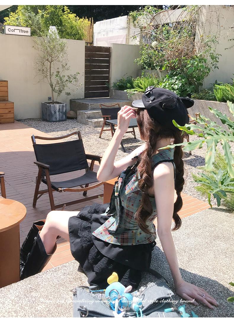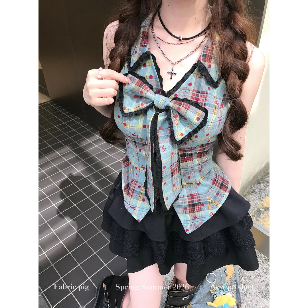 녹색 잉크 달콤한 라스베리 직물 돼지 오리지널 아메리칸 레트로 달콤한 차가운 바람 체크무늬 민소매 맨위 여성 여름 나비 매듭 셔츠