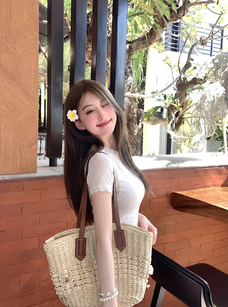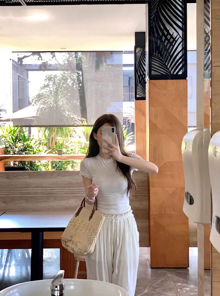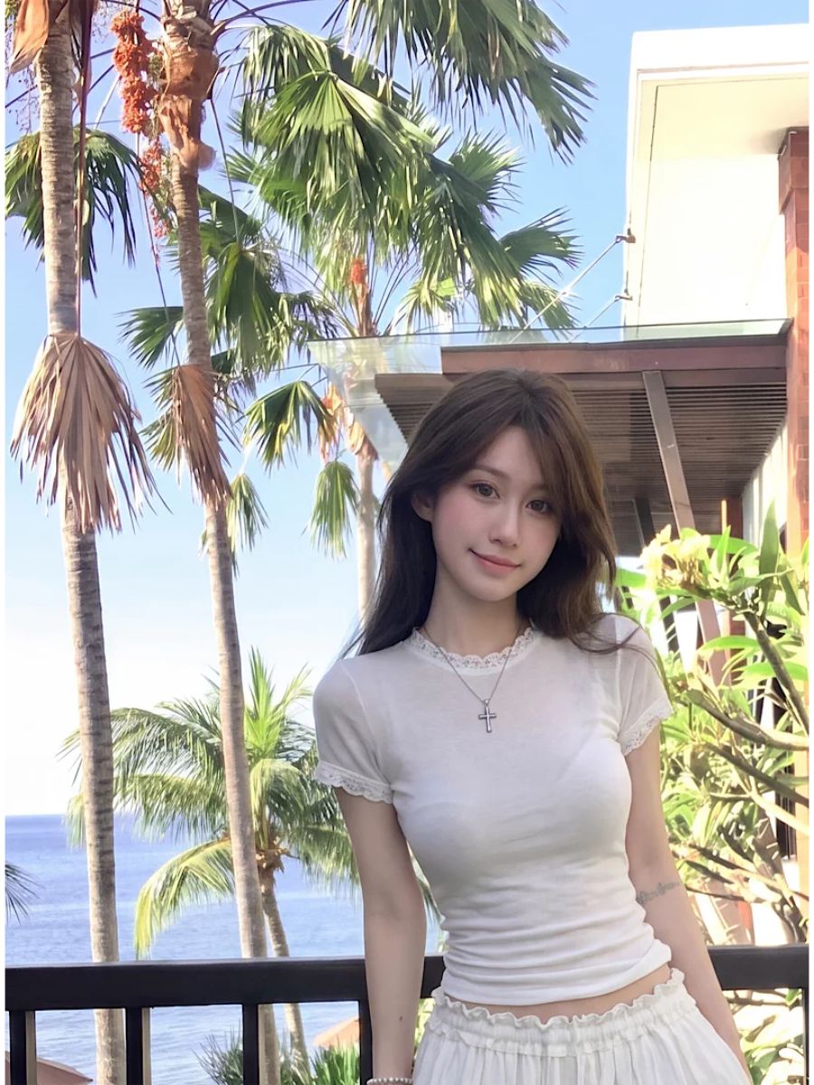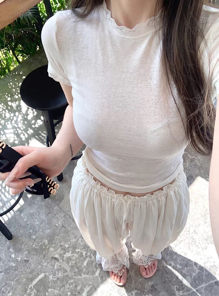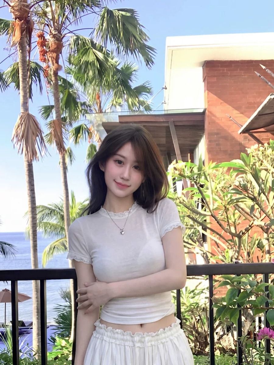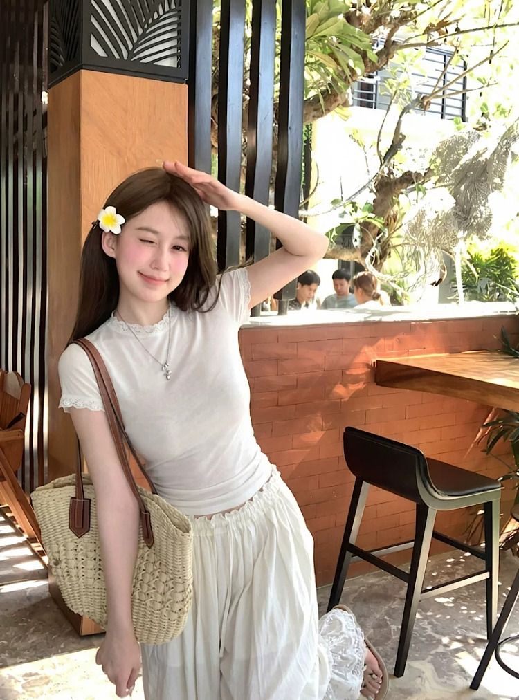 눈꽃 면 프랑스식 레이스 조각 라운드 넥 긍정적 인 어깨 반팔 티셔츠 여성 여름 디자인 센스 몸매 가꾸기 핫걸 맨위