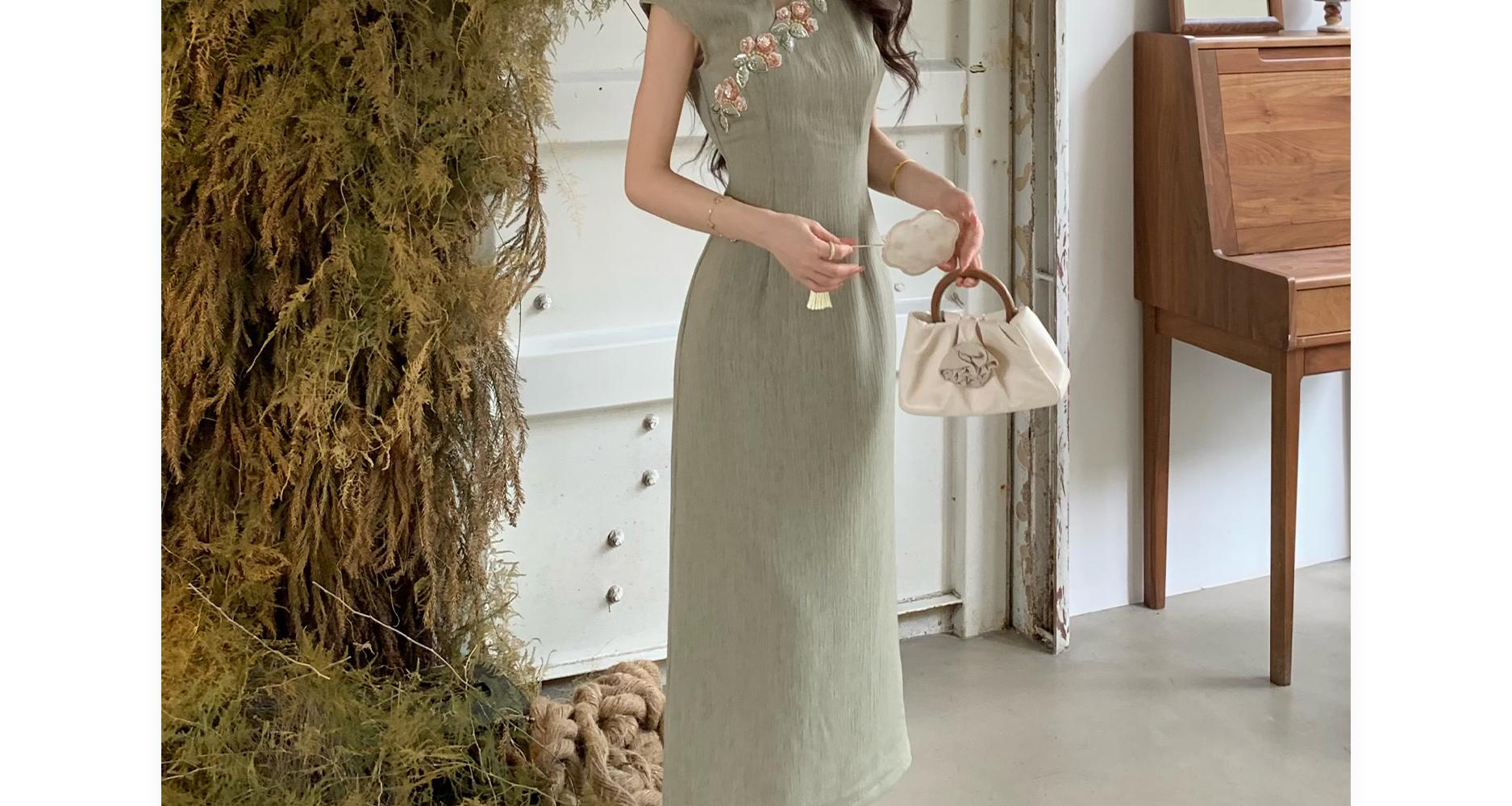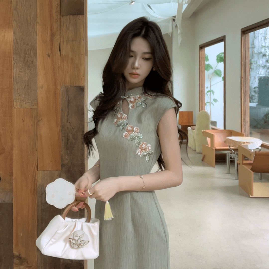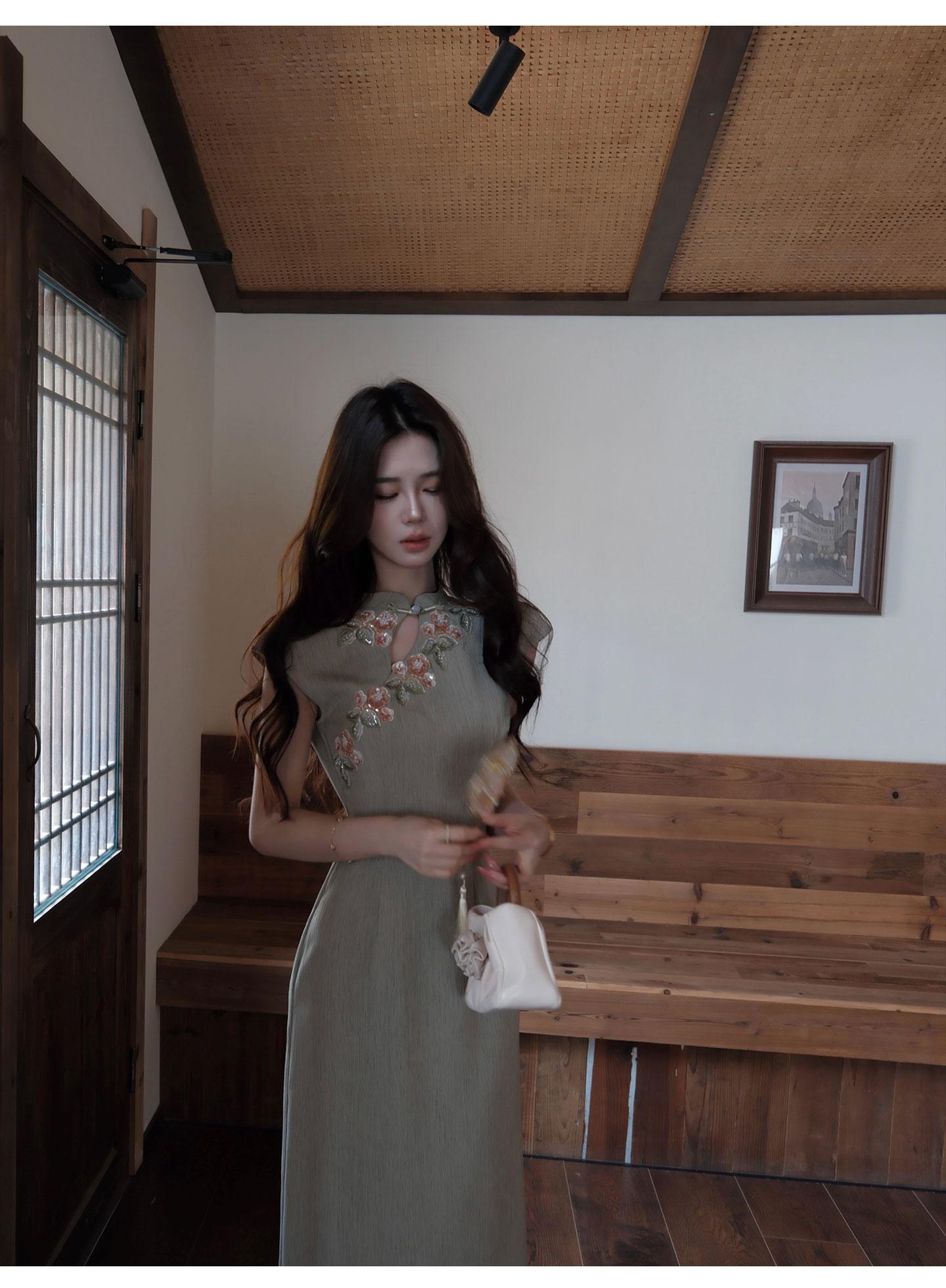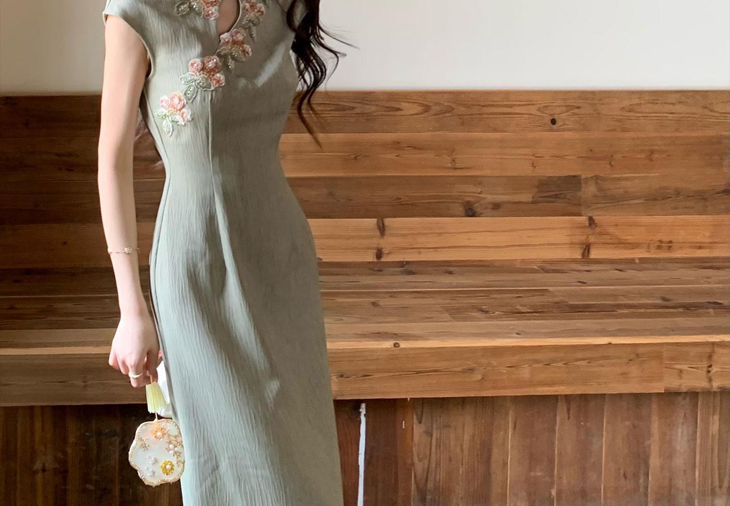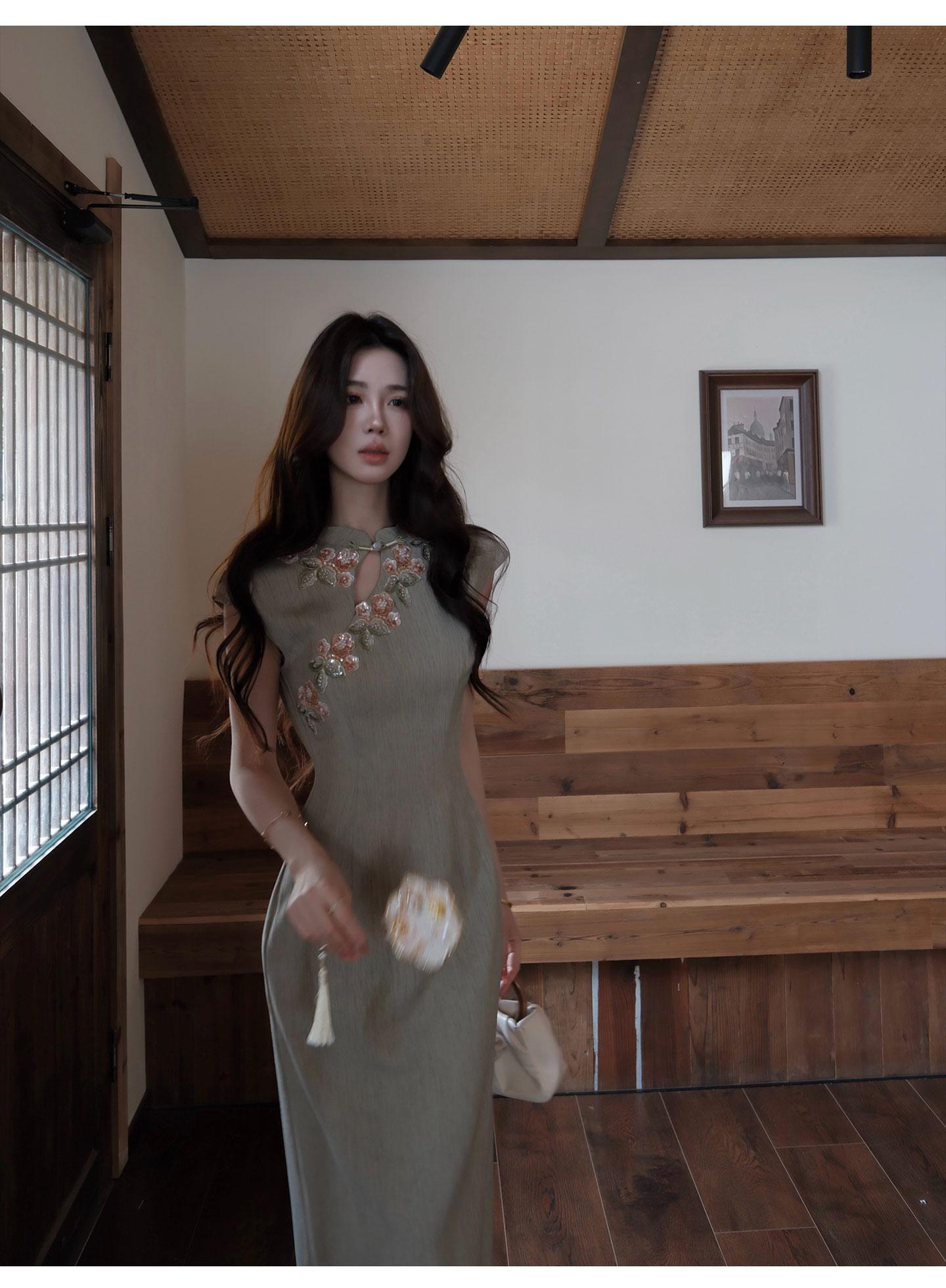 무쯔리 목자이 ~ 중 리 잉크 켜기 서리 꽃 품격 분위기 센스 홀로우 아웃 꽃 패치워크 새로운 중식 드레스