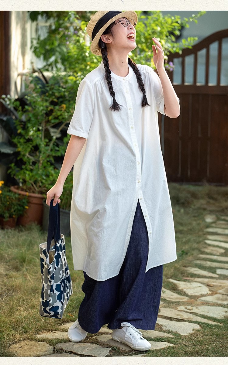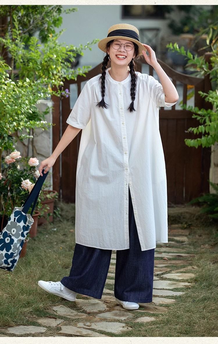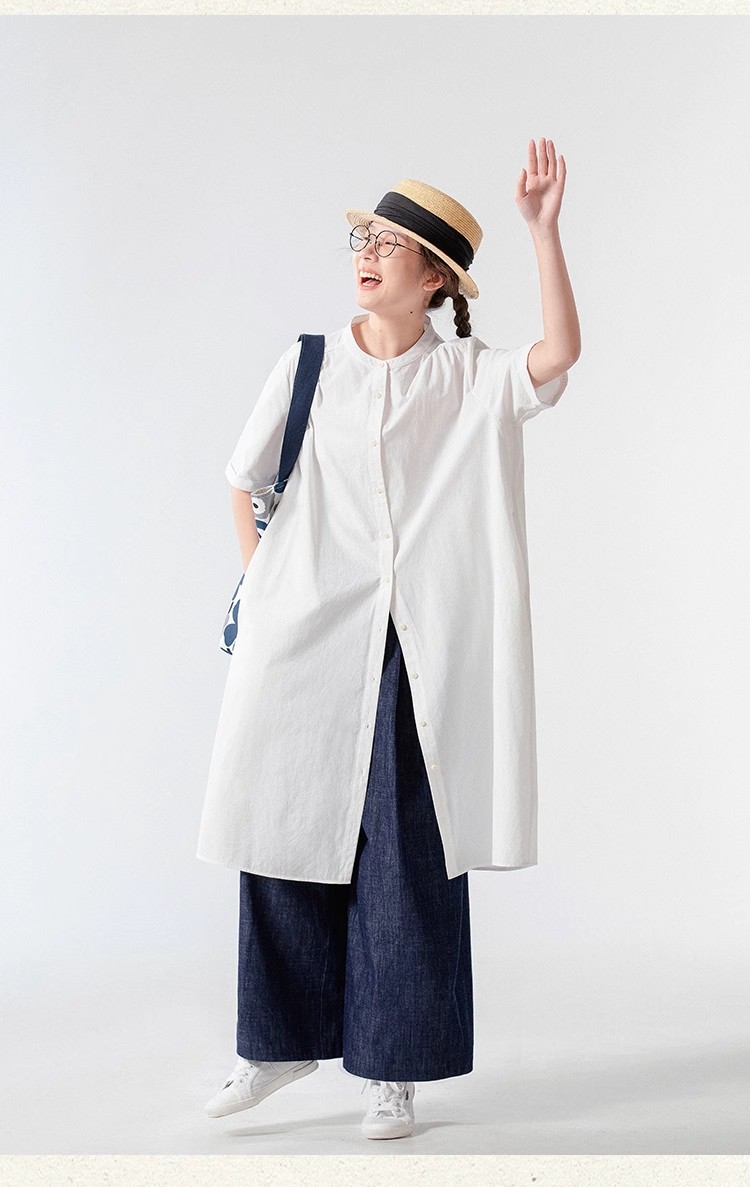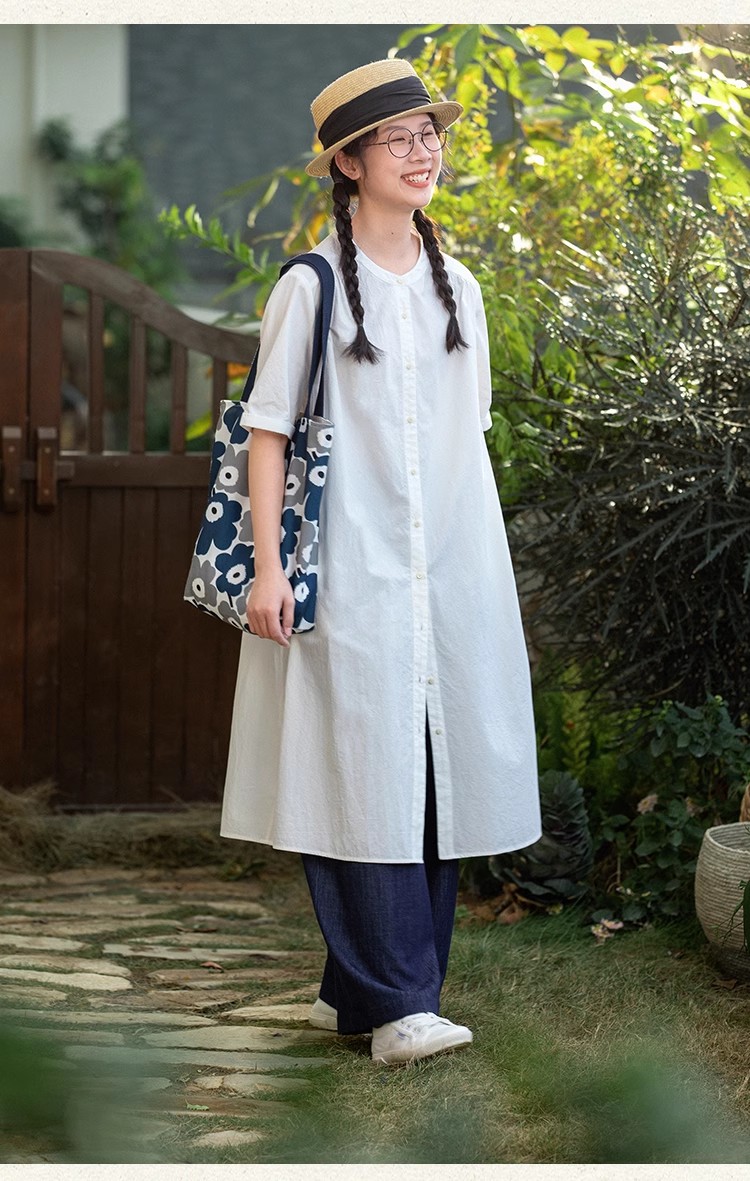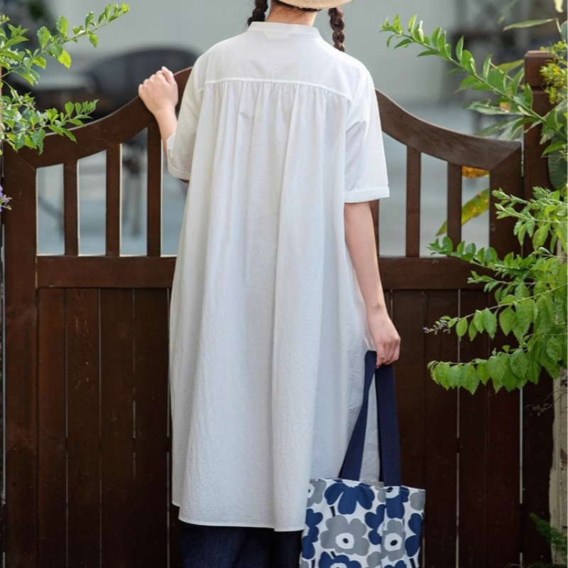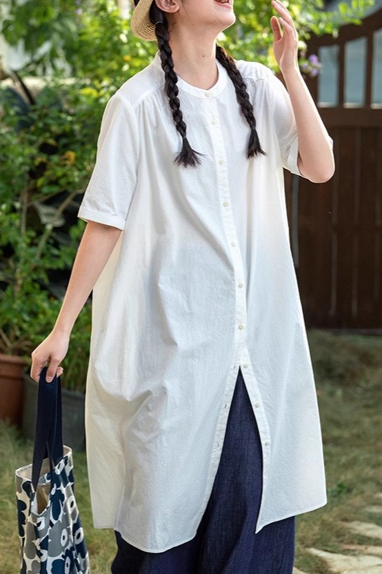 대외 무역 오리지널 일본식 화이트 롱 코트 여성 셔츠 루즈핏 캐주얼 작은 키 라운드 넥 순면 스택 착용 셔츠 치마