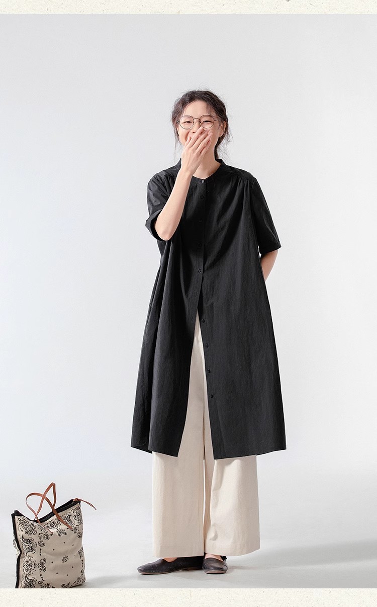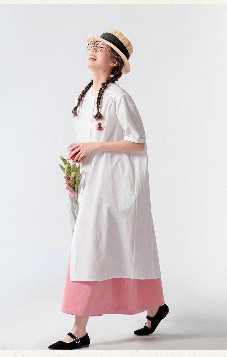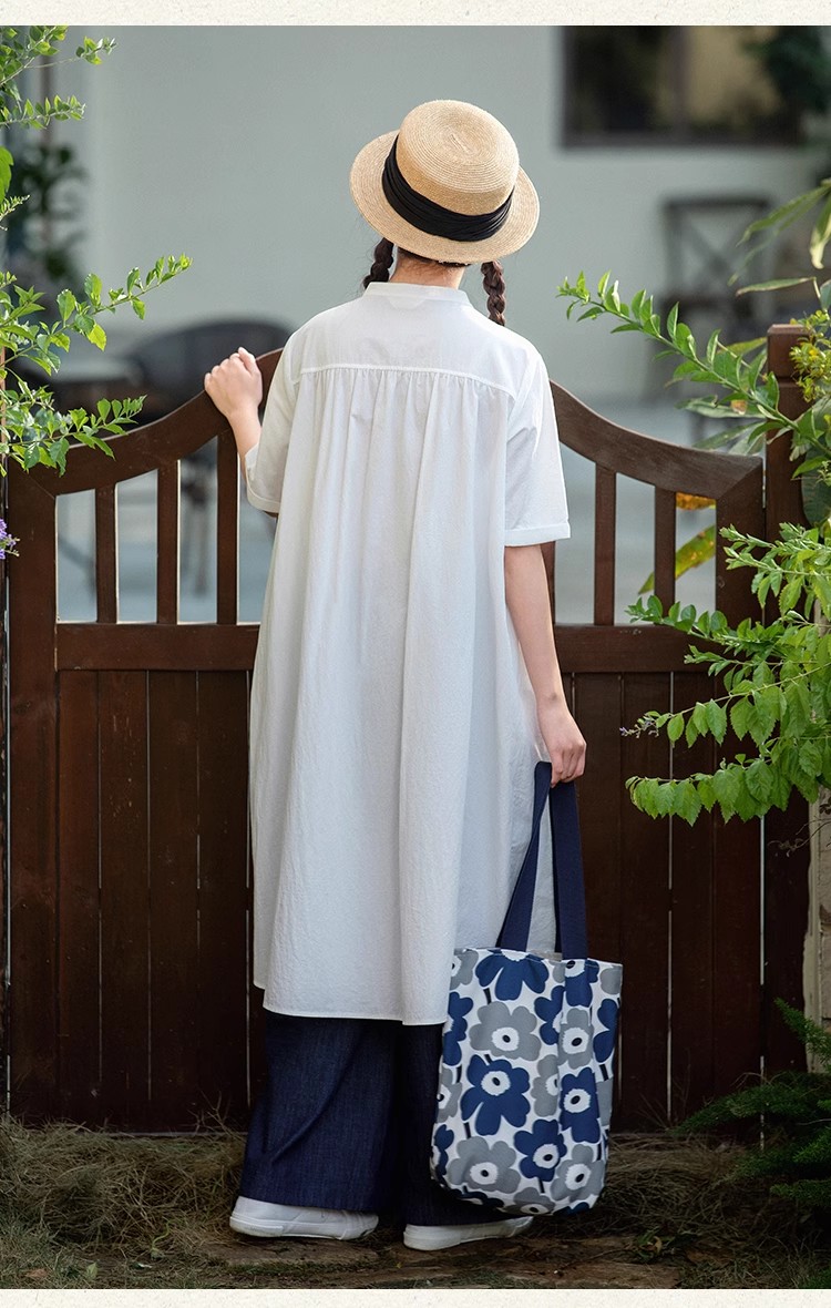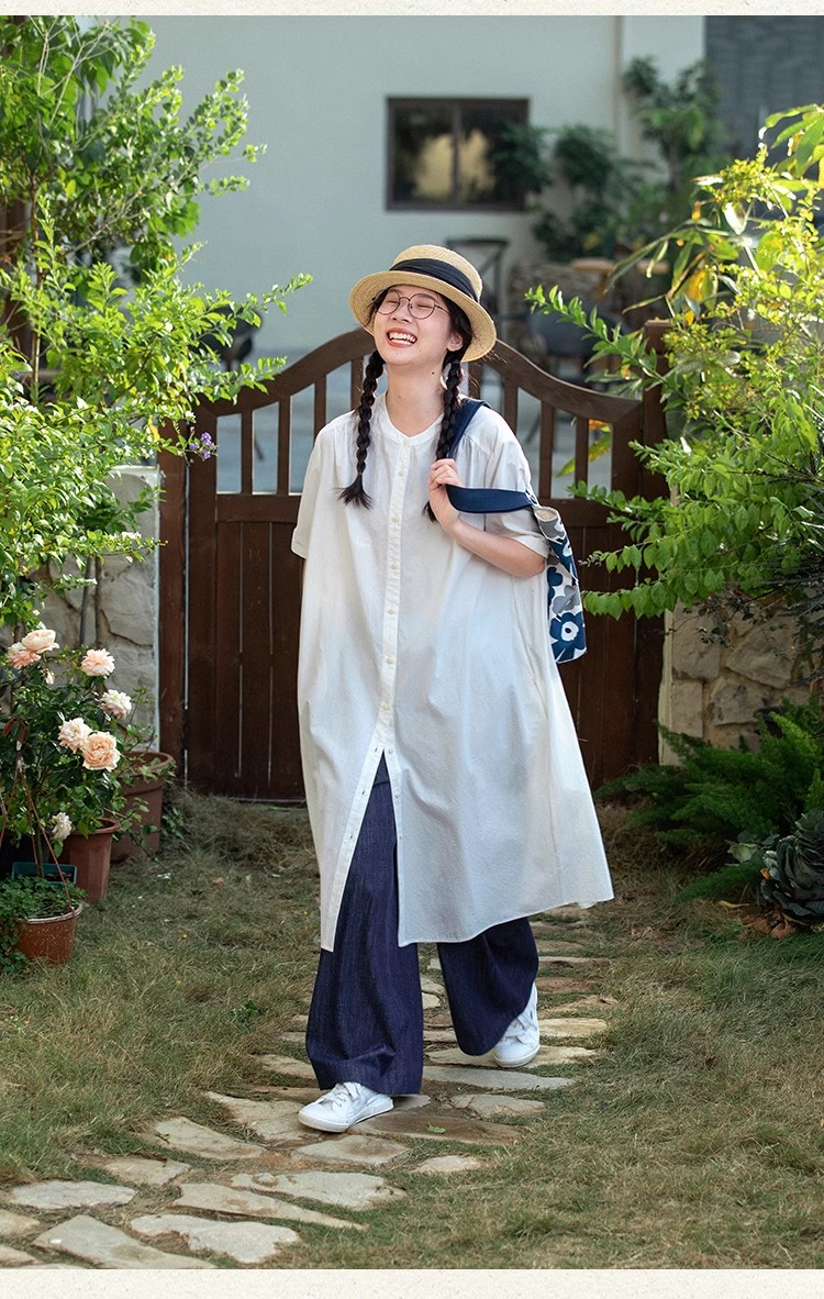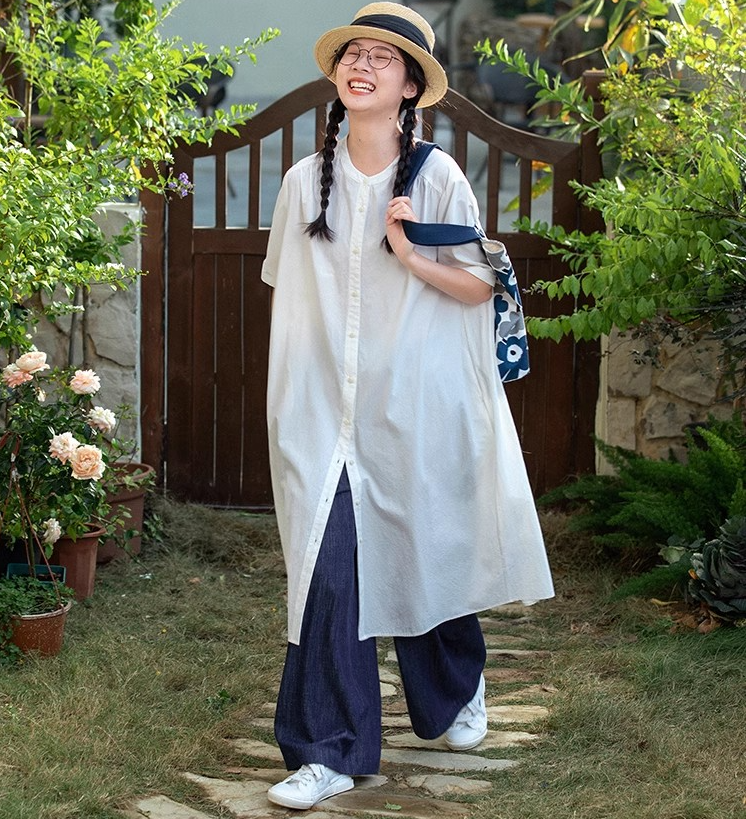 대외 무역 오리지널 일본식 화이트 롱 코트 여성 셔츠 루즈핏 캐주얼 작은 키 라운드 넥 순면 스택 착용 셔츠 치마