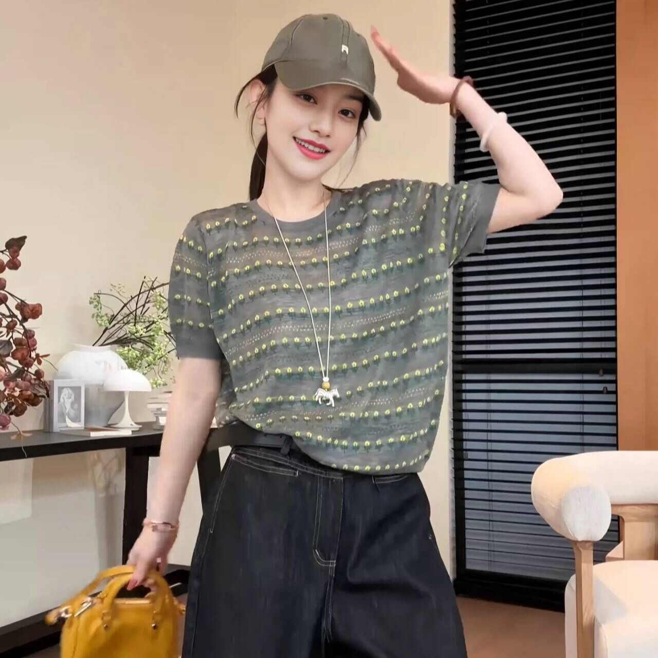 2026 새로운 작은 말 자수 라운드 넥 니트 티셔츠 반팔 여성 셔츠