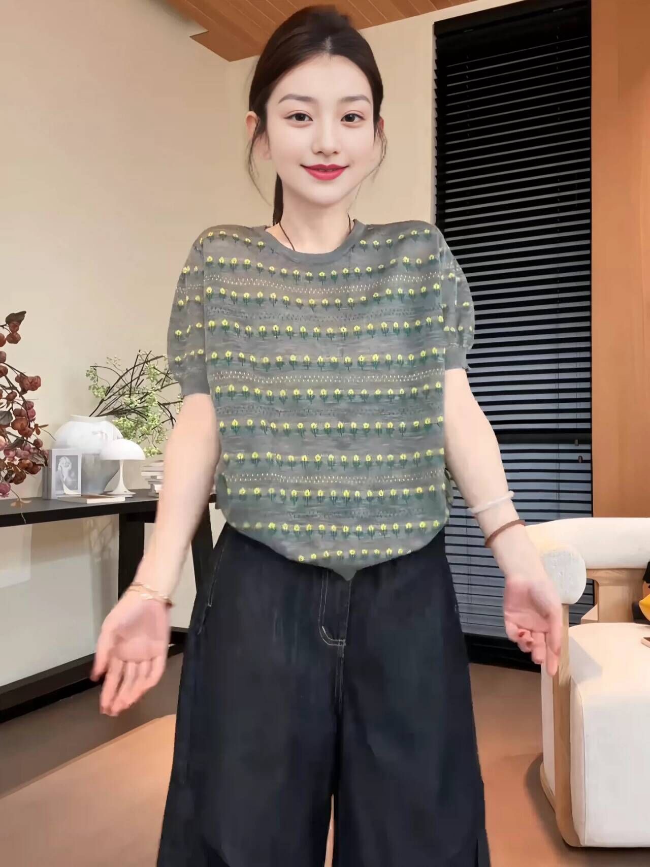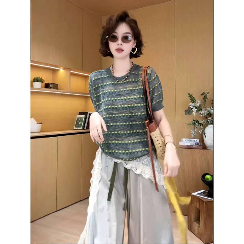 여름 새로운 홀로우 아웃 라운드 넥 배색 니트 반팔 연령 감소 티셔츠 맨위 다용도 슬림해 보이는