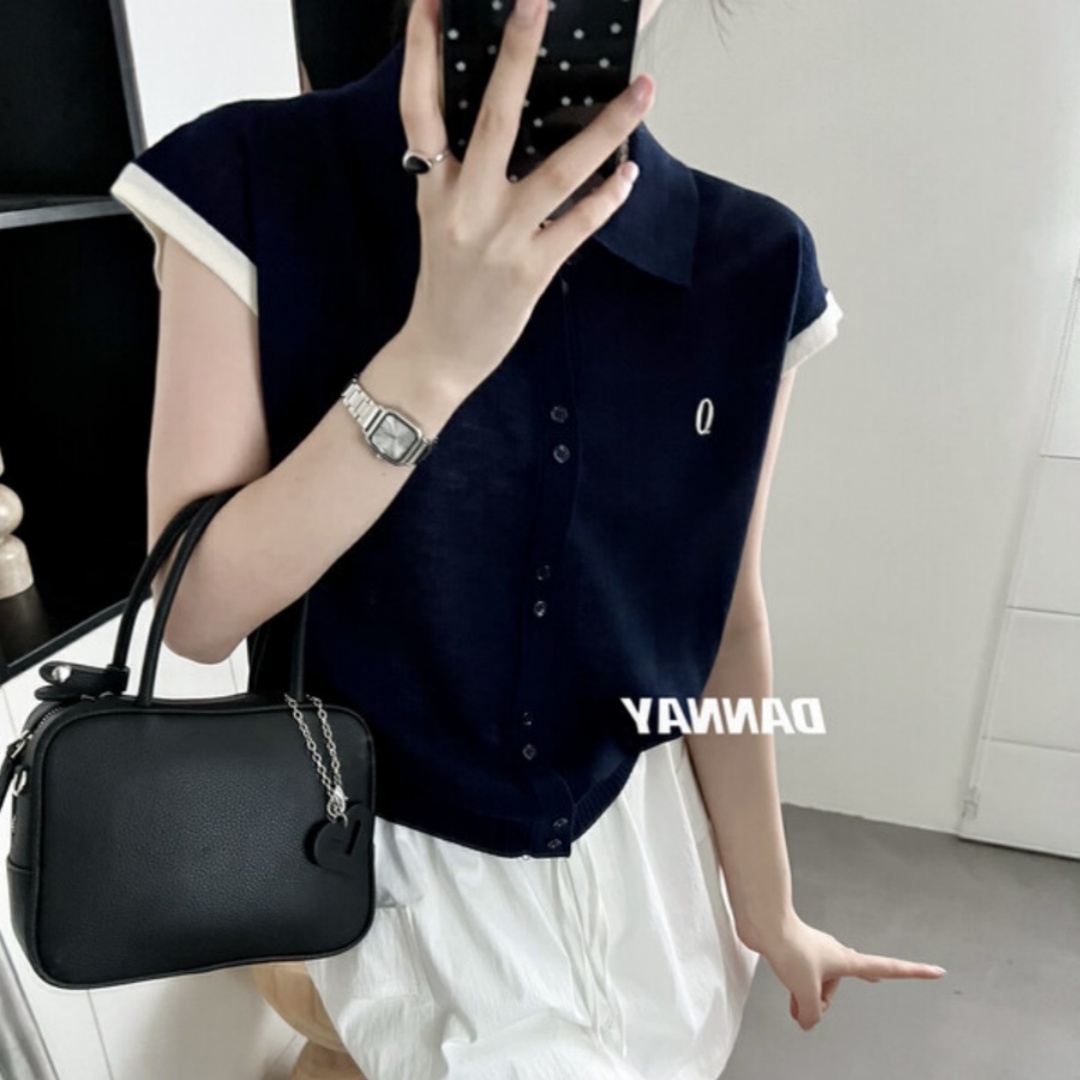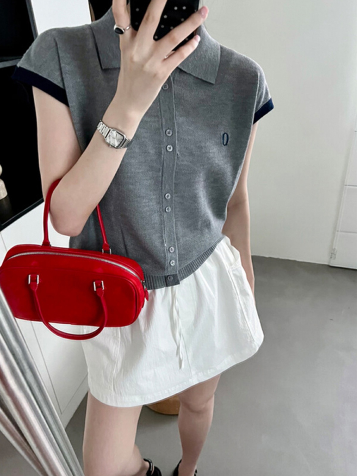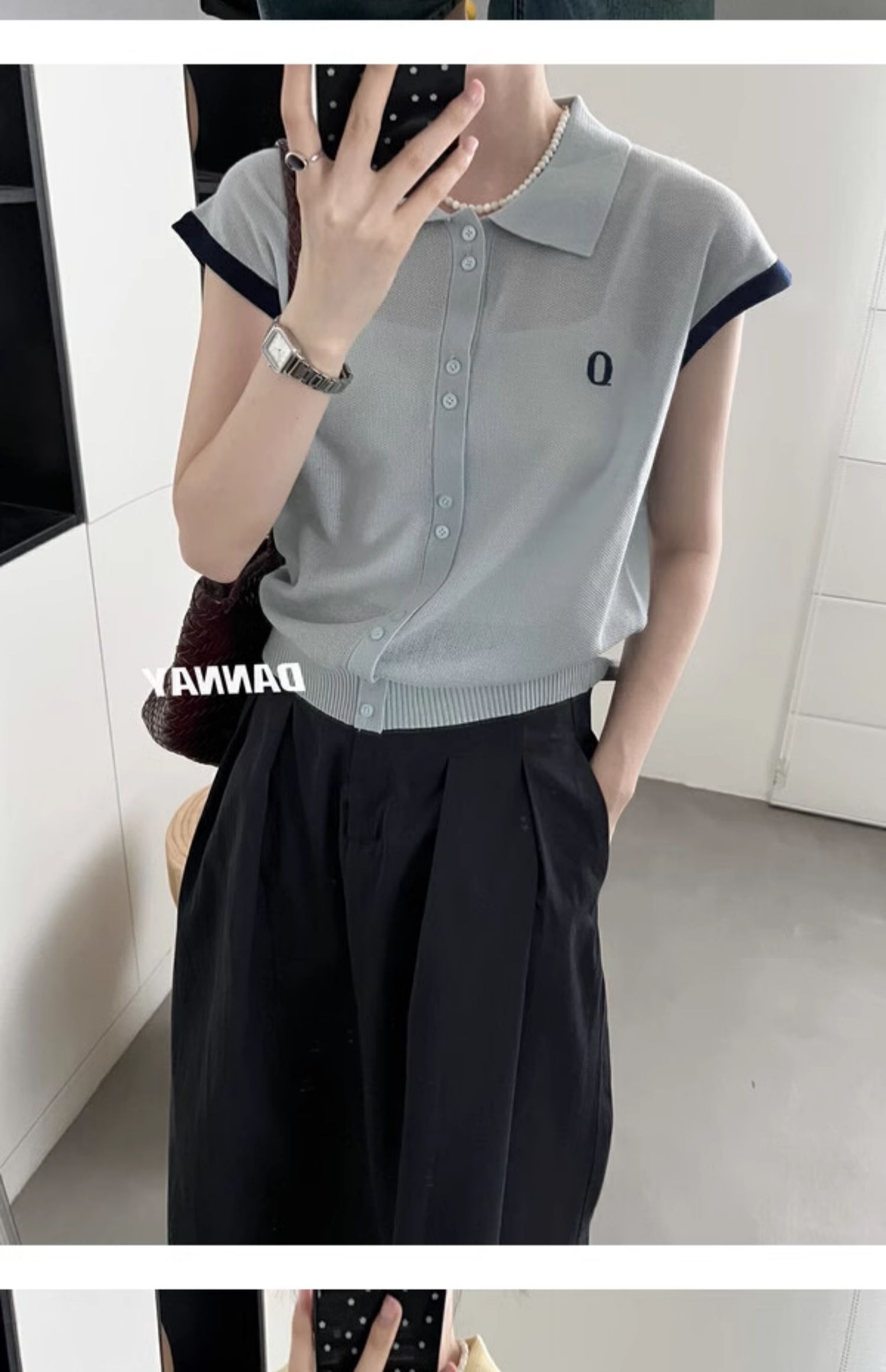 회색 POLO 셔츠 폴로 칼라 반팔 니트 오픈 가디건 여성 여름 디자인 센스 배색 루즈핏 얇은 스타일 작은 날다 소매 맨위