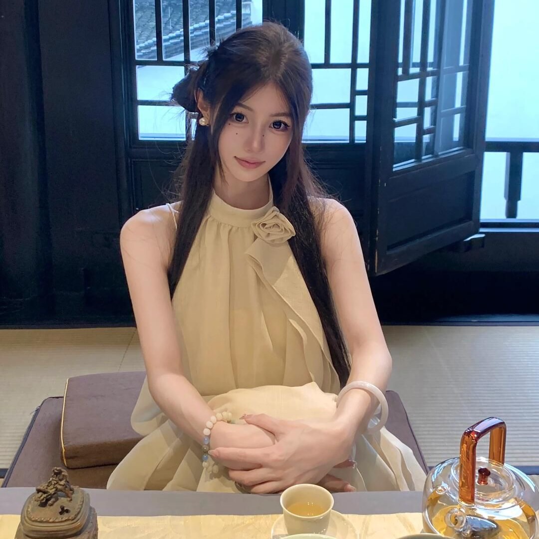 검은 콩 흠 프라임 시간 헤일로 면 린넨 튀김 색상 V넥 행침 목 여성 드레스 여름 허리 수축 레이스업 민소매 롱 스커트