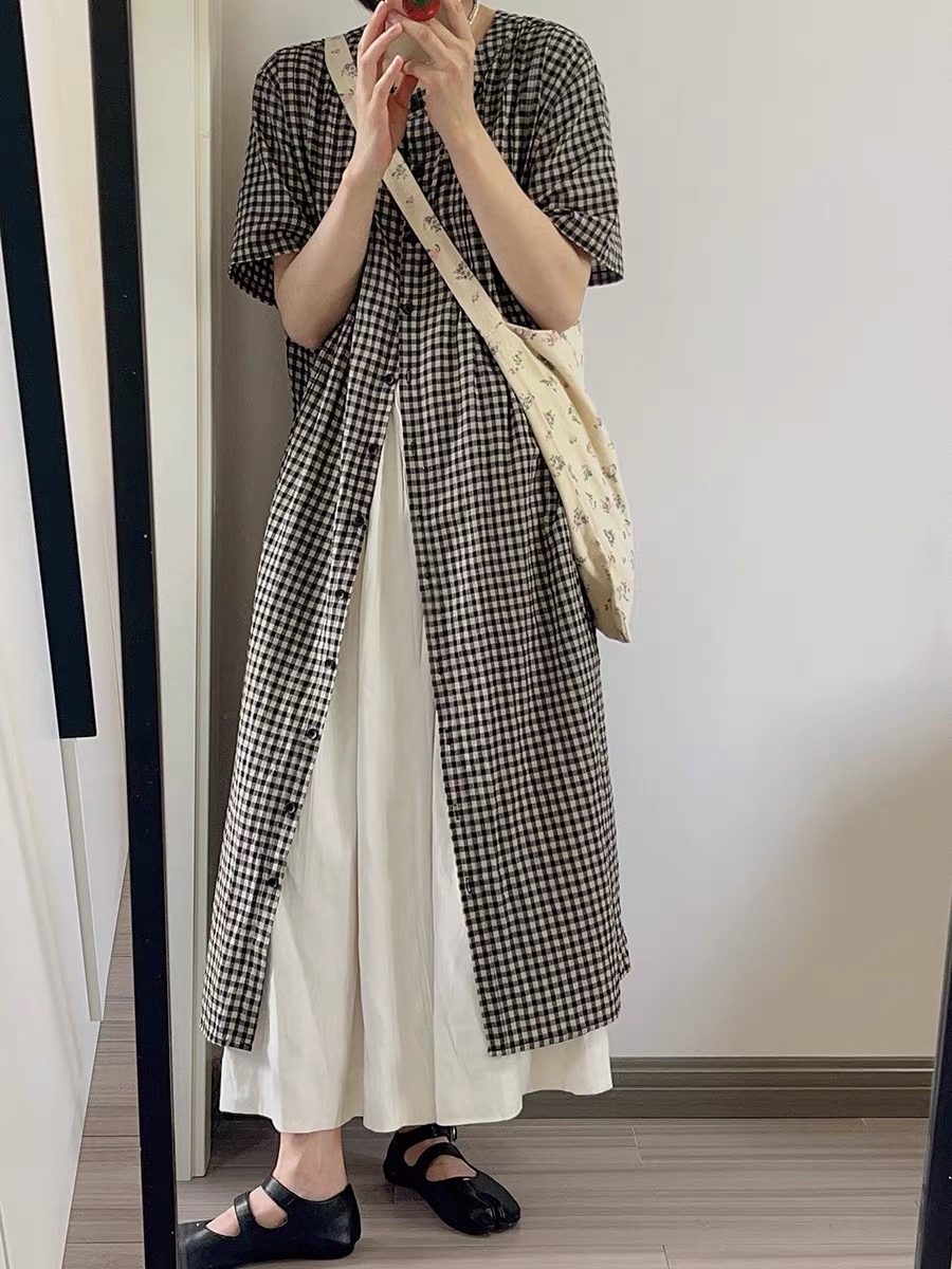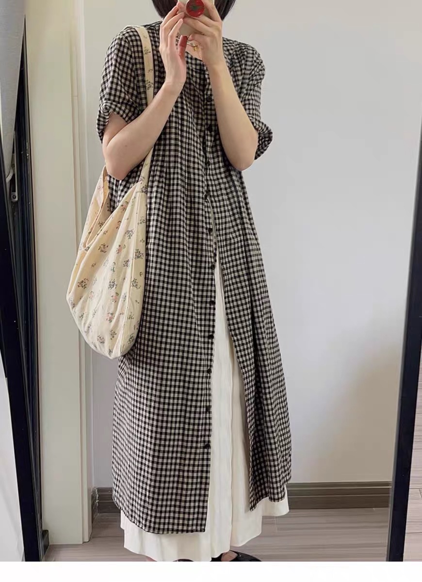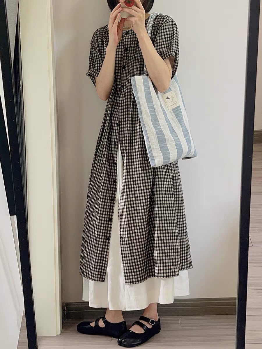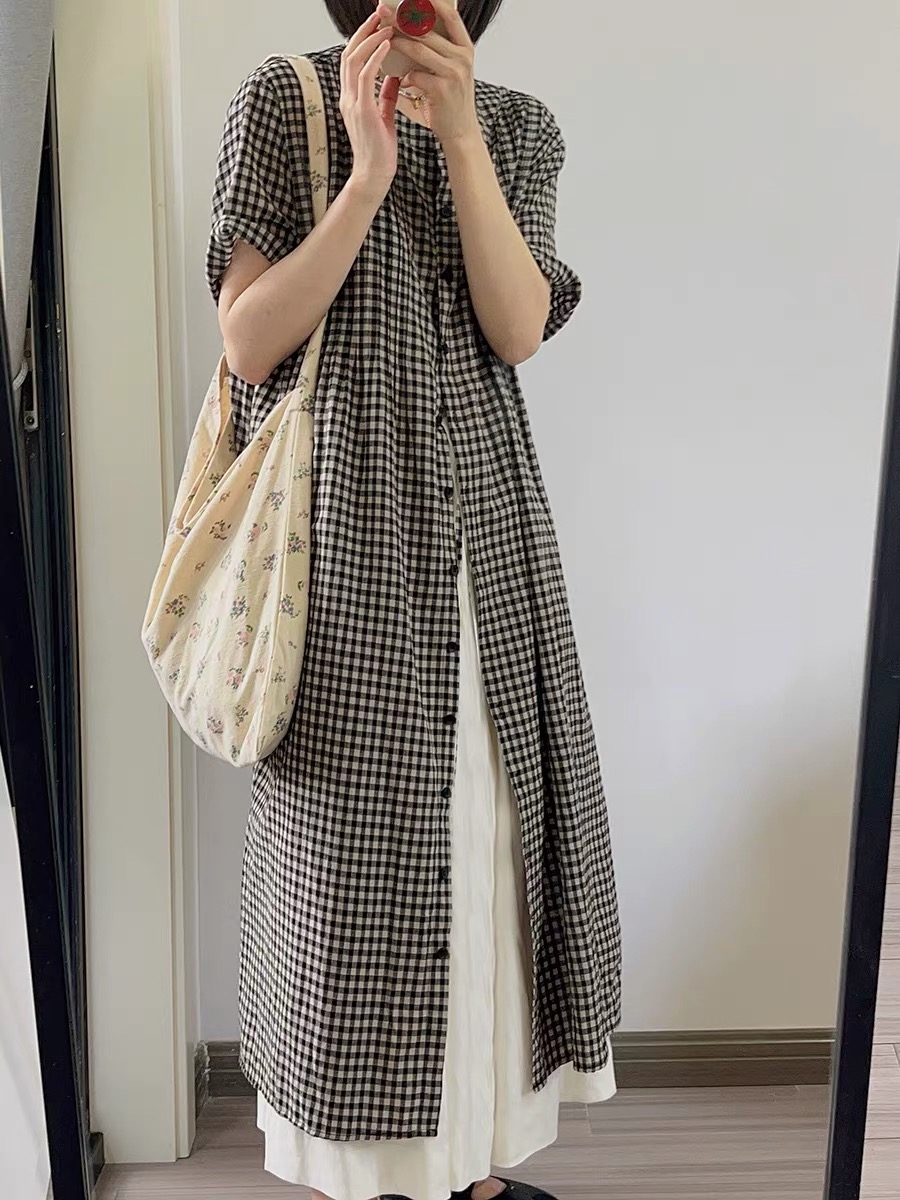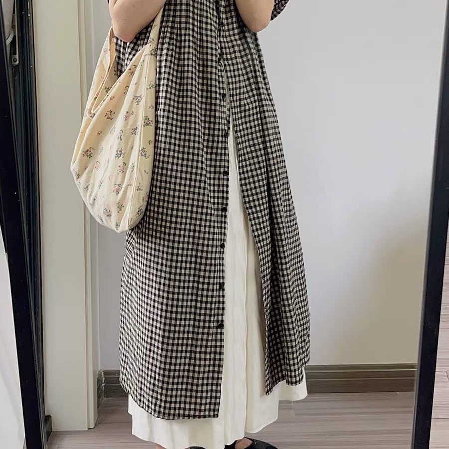 여름 드레스 새로운 빅 사이즈 여성 의류 일본식 느긋한 바람 격자 무늬 셔츠 드레스 미니멀리즘 맨위
