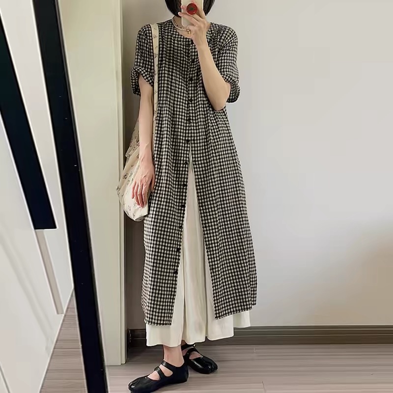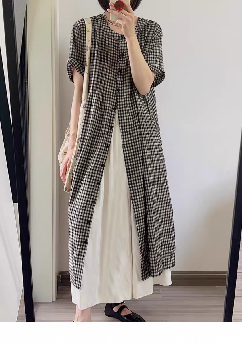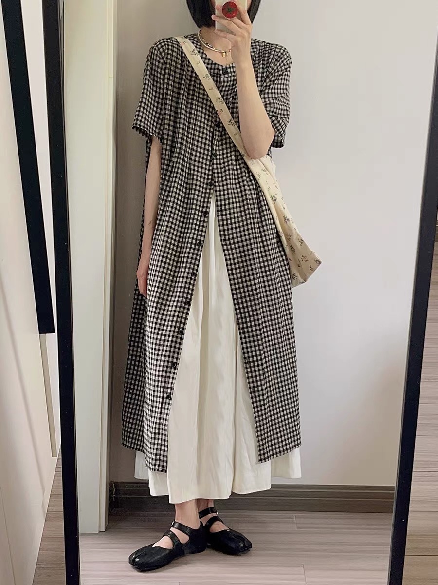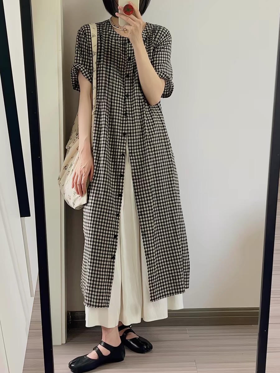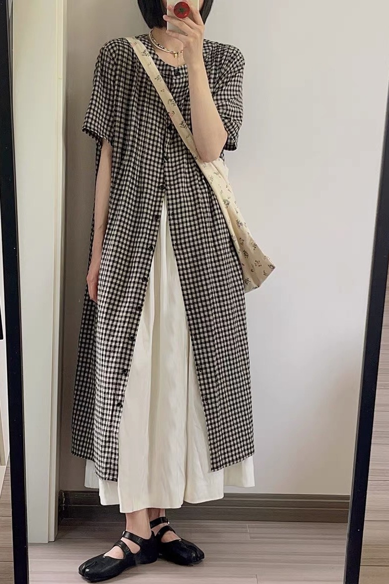 여름 드레스 새로운 빅 사이즈 여성 의류 일본식 느긋한 바람 격자 무늬 셔츠 드레스 미니멀리즘 맨위