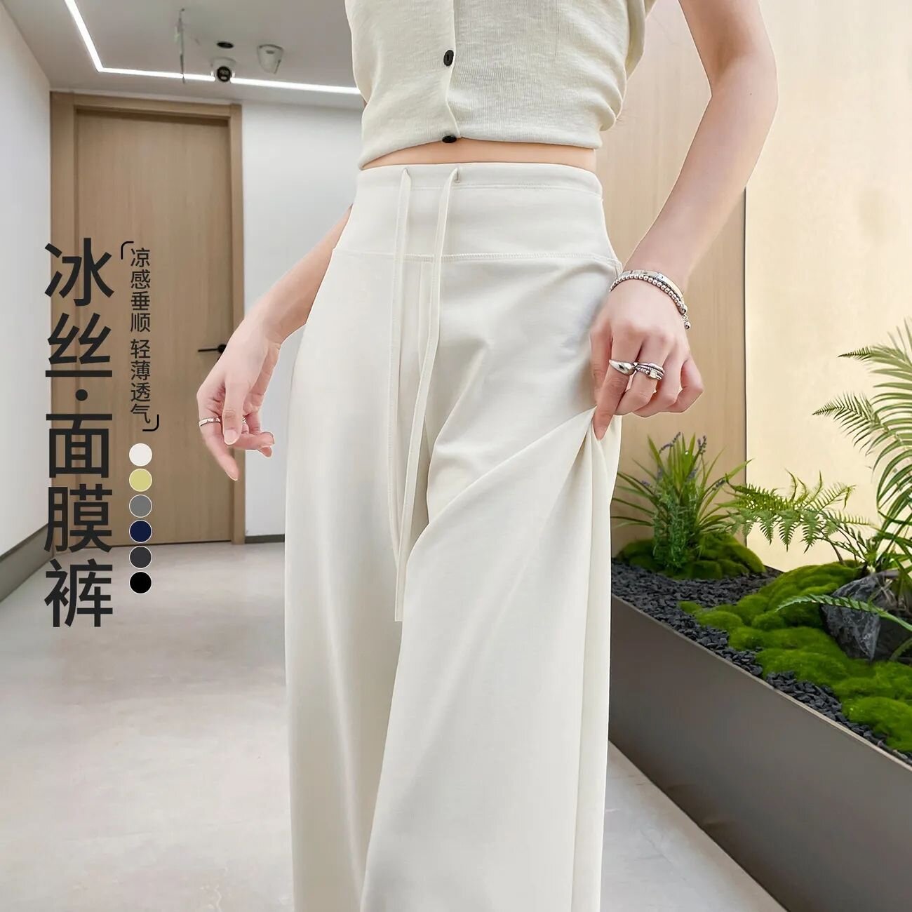 화이트 바지 아이들 여름 얇은 스타일 와이드 레그 팬츠 도루 센스 얼음 실크 차가운 바지 캐주얼 스트레이트 운동 웨이 바지 여성 작은 키