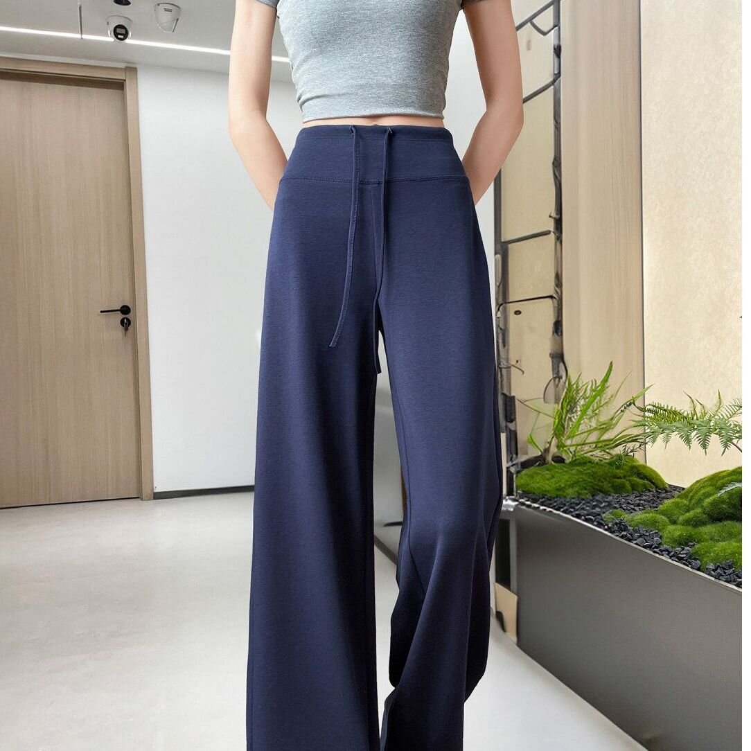 실사 2025 가을 패션 고급 스트라이프 와이드 레깅스 바지 폭발 허리밴드 슬림해 보이는 디스플레이 높음 바닥 청소 캐주얼 바지