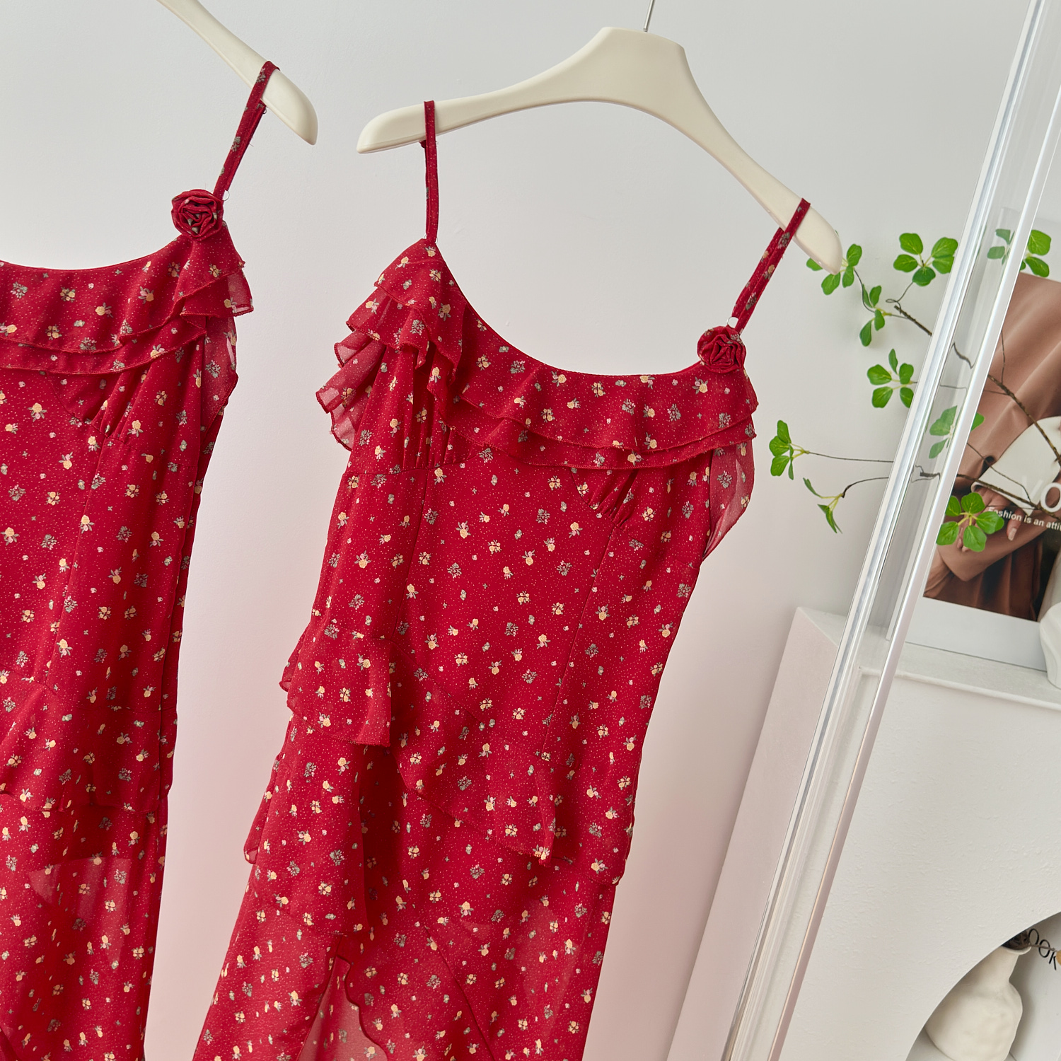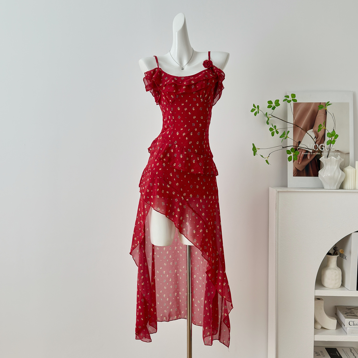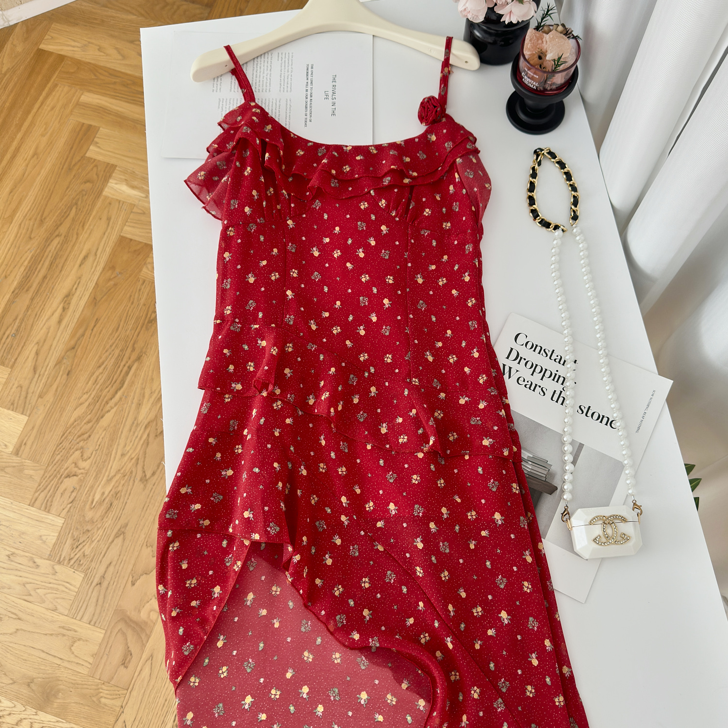 프랑스식 아름다운 프릴 꽃무늬 슬립 여성 드레스 여름 해변가 휴가 품격 몸매 가꾸기 타이트 스커트 길다 치마