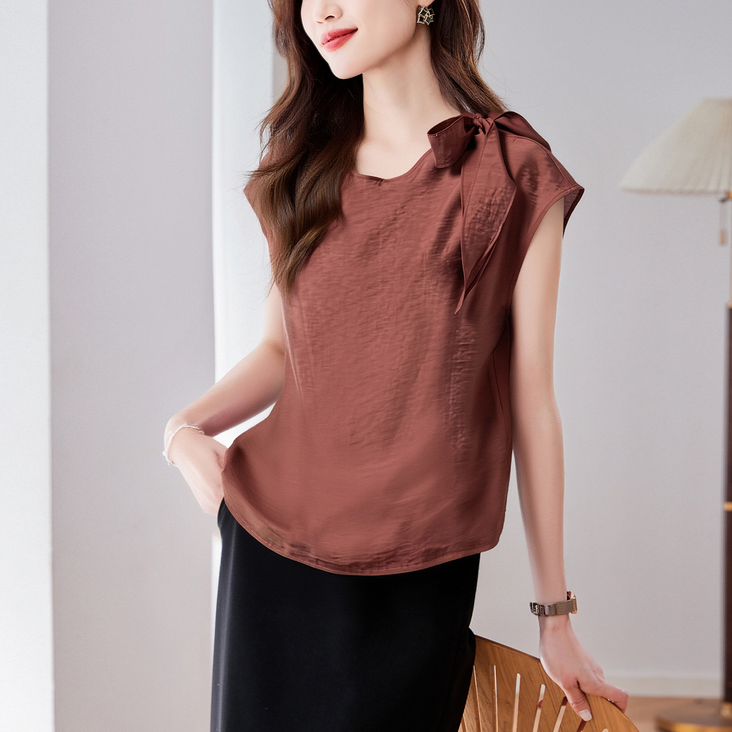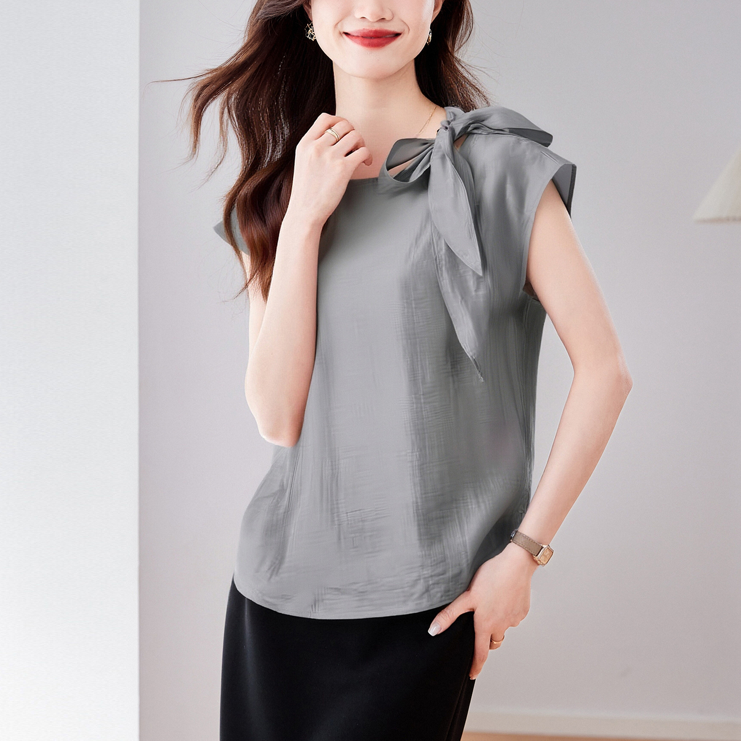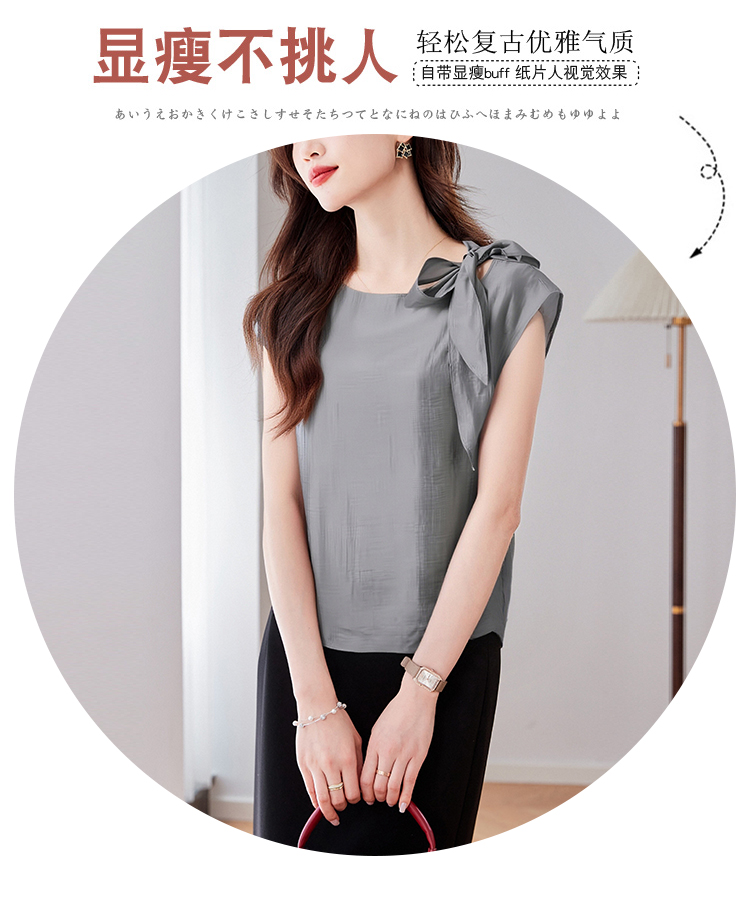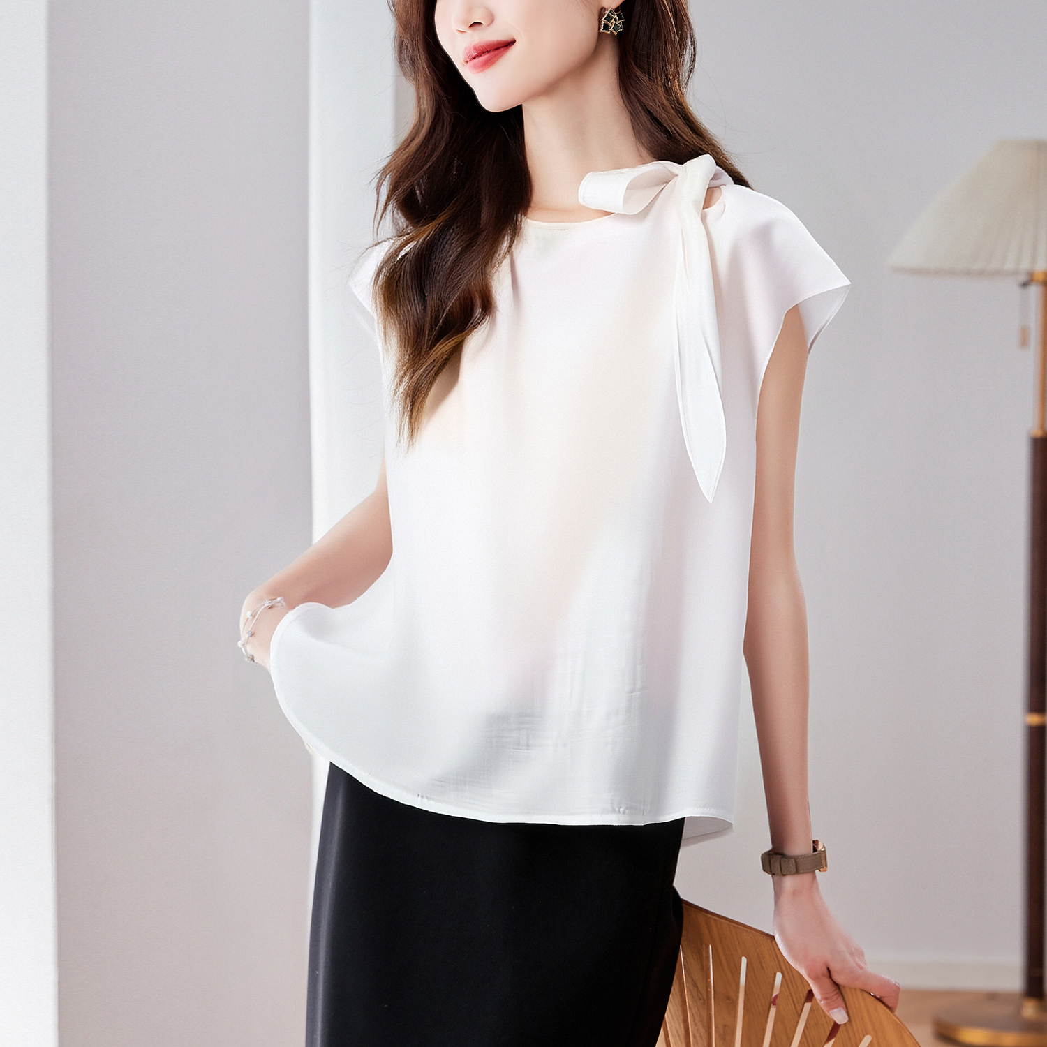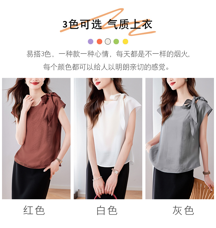 실사 2026 여름 새로운 쉬폰 블라우스 품격 우아함 슬림해 보이는 Chic 디자인 센스 네클라인 레이스업 맨위 여성