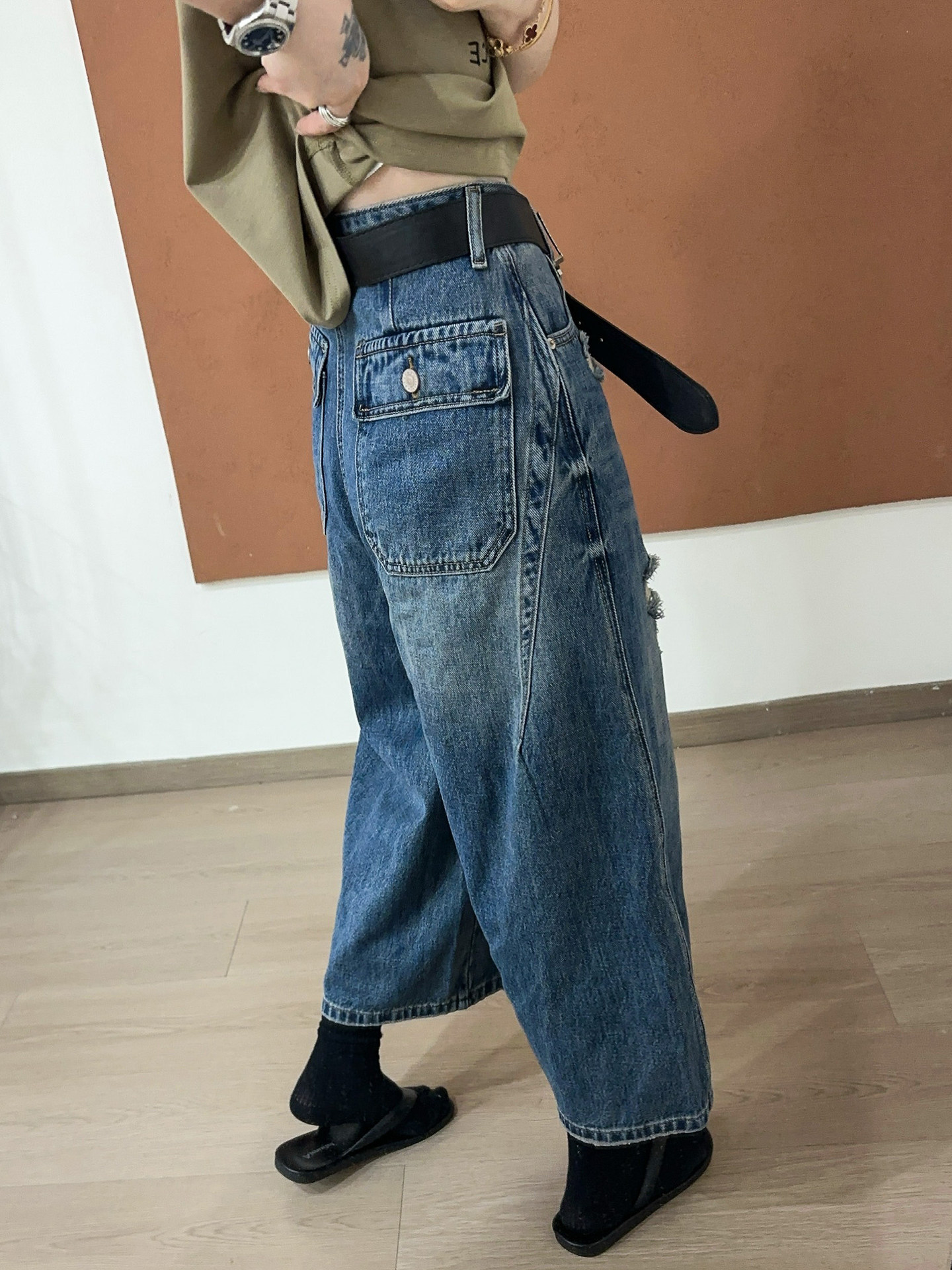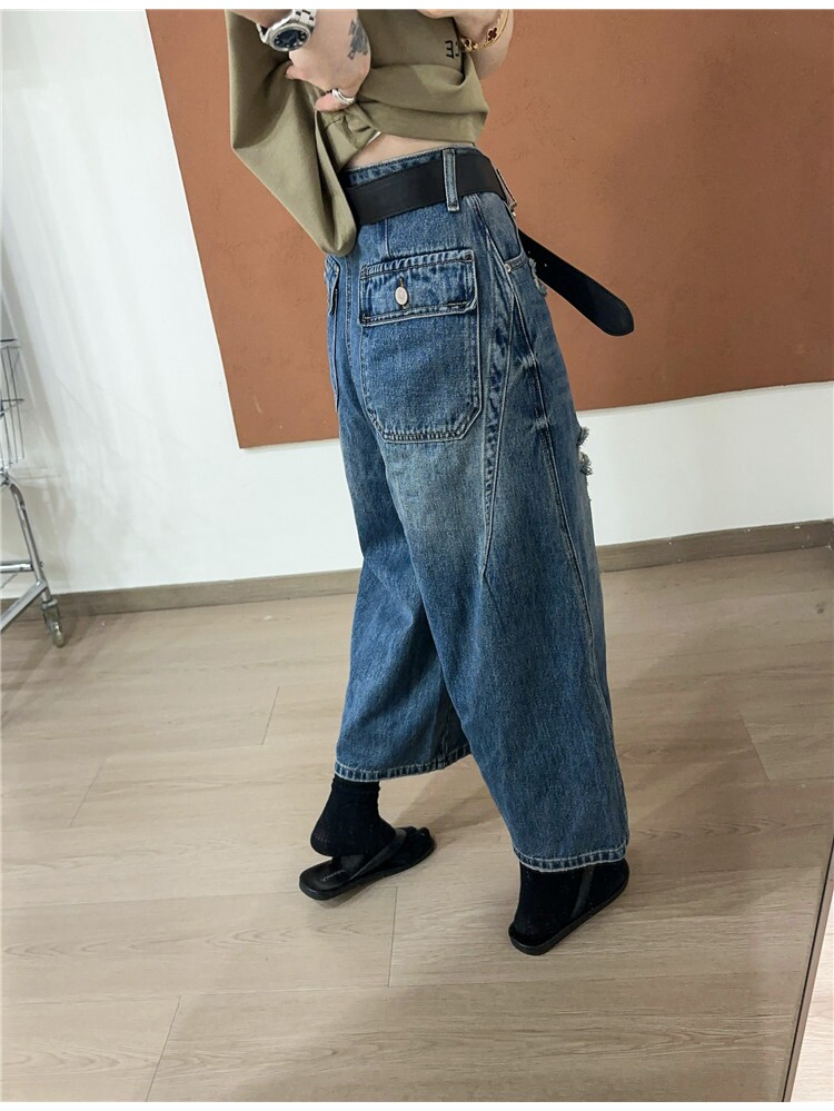 素心 블루 youmo 2026 여름 드레스 레트로 마 오래된 착용 찢어진 부분 캐주얼 8 점 와이드 레그 팬츠 청바지 여성