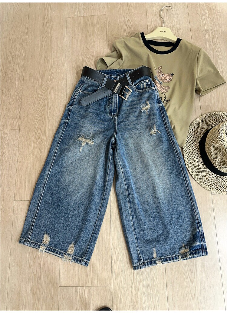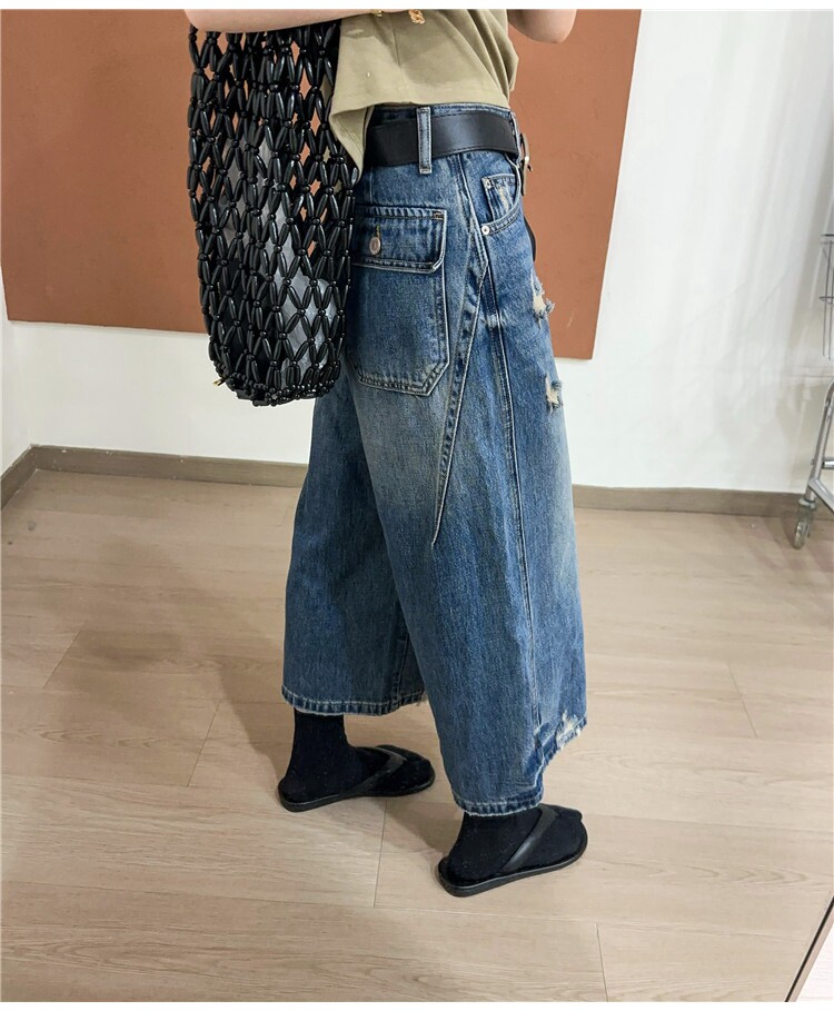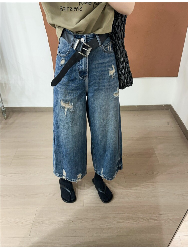 Annan 여름 새로운 개성 루즈핏 슬림해 보이는 와이드 레깅스 바지 작은 키 하이웨이스트 8 점 찢어진 부분 청바지