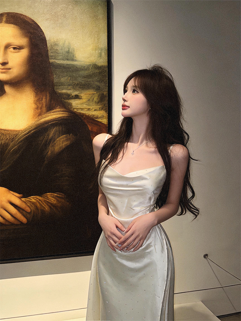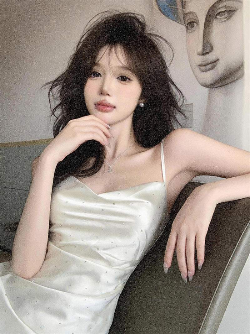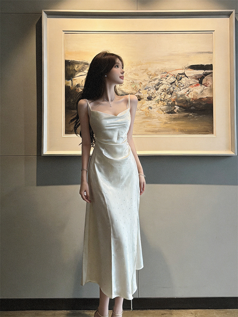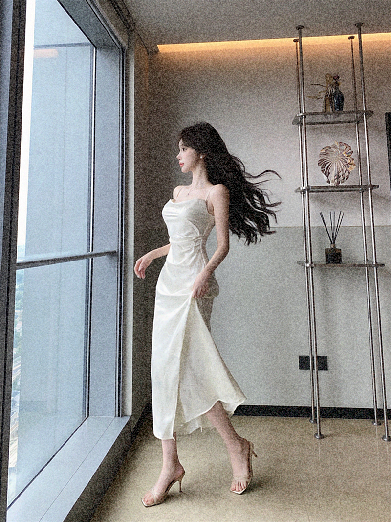 실사 프랑스식 섹시함 새틴 아세트산 슬립 디자인 센스 주름 허리 수축 슬림해 보이는 드레스