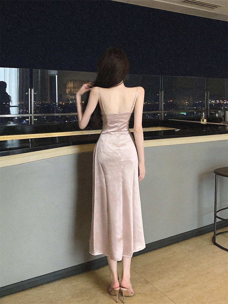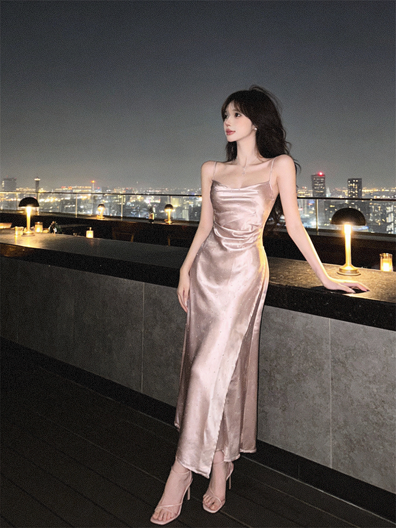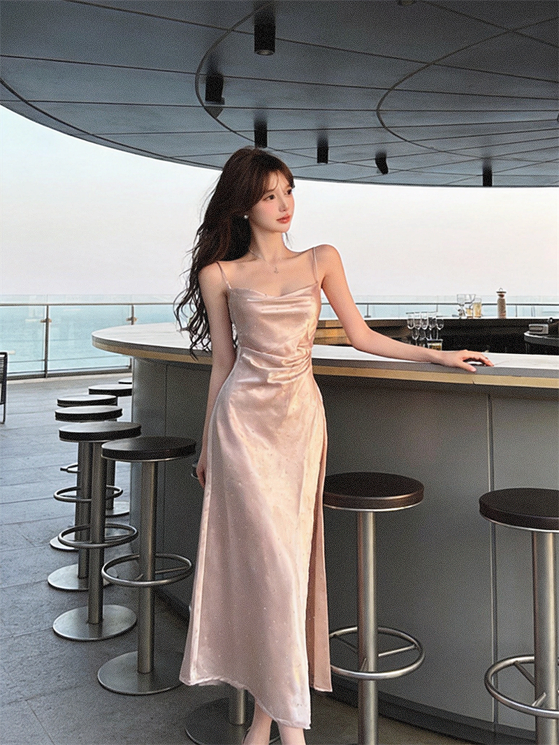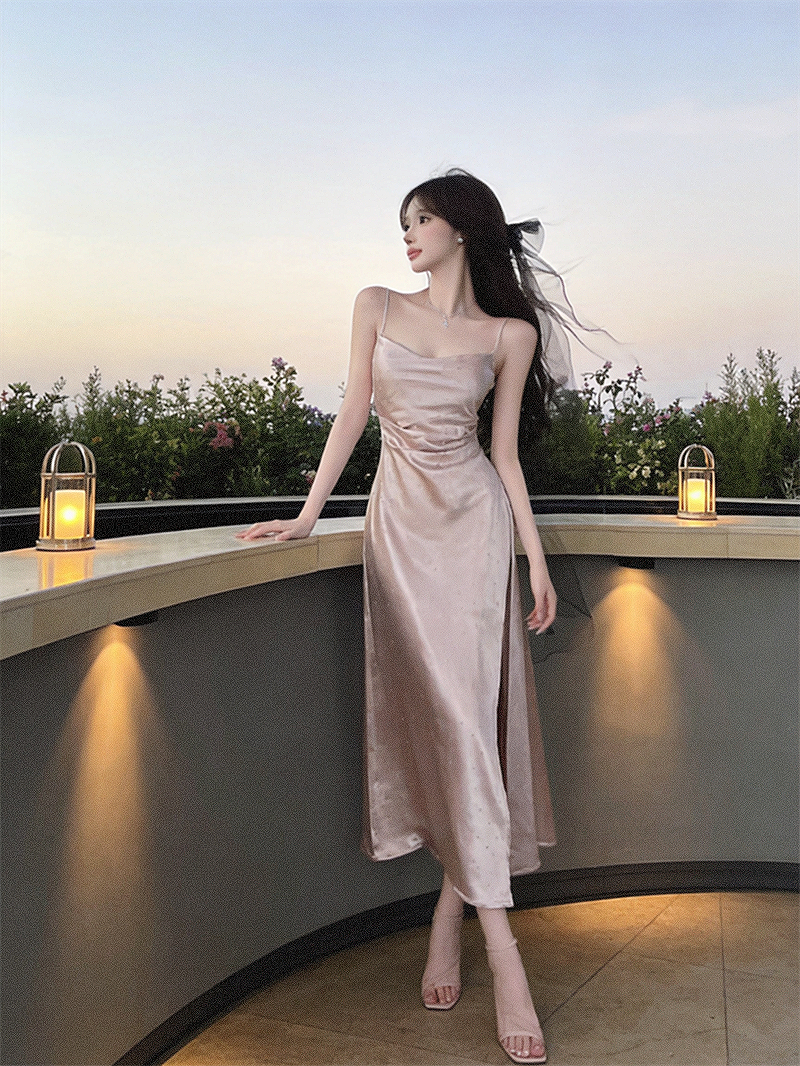 실사 프랑스식 섹시함 새틴 아세트산 슬립 디자인 센스 주름 허리 수축 슬림해 보이는 드레스