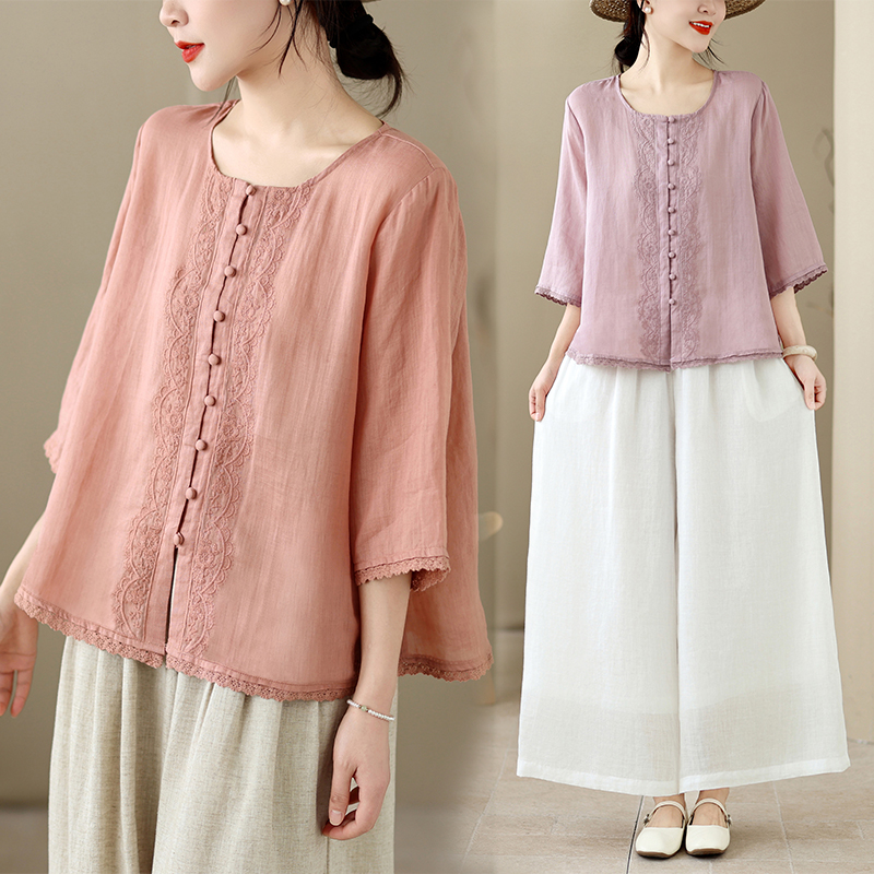 실사 레트로 품격 패치워크 레이스 레이스 여성 셔츠 여름 새로운 루즈핏 얇은 스타일 7부 소매 맨위
