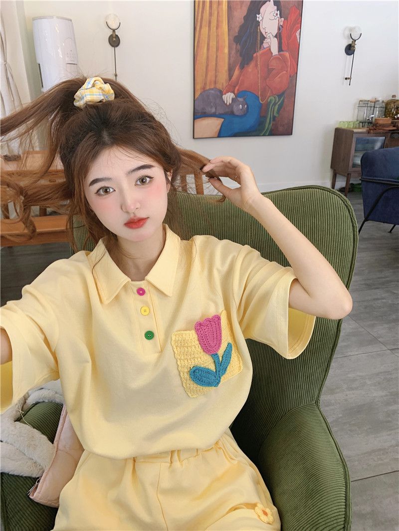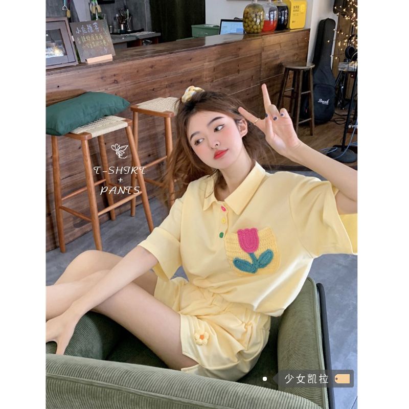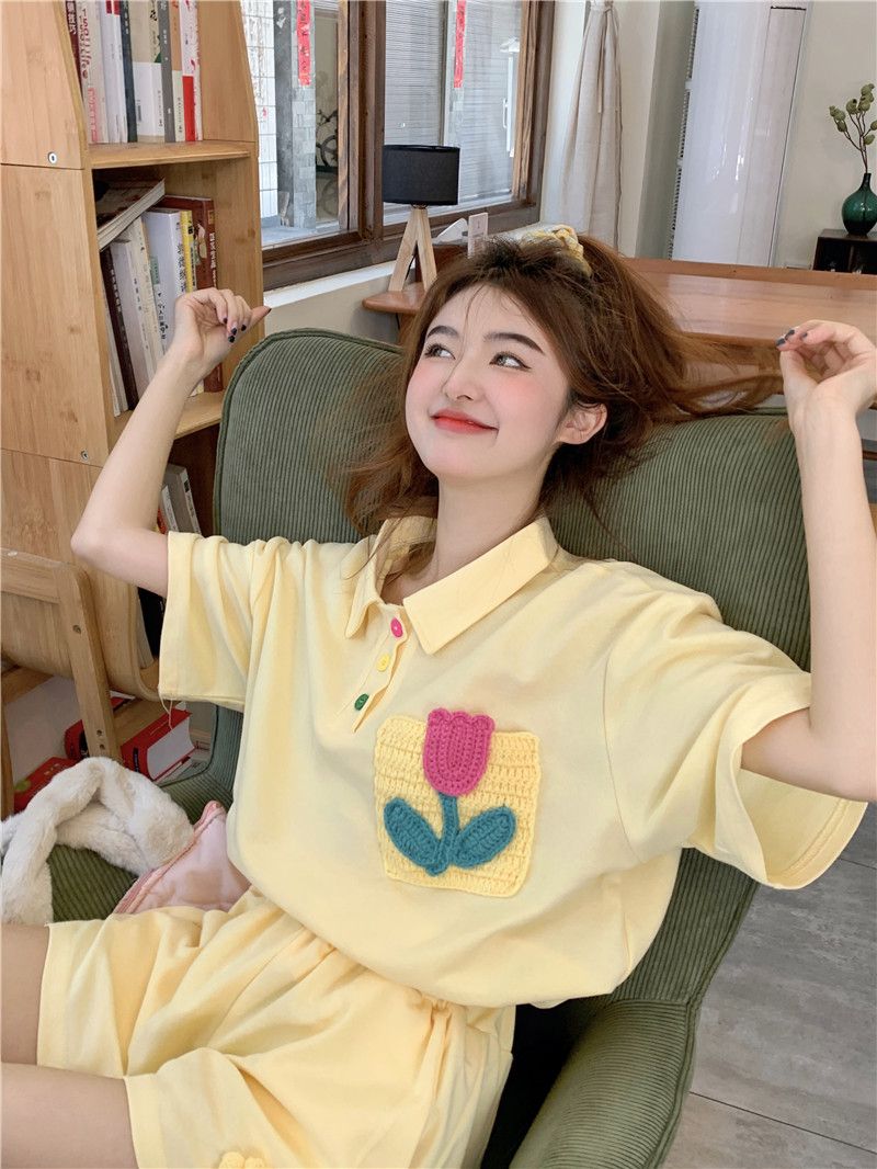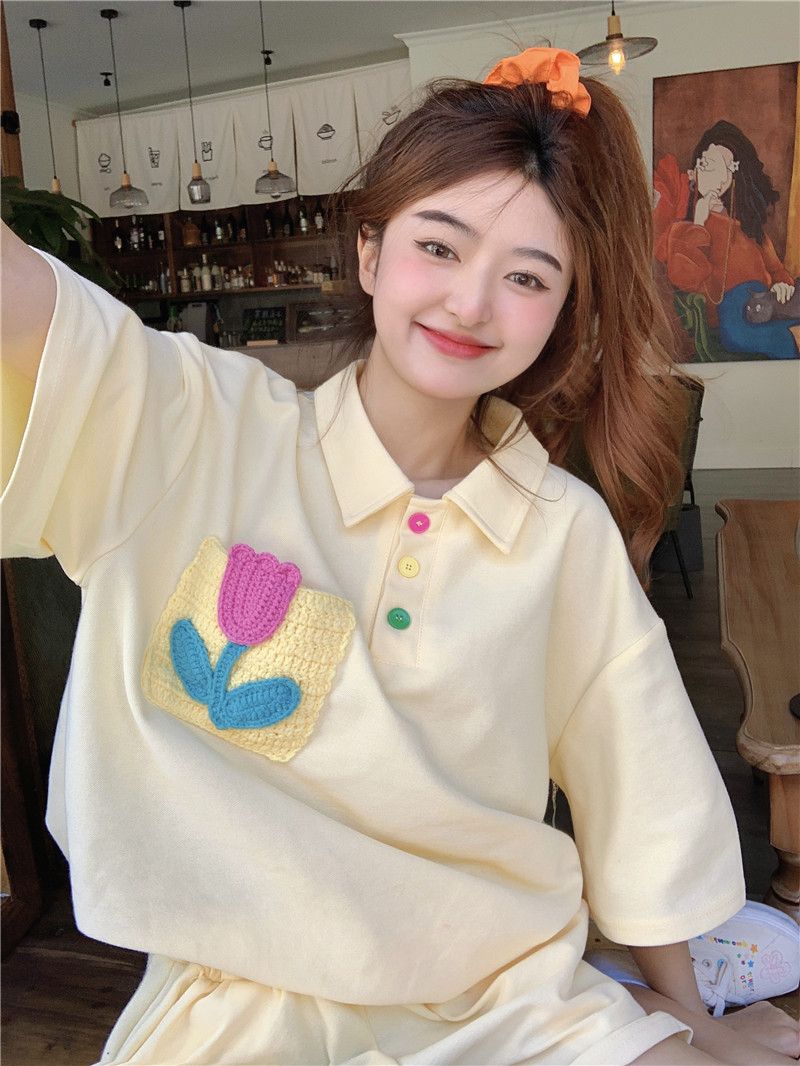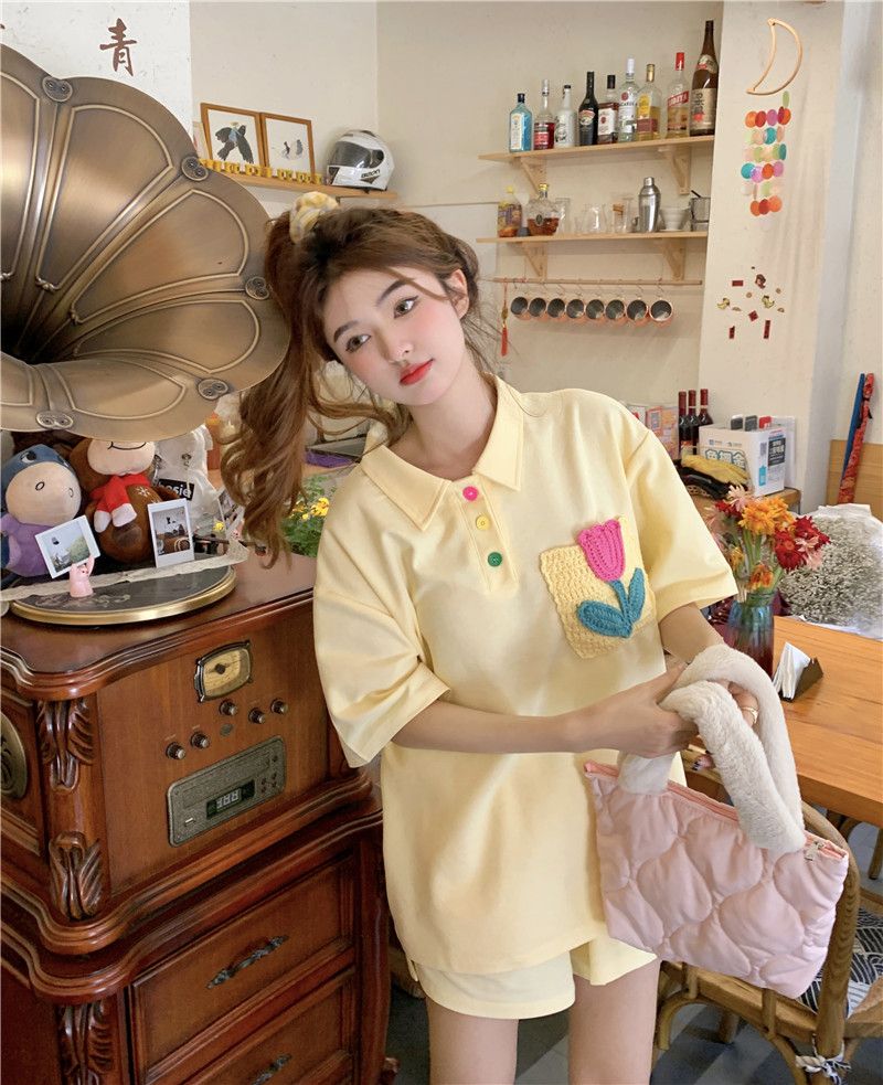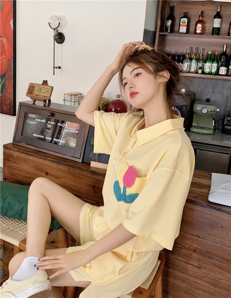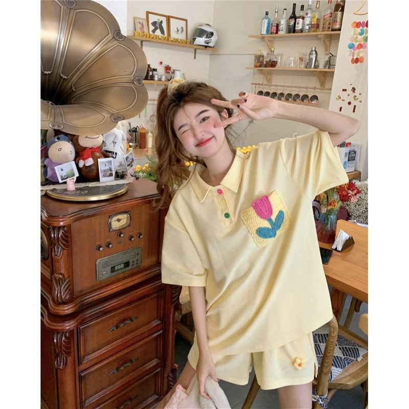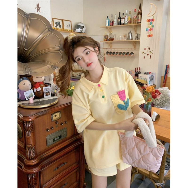 원본 높은 품질 솜씨 학원 스타일 루즈핏 꽃 자수 POLO 셔츠 폴로 칼라 반팔 반바지 세트 여성 여름