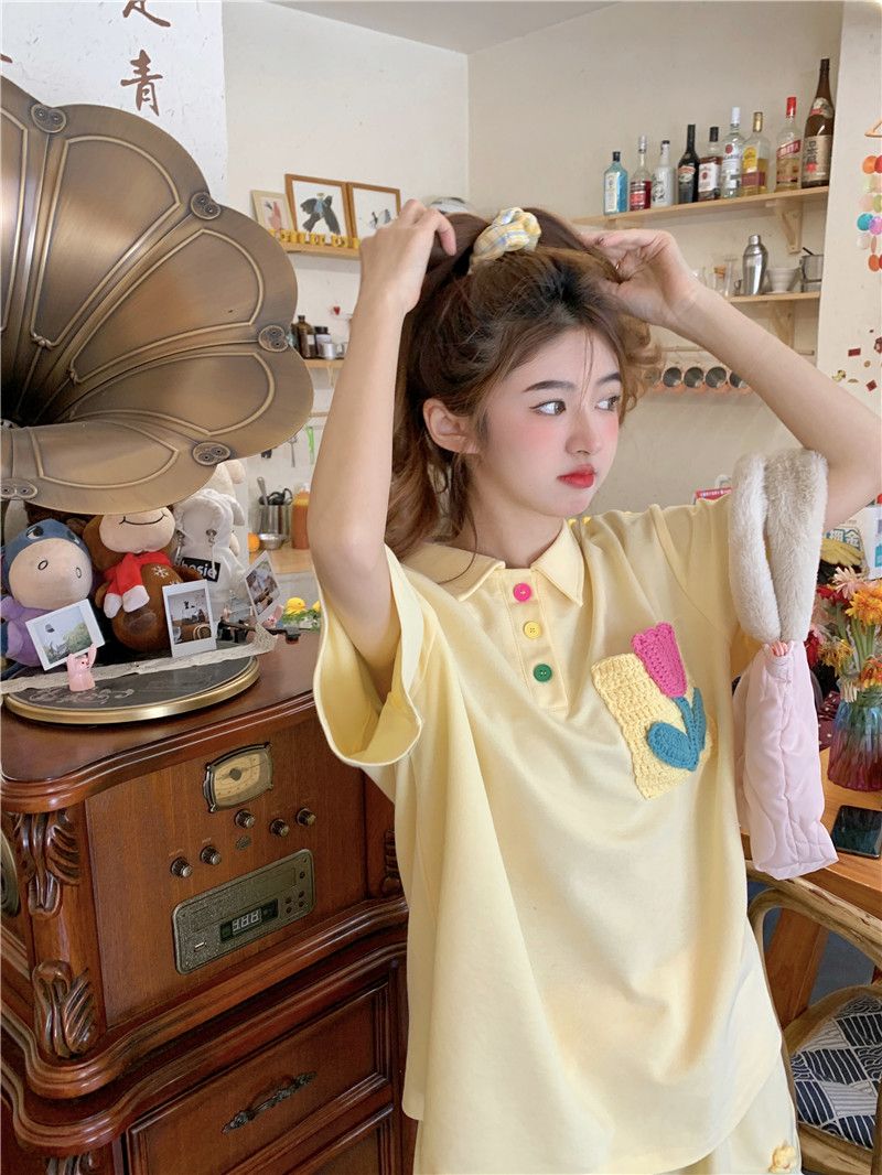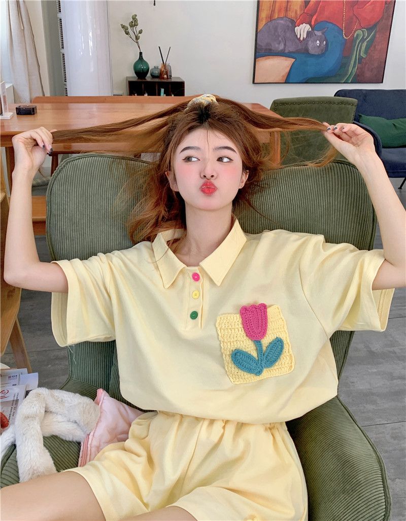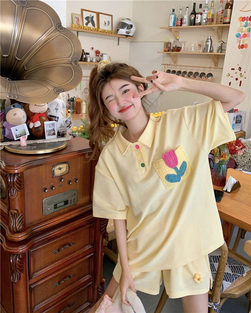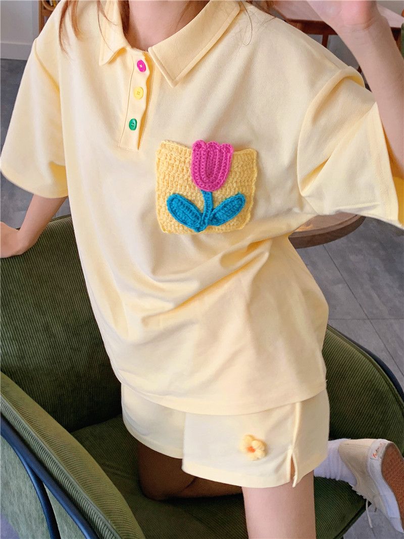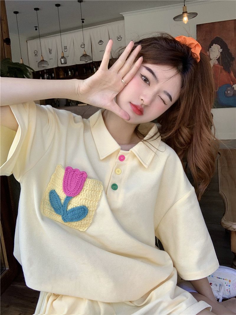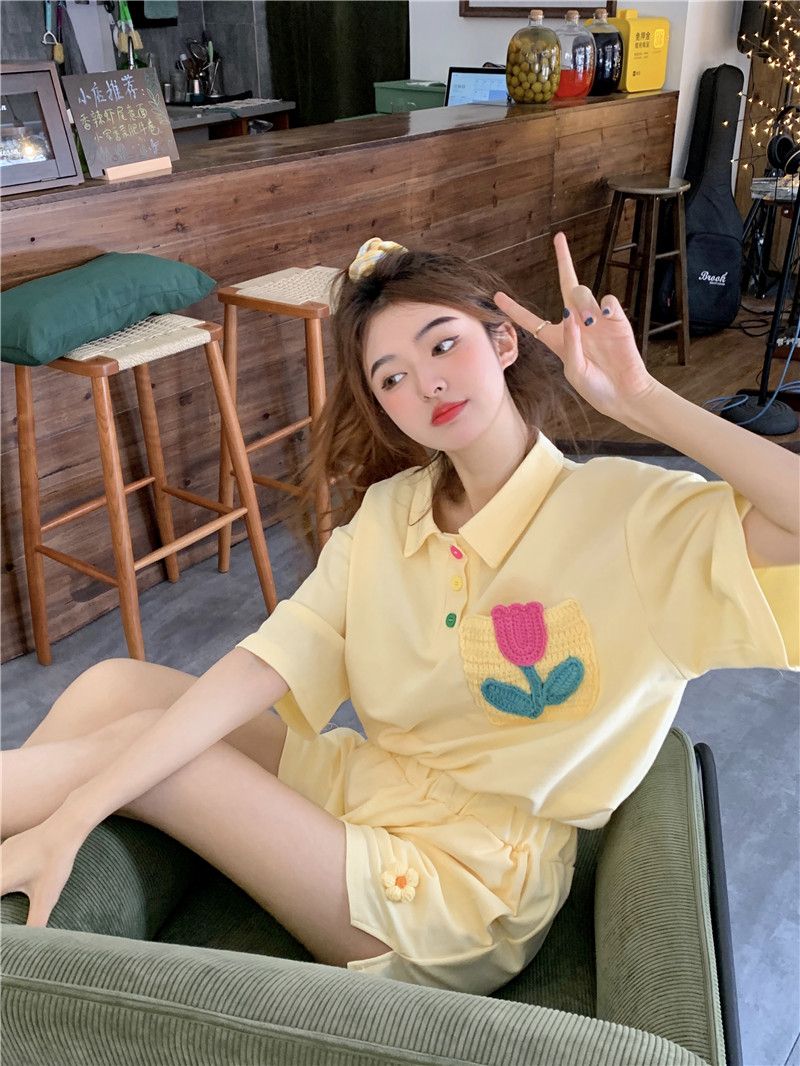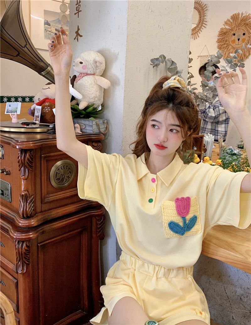원본 높은 품질 솜씨 학원 스타일 루즈핏 꽃 자수 POLO 셔츠 폴로 칼라 반팔 반바지 세트 여성 여름