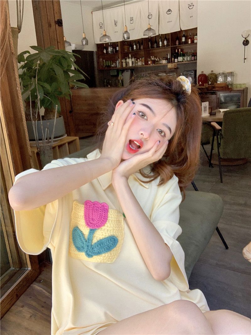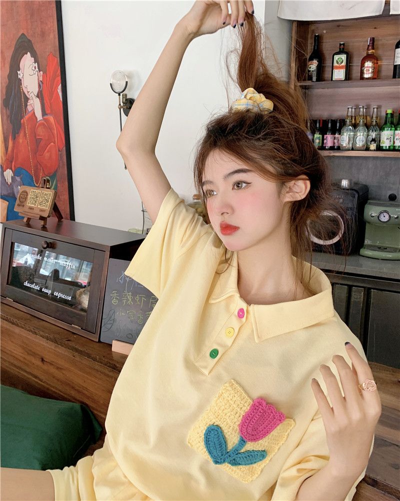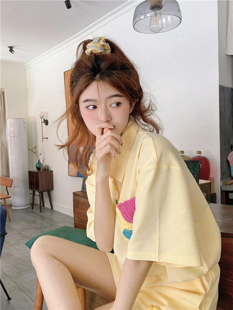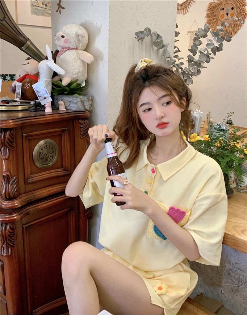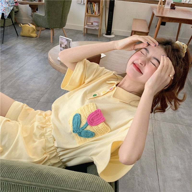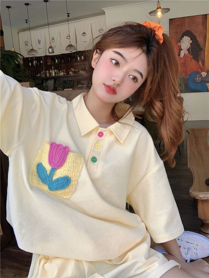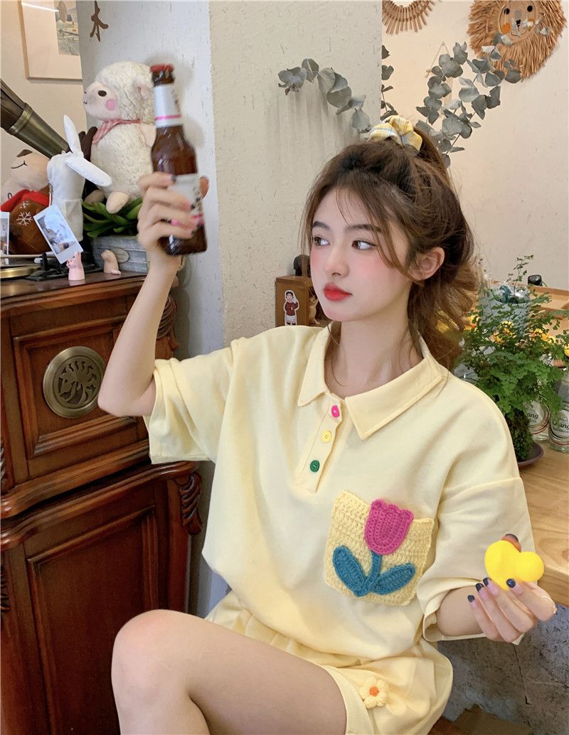 원본 높은 품질 솜씨 학원 스타일 루즈핏 꽃 자수 POLO 셔츠 폴로 칼라 반팔 반바지 세트 여성 여름