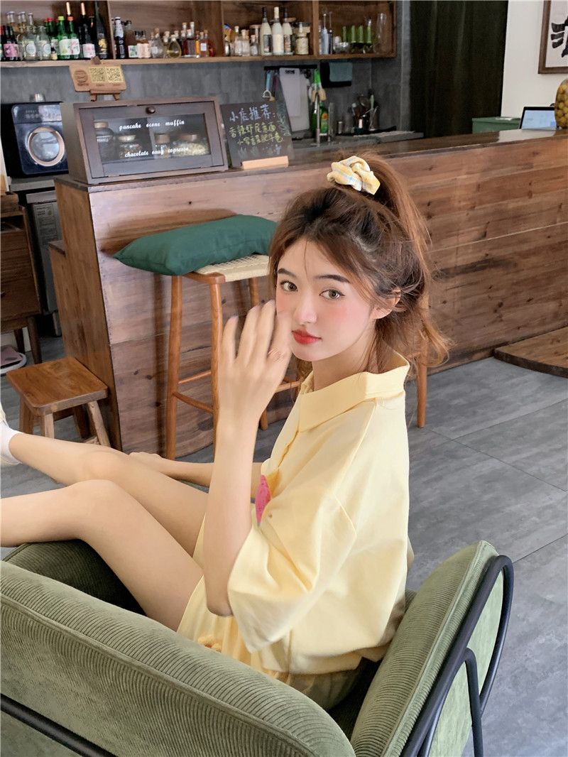 원본 높은 품질 솜씨 학원 스타일 루즈핏 POLO 셔츠 폴로 칼라 반팔 티셔츠 넓은 다리가 짧다. 바지 여성 투피스 세트 여름
